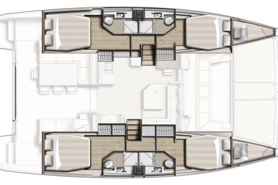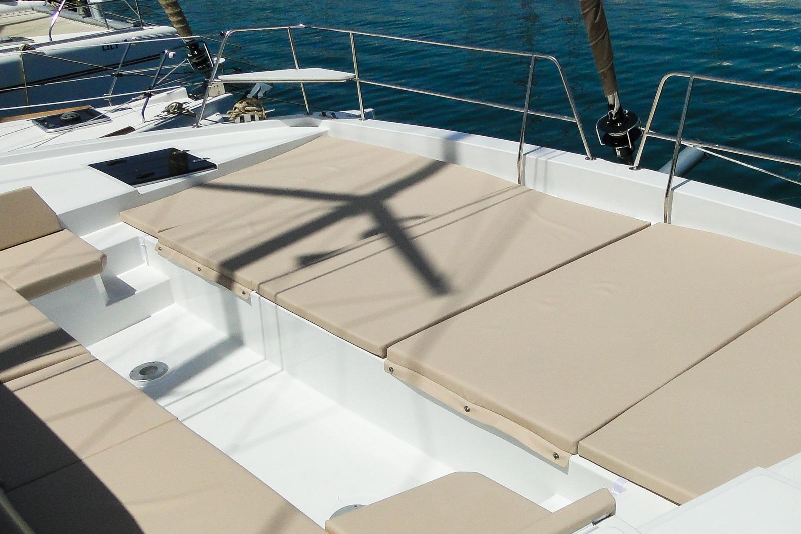 The yacht features four well-proportioned double cabins, each with its own ensuite electric head and separate shower. The saloon is light and airy with panoramic windows and excellent headroom, linking directly to the aft cockpit. The galley is positioned forward, allowing direct access to the forward cockpit and contributing to the yacht’s open, sociable feel.