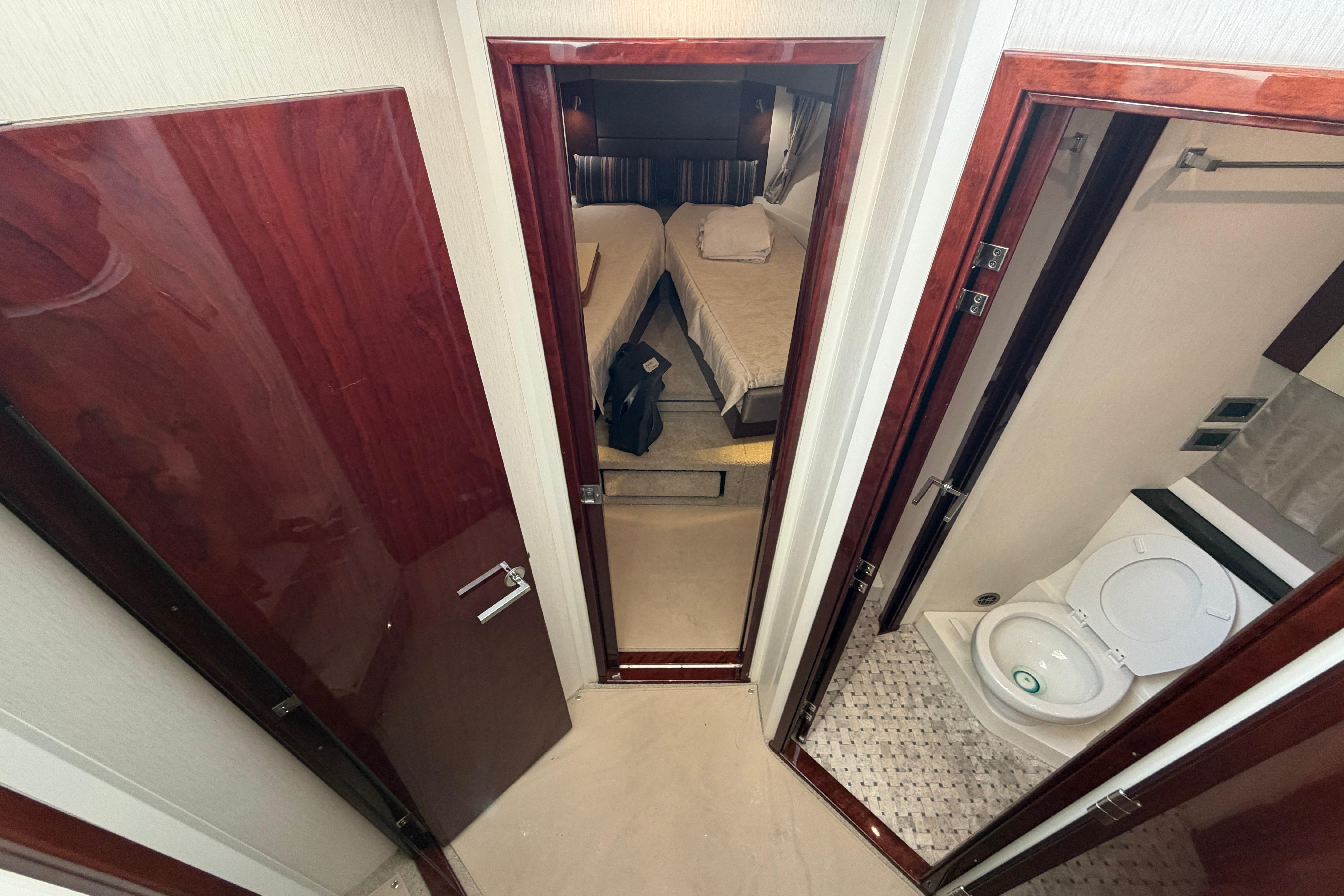 master aft with walkaround queen bed and a forward guest cabin