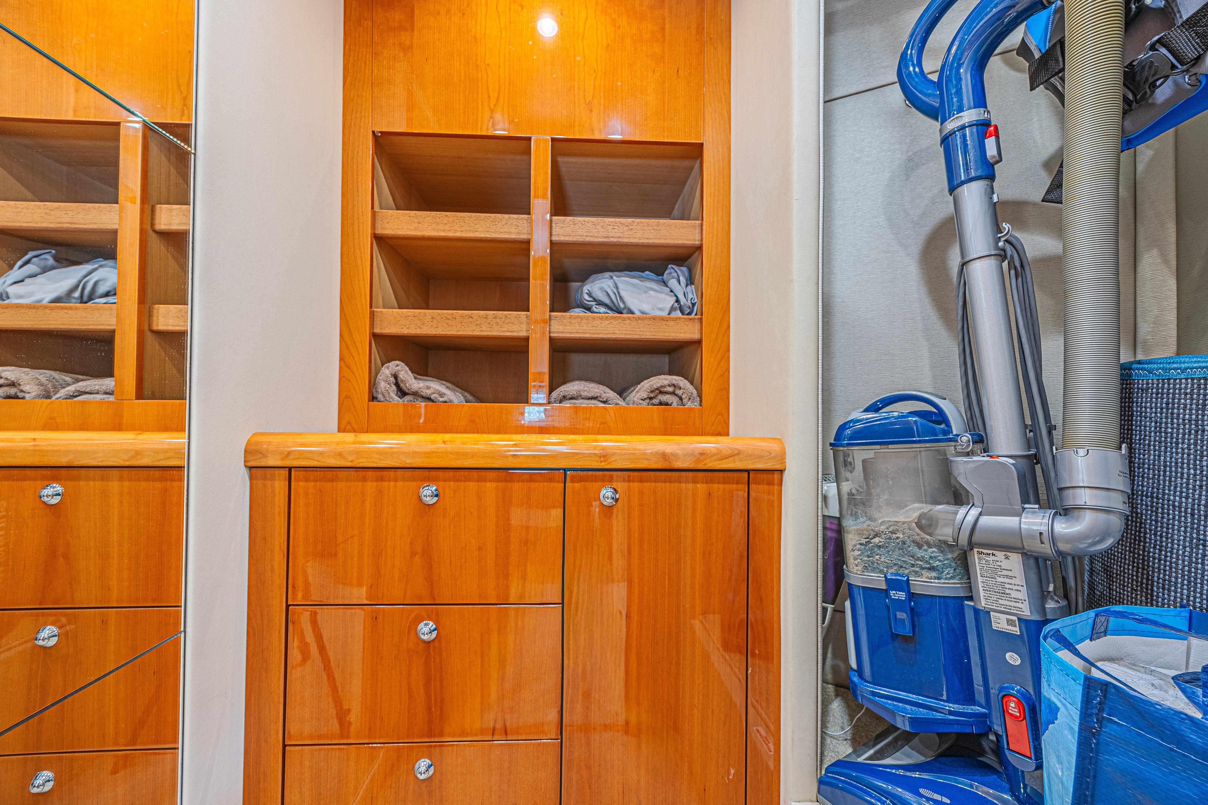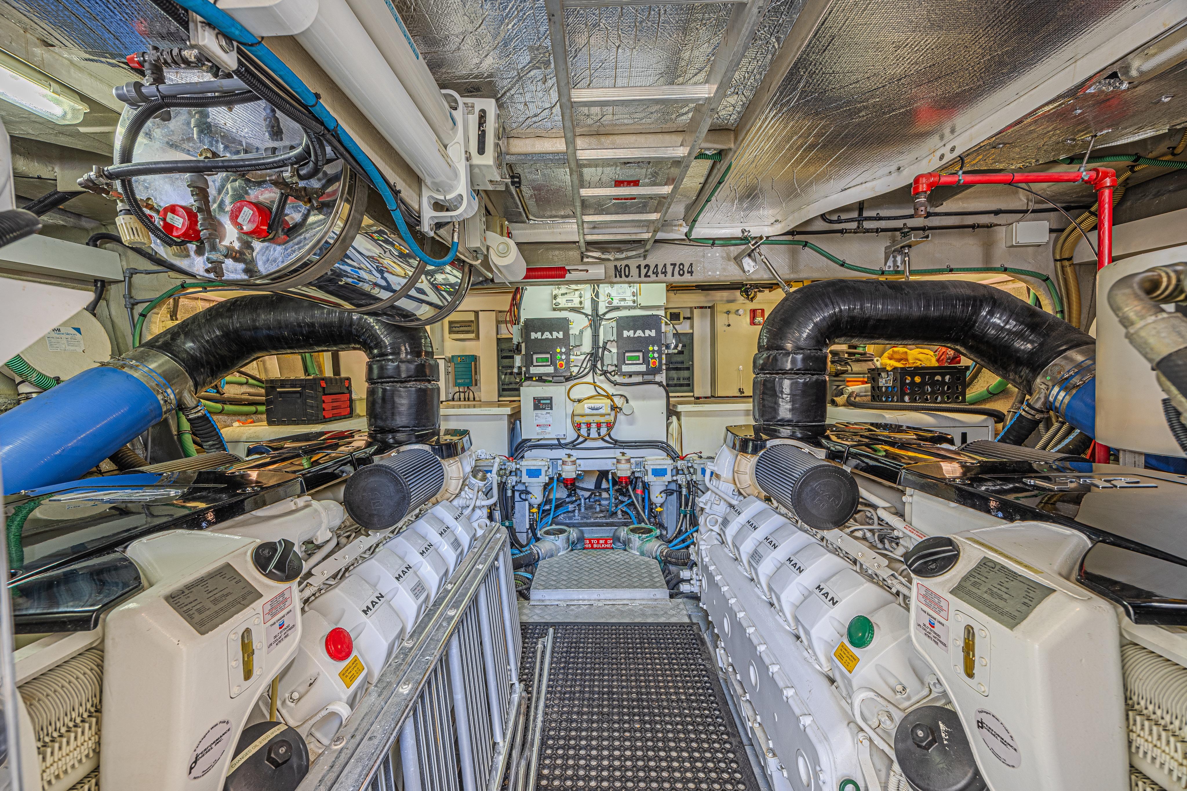 Powered by NEW 2016 MAN V12 engines, she delivers reliability with the peace of mind of a newer power package. You’ll find twin generators, including an upgraded 23kW unit with only 460 hours and the original 23kW with just 2,124 hours. A 60-gallon watermaker, oven in galley, 2 Perlick refrigerators, Separate Washer and Dryer, and everything else needed for an easy trip to the Bahamas.