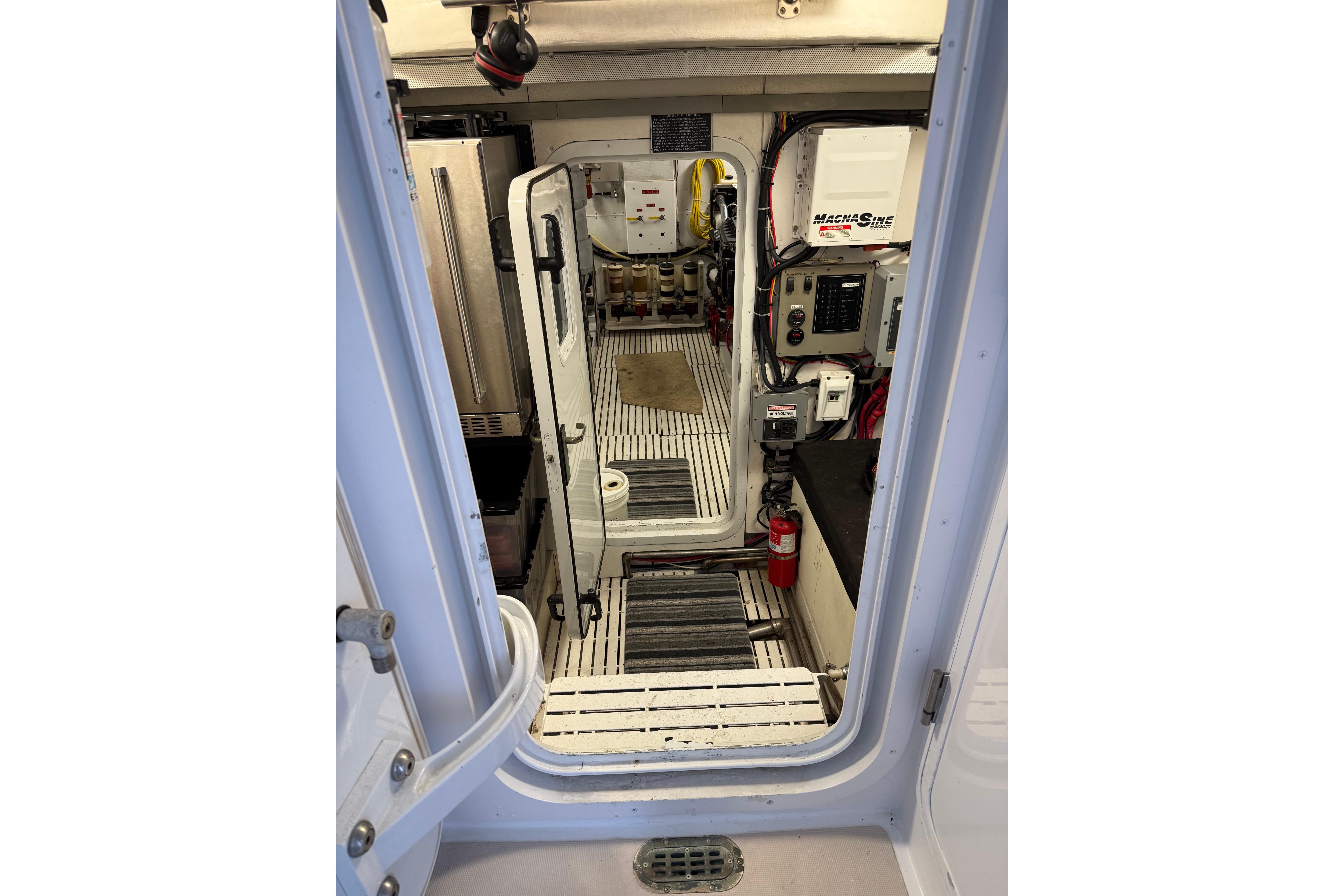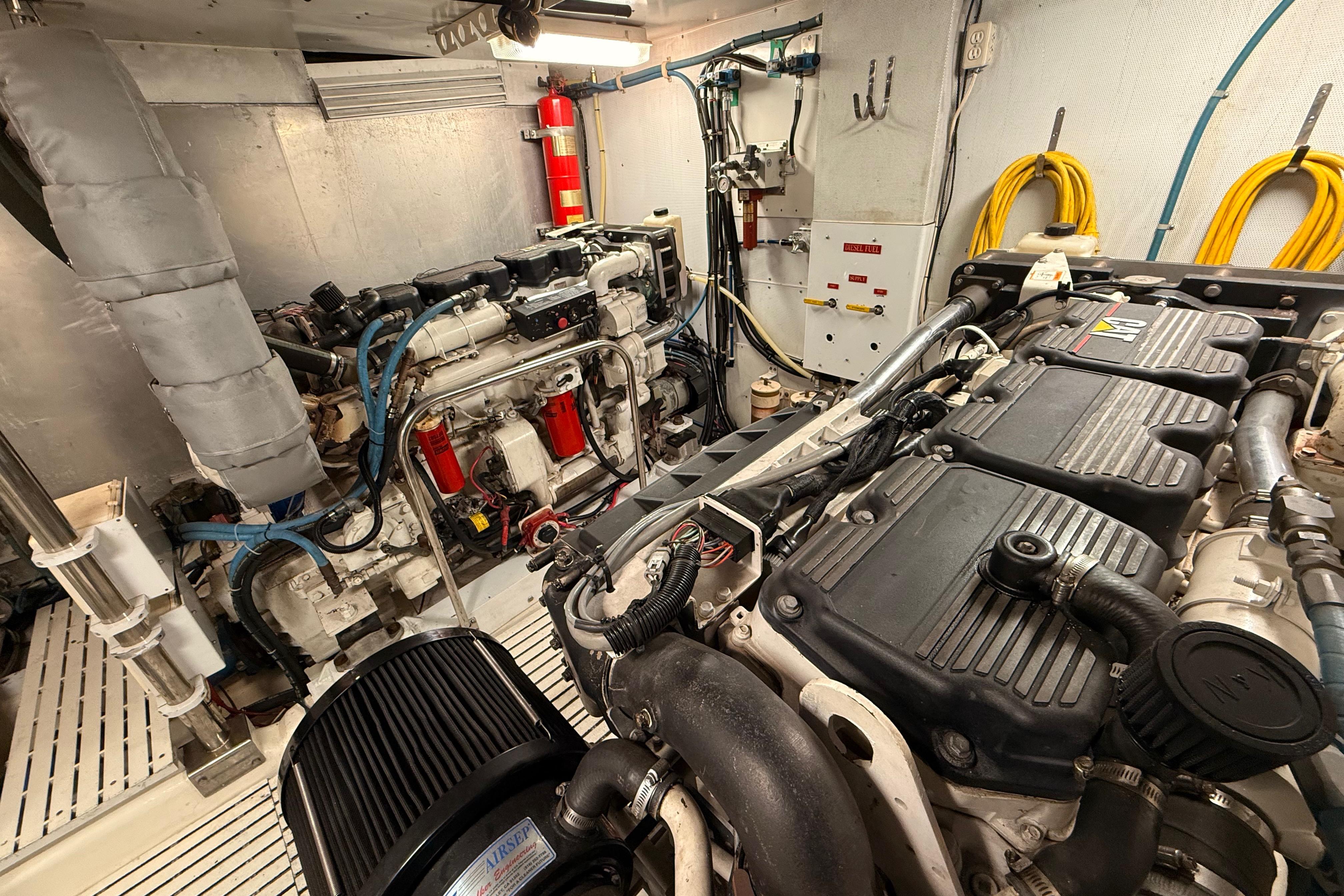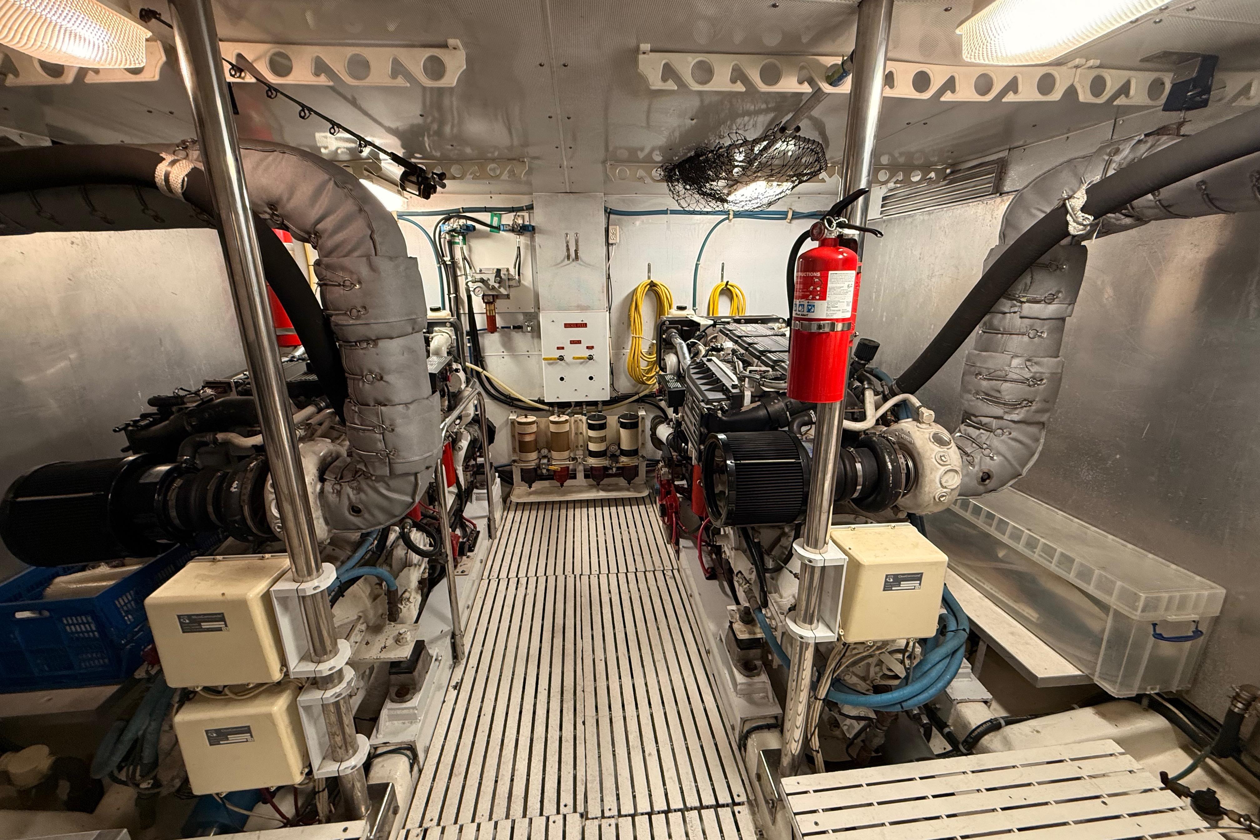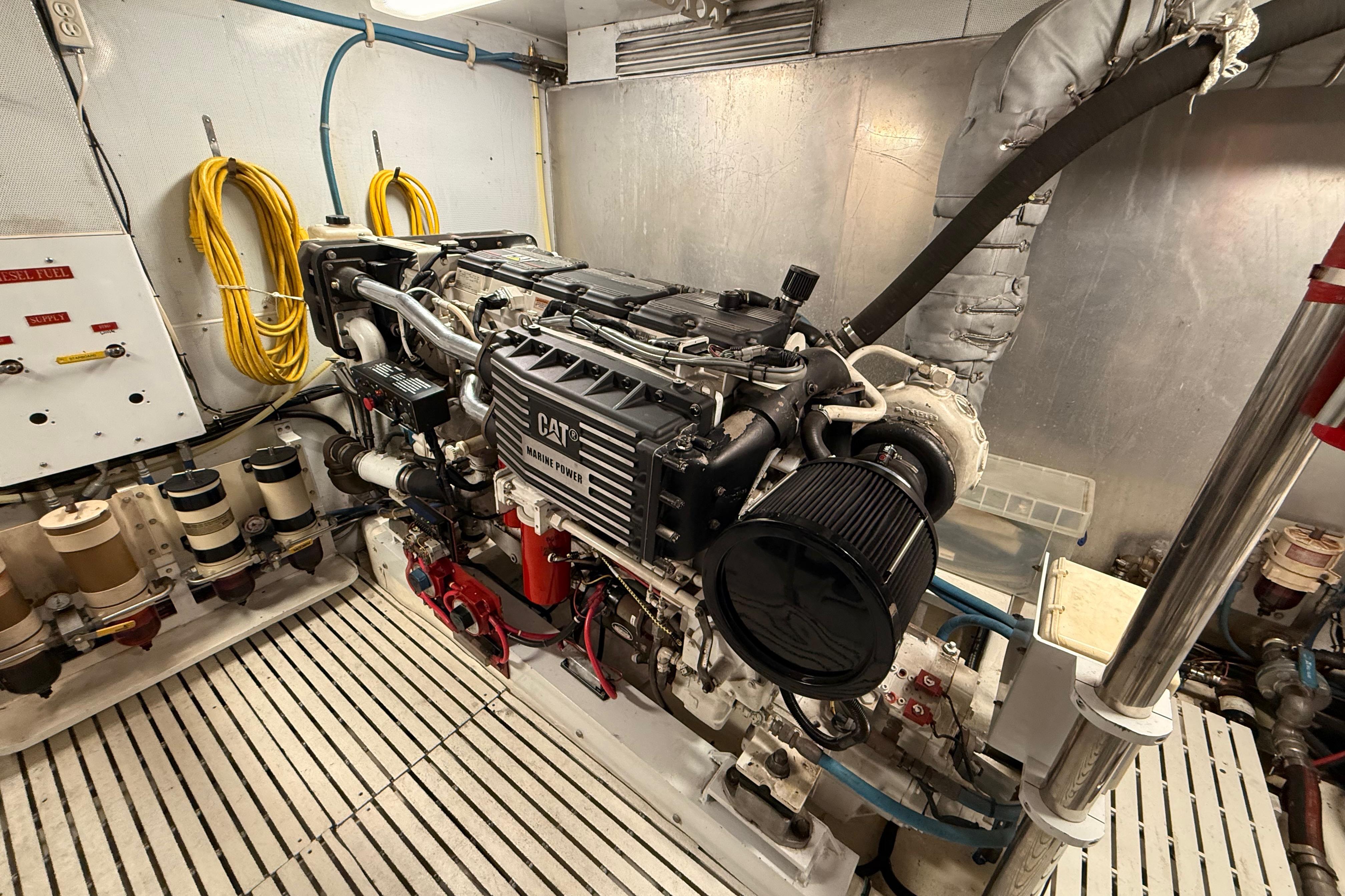 FULL WALK-IN STANDUP ENGINE ROOM WITH GREAT ACCESS AROUND THE TWIN 800HP 3406 CATERPILLER MAINS. WELL EQUIPPED MECHANICAL AREAS WITH 2 GENERATORS, 2 WATERMAKERS, NEW COMMERCIAL SIZED HOTWATER DIESEL FURNACE SYSTEM AND MANY MORE GREAT SYSTEMS.