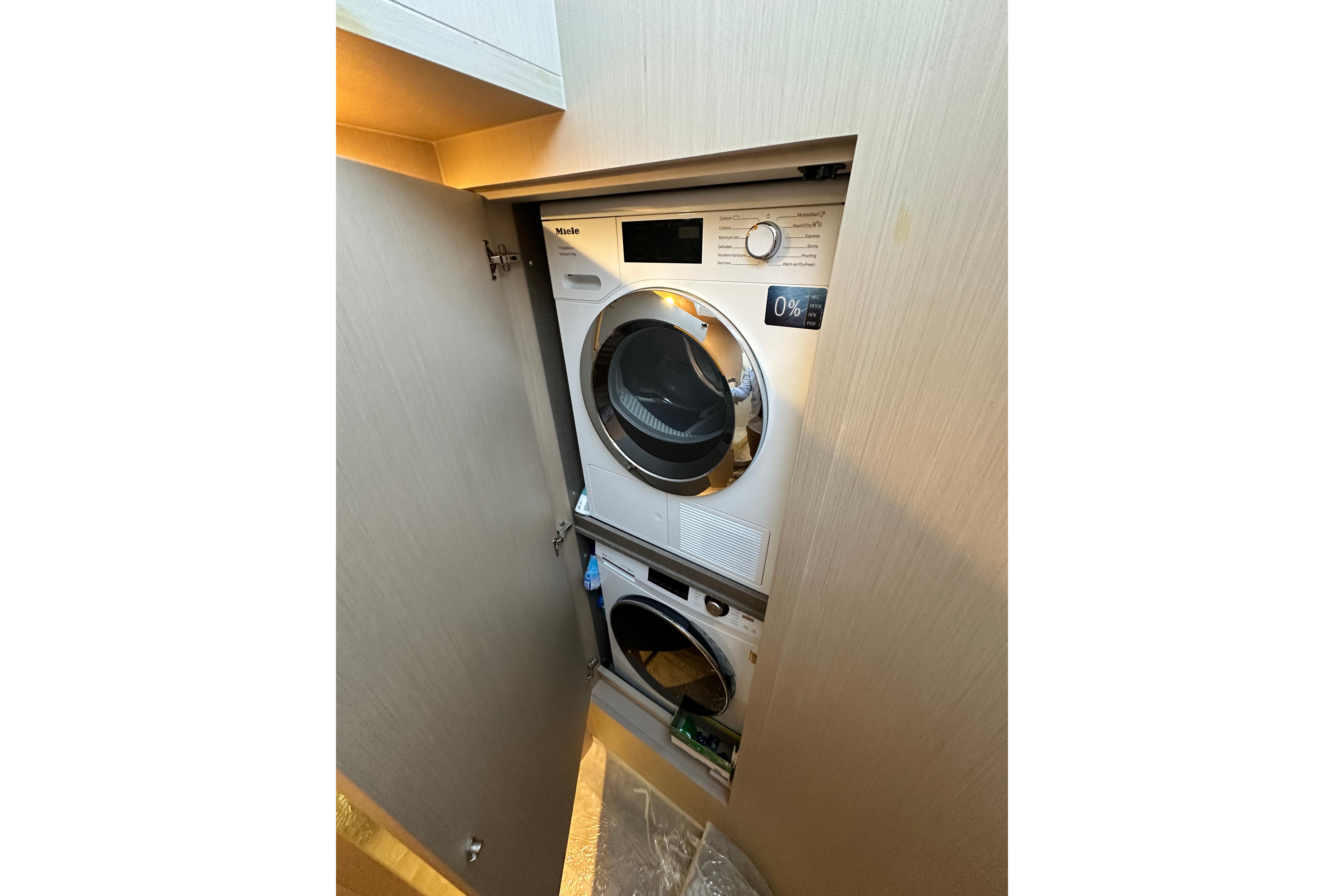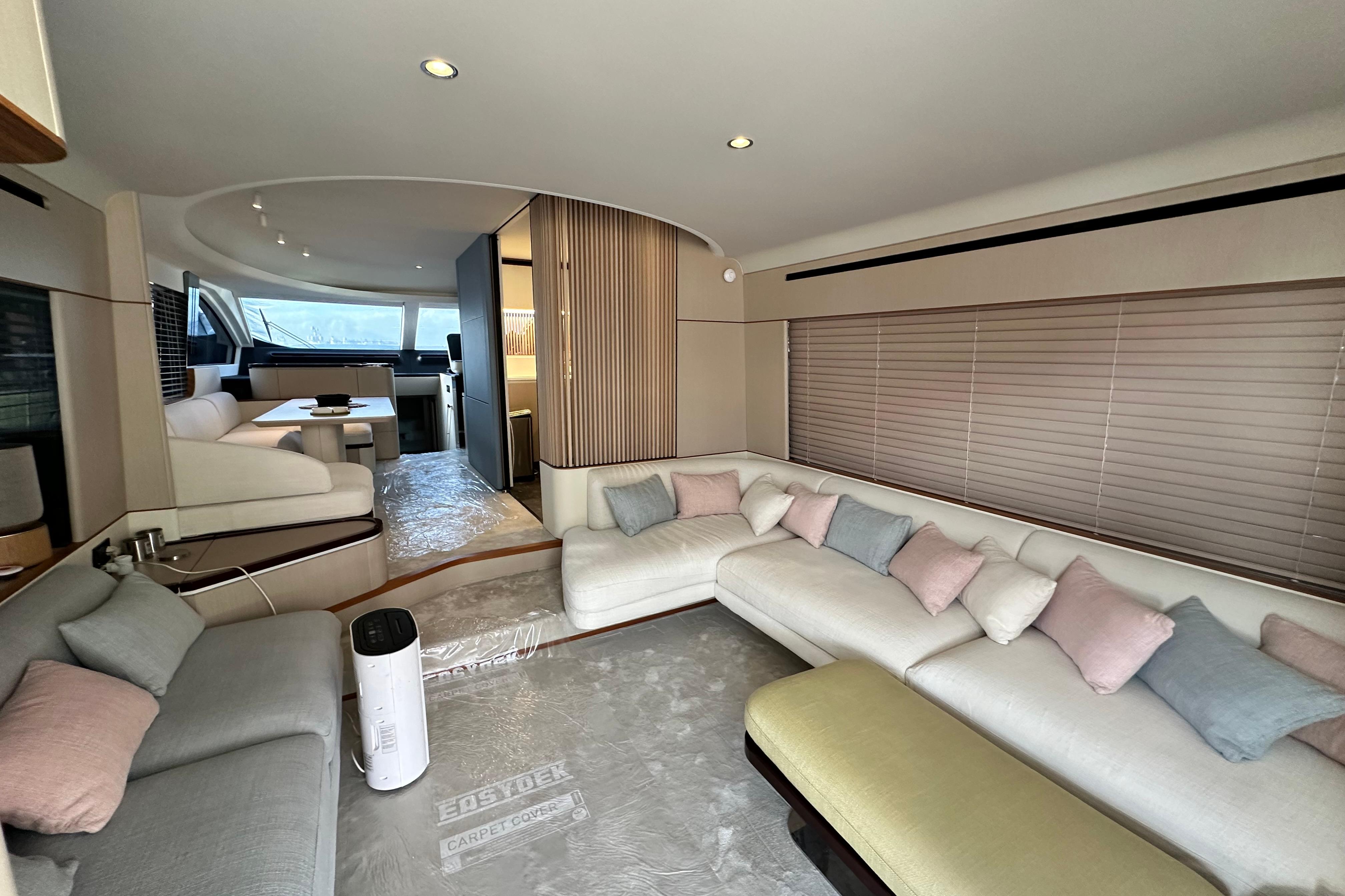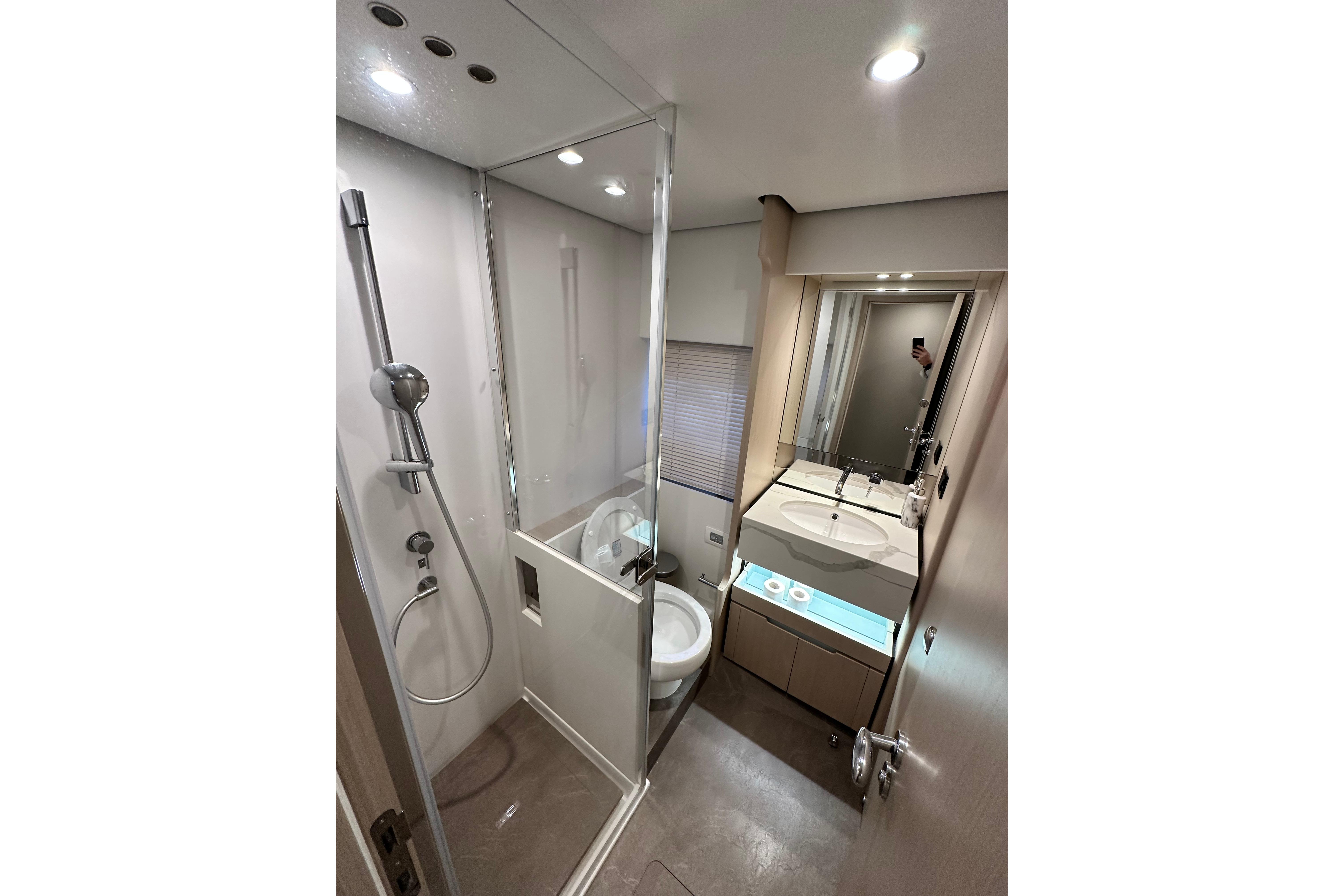 Bow thruster, underwater lights, telescopic gangway, Garmin Gold Pack, AIS 800, Garmin cameras, convertible foredeck sunbed, quartzite heads, Salvagni interior, dimmers, washer/dryer.