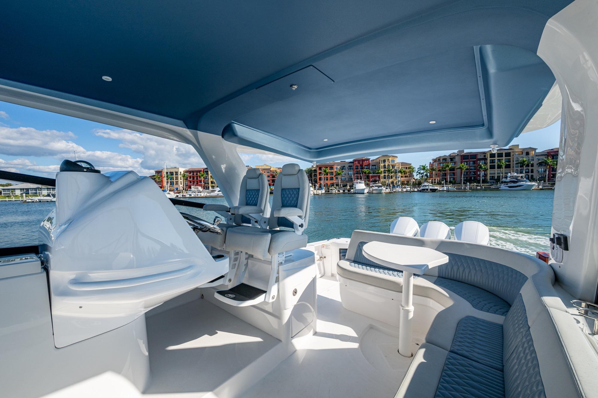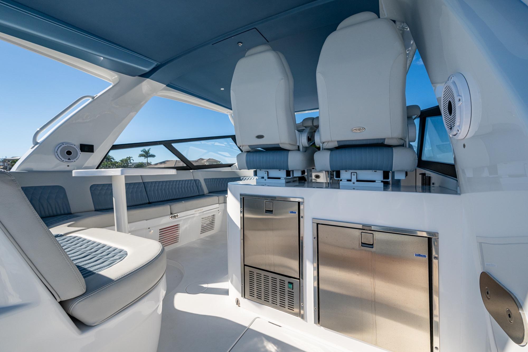 Custom helm seating with ice maker and refrigerator in aft pod