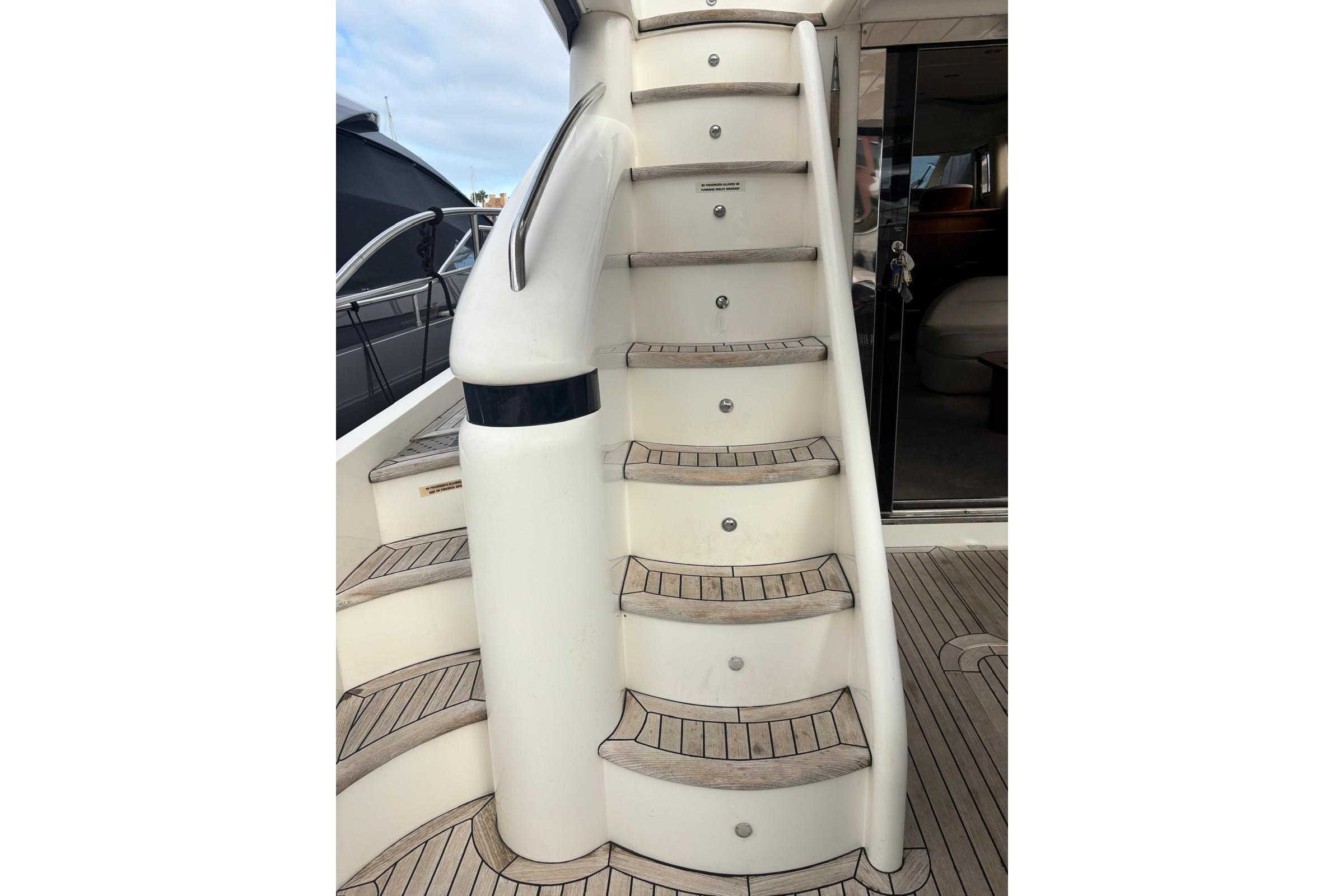 Standard Equipment220/240v diesel generator (11kW). 220/240v shore power with 95-amp float battery chargers. Power-assisted hydraulic steering system. 11hp bow thruster. Autopilot. Colour radar and chartplotter/GPS with flybridge repeat instrumentation. Twin electric-powered sternline docking winches. Electric anchor winch. Electro-hydraulic trim tabs. Dual-station log and echo sounder with alarm. Dual-station VHF/RT. Remote control searchlight. Saloon plasma screen TV/DVD/VCR with hi-fi and surround-sound system. Owner's suite TV/radio. Cocktail cabinet with refrigerator. Microwave/conventional oven. Icemaker. Dishwasher. Utility room with washing machine/dryer, storage space and 2 occasional berths. Vacuum freshwater WC system with holding tank. Electrically operated drop window to aft cockpit. Teak-laid aft cockpit deck, flybridge stairway and steps to side deck. Remote control telescopic passerelle (2.8m). Transom platform with concealed electro-hydraulic crane to carry tender or wetbike. Hot and cold transom shower. Deck/anchor wash. Helmsman's door to side deck.