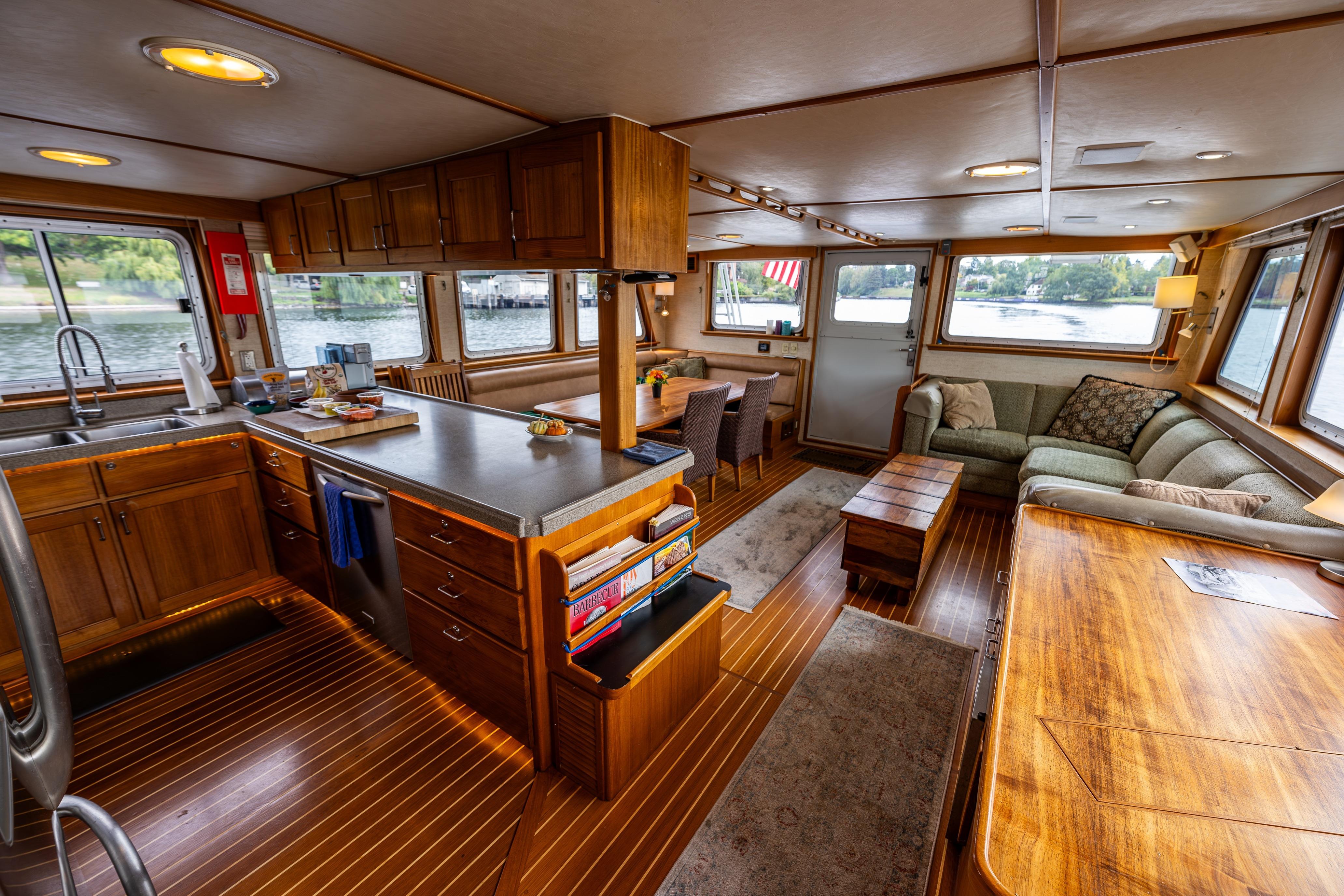 The designers were smart in planning how to get around this trawler with the low transom access and large transom door, the wide side decks that make it easy to get around the vessel, a large cockpit "approximately 13' long x 18' wide that's perfect for the fishing person, the adventure person or dining alfresco on a warm summer evening. The trawlers interior is a very tasteful satin teak and space utilization is excellent. The owner's suite is very comfortable and well-appointed and the guests have private access to their own heads, there is also a day head in the pilothouse. The pilothouse and flybridge helm areas are also very accommodating for owners and guests.