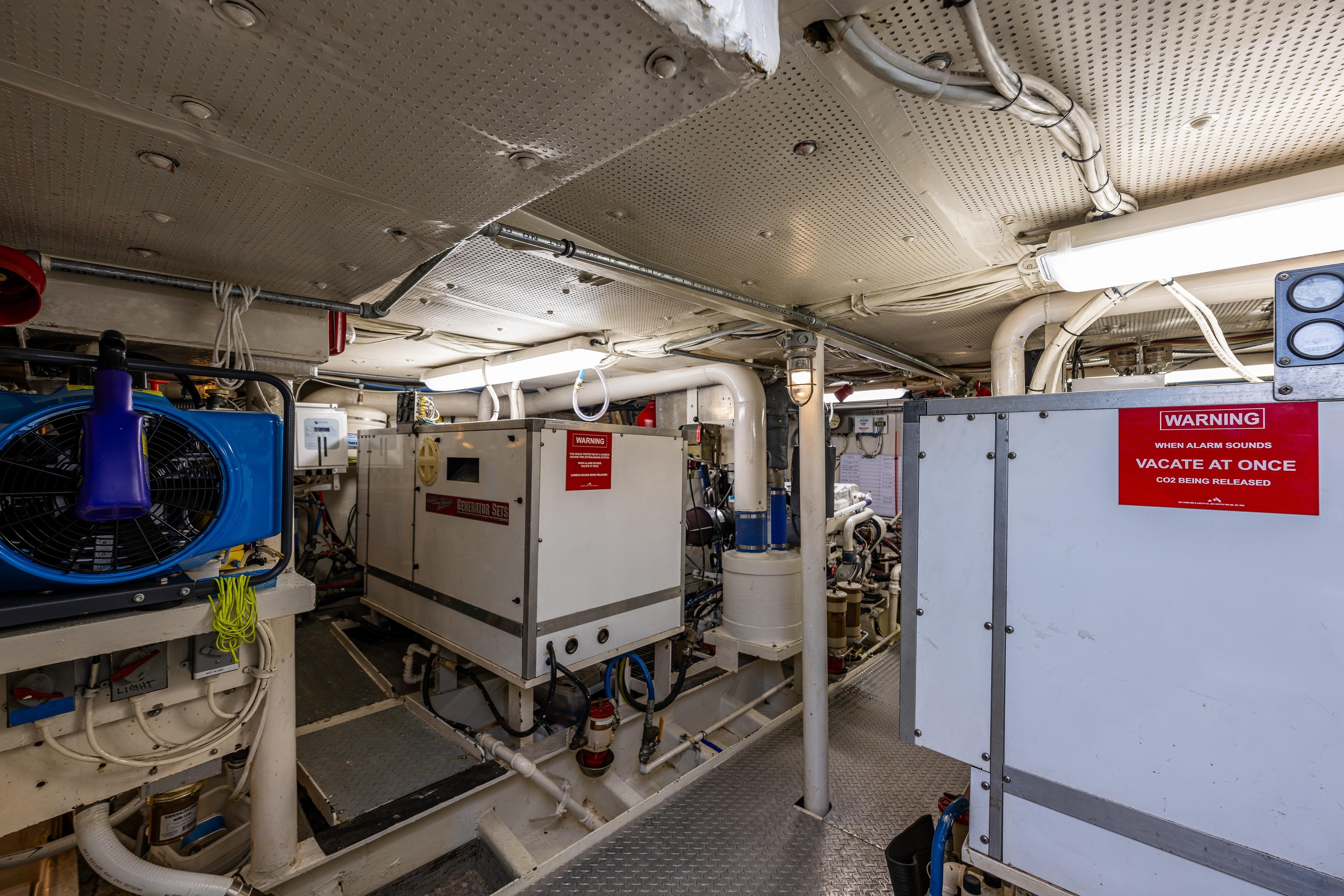 The engine room is accessed through a door in the starboard side of the cockpit. It offers standup headroom and plenty of room to work on the equipment housed in the engine room. Propulsion power is provided by twin Lugger 6125A 325HP diesels.