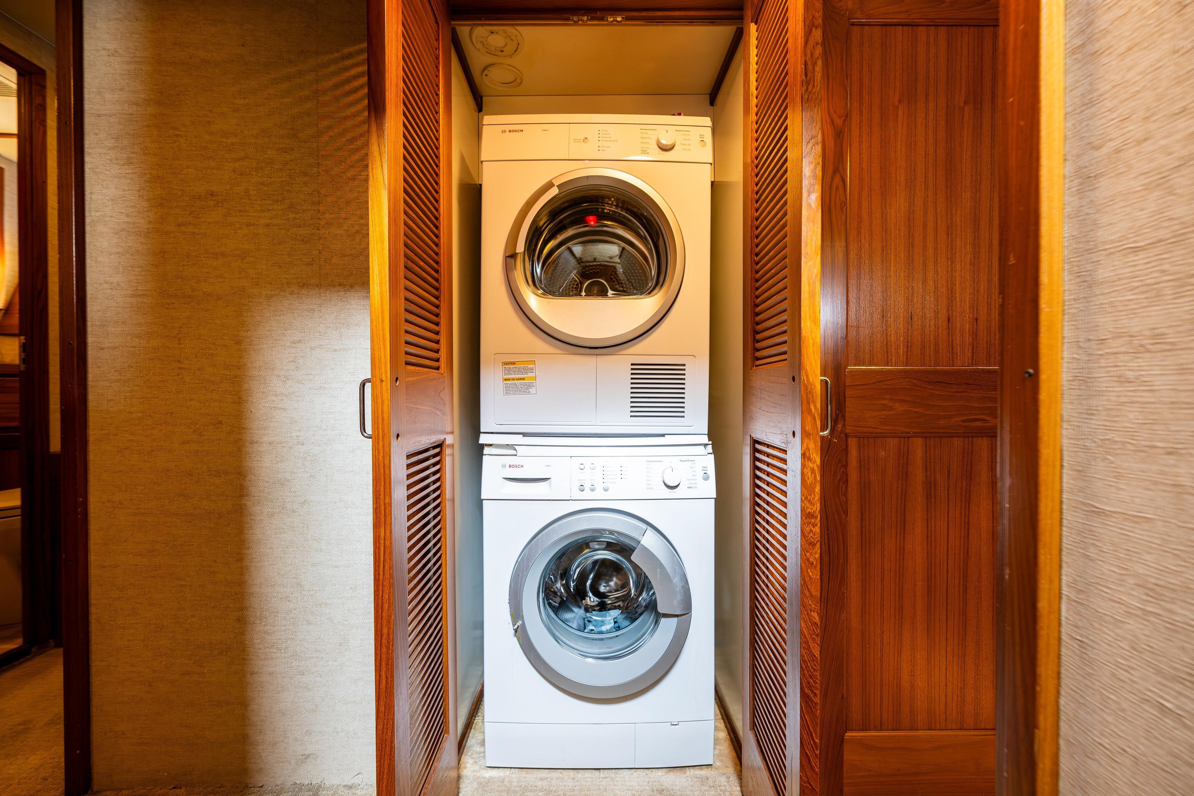 The foyer is accessed from the port side of the pilothouse, providing access to the owners and guest staterooms, and the yacht’s laundry.