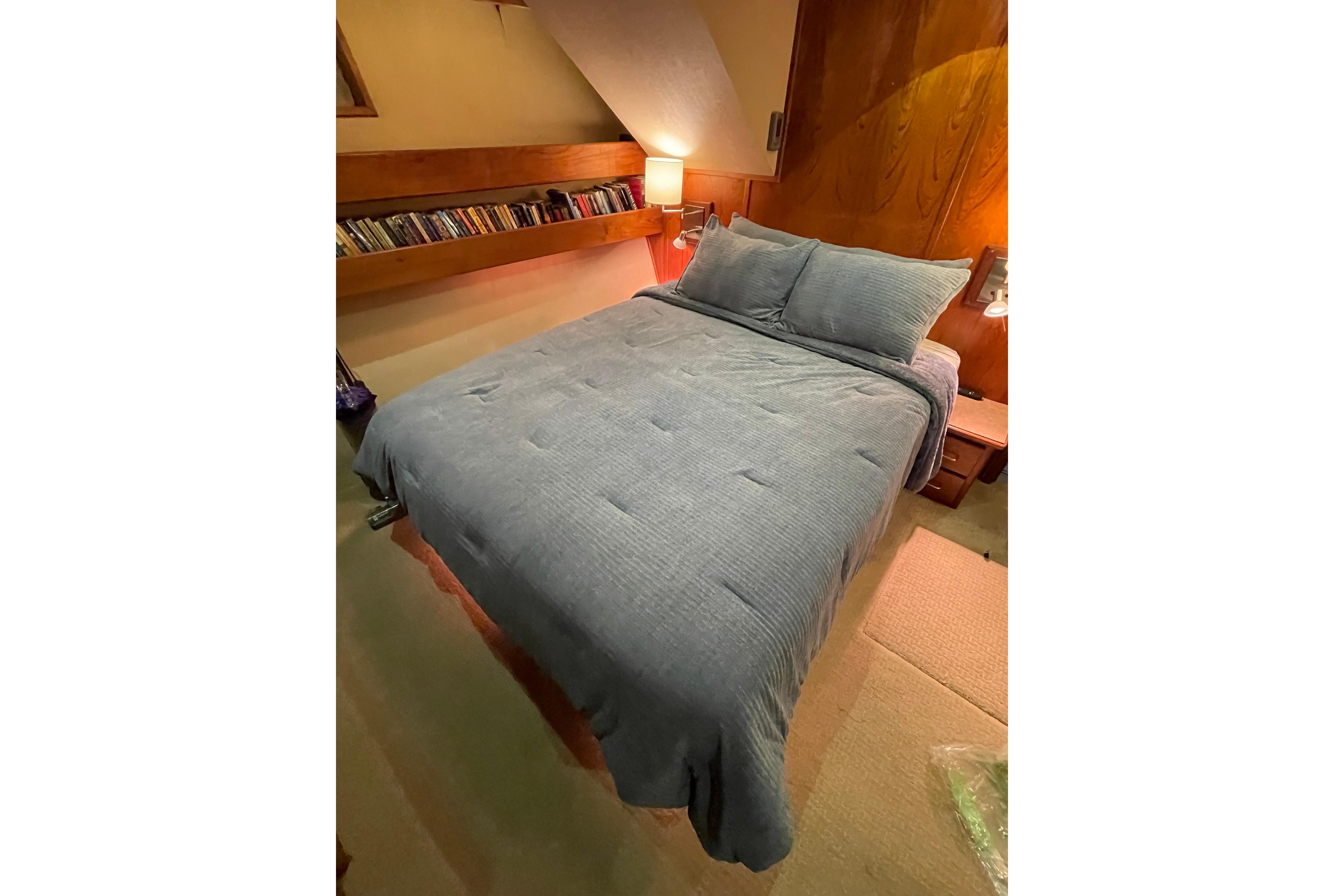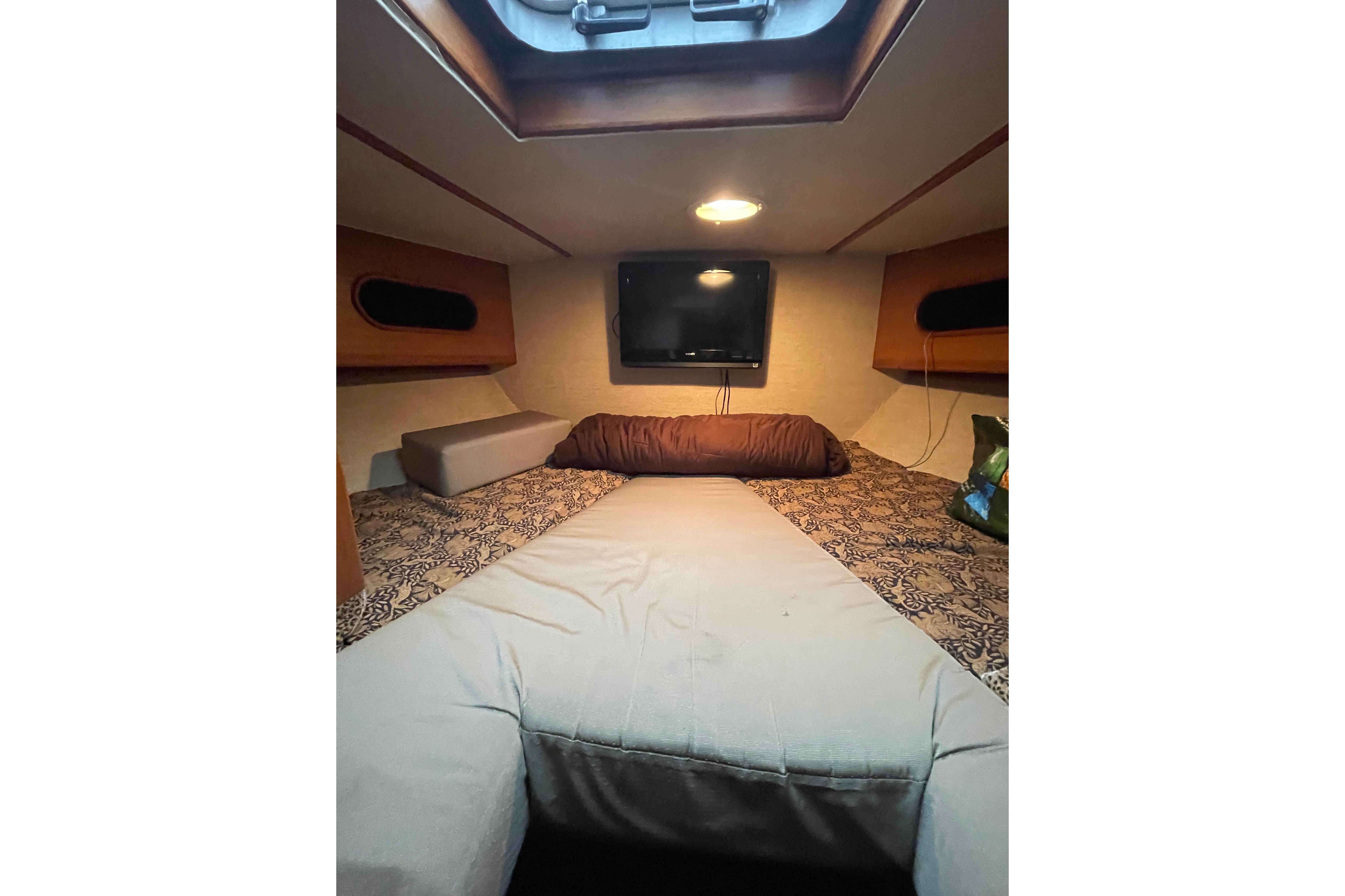 - Large V-berth with custom mattress