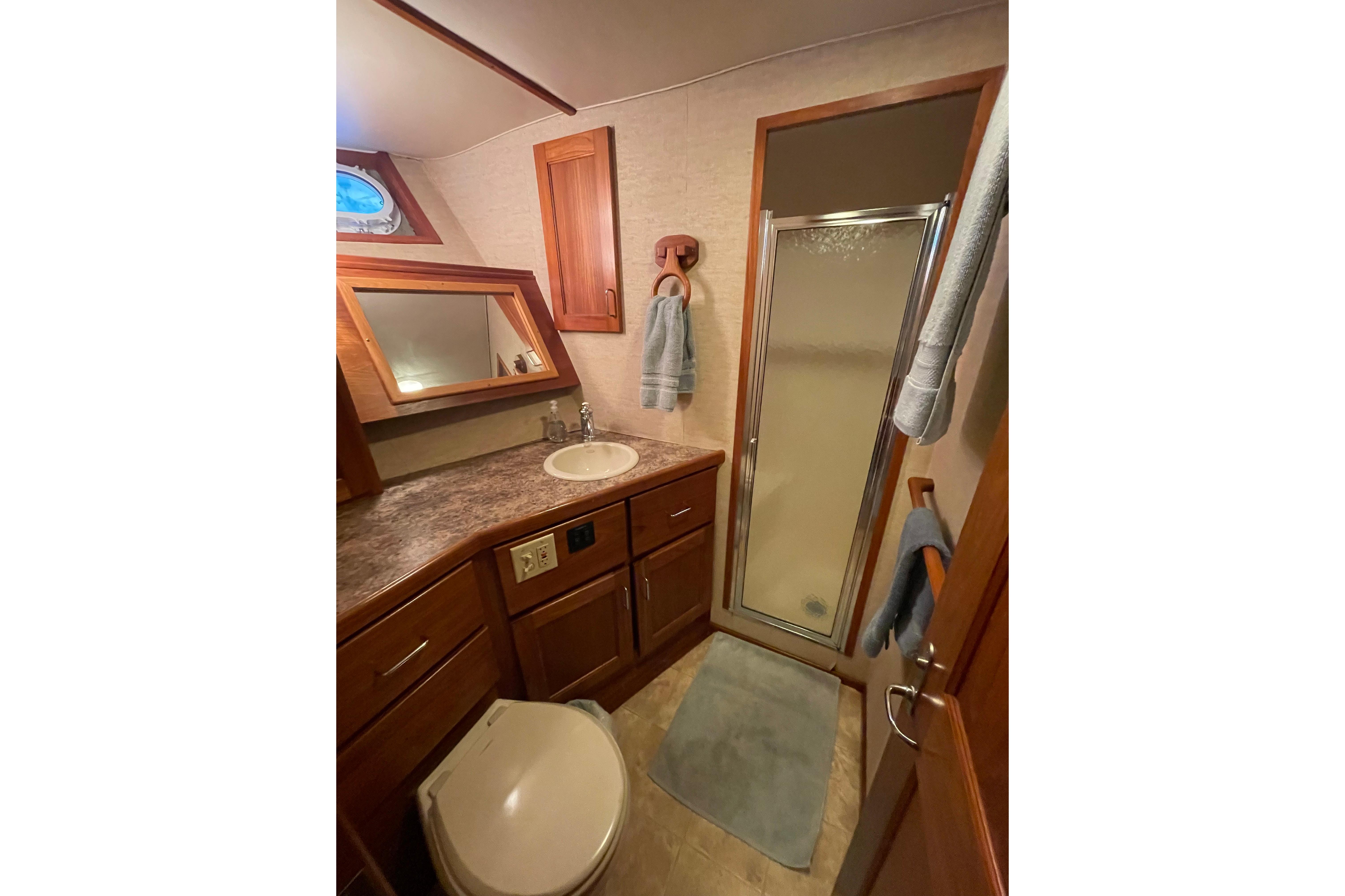 The head serves both the forward and starboard guest staterooms, and offers ensuite access from the stbd guest stateroom. Features include a teak vanity, Royal Flush toilet, drawer and cabinet storage, lighted vanity mirror, portlight with screen and a stall shower.