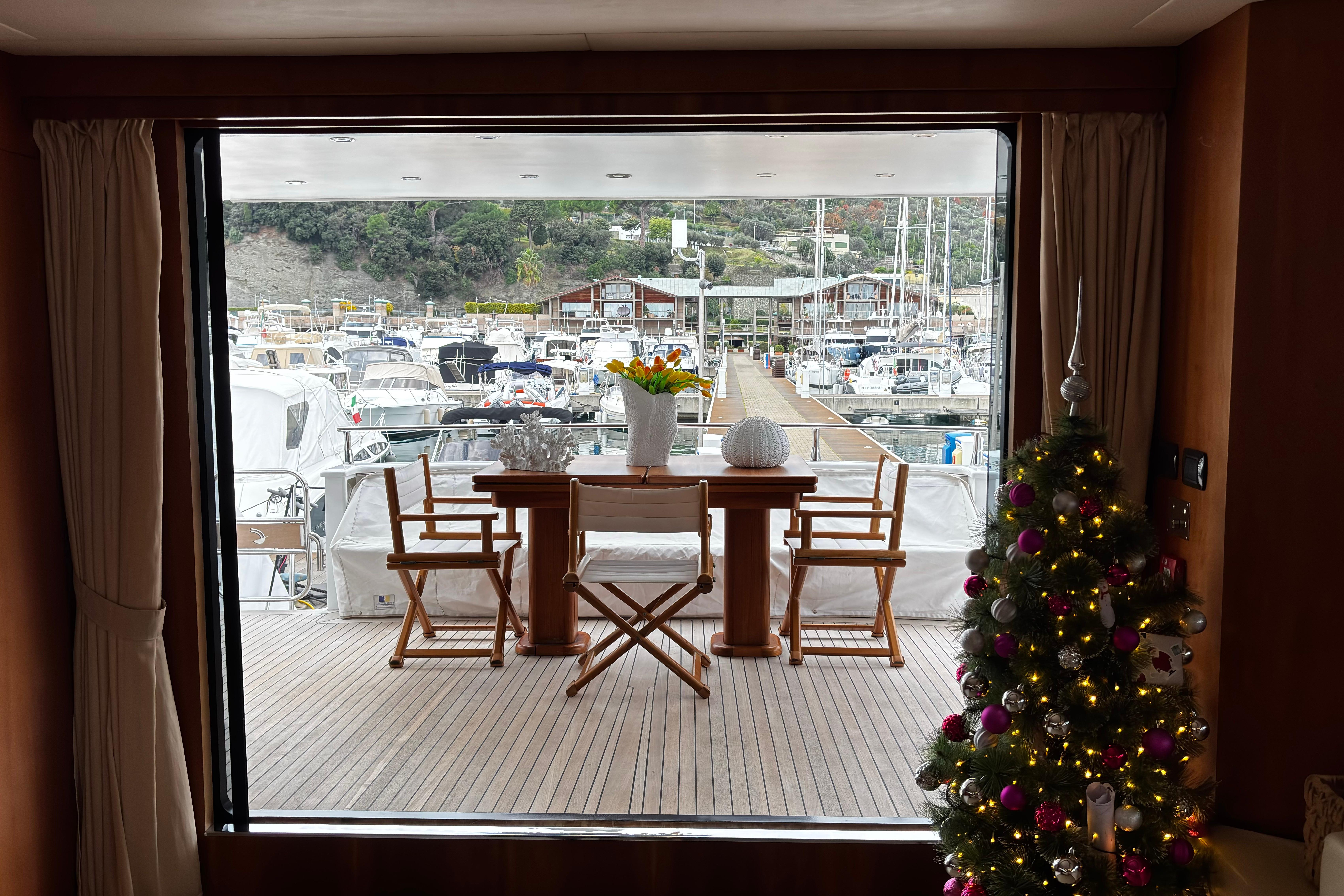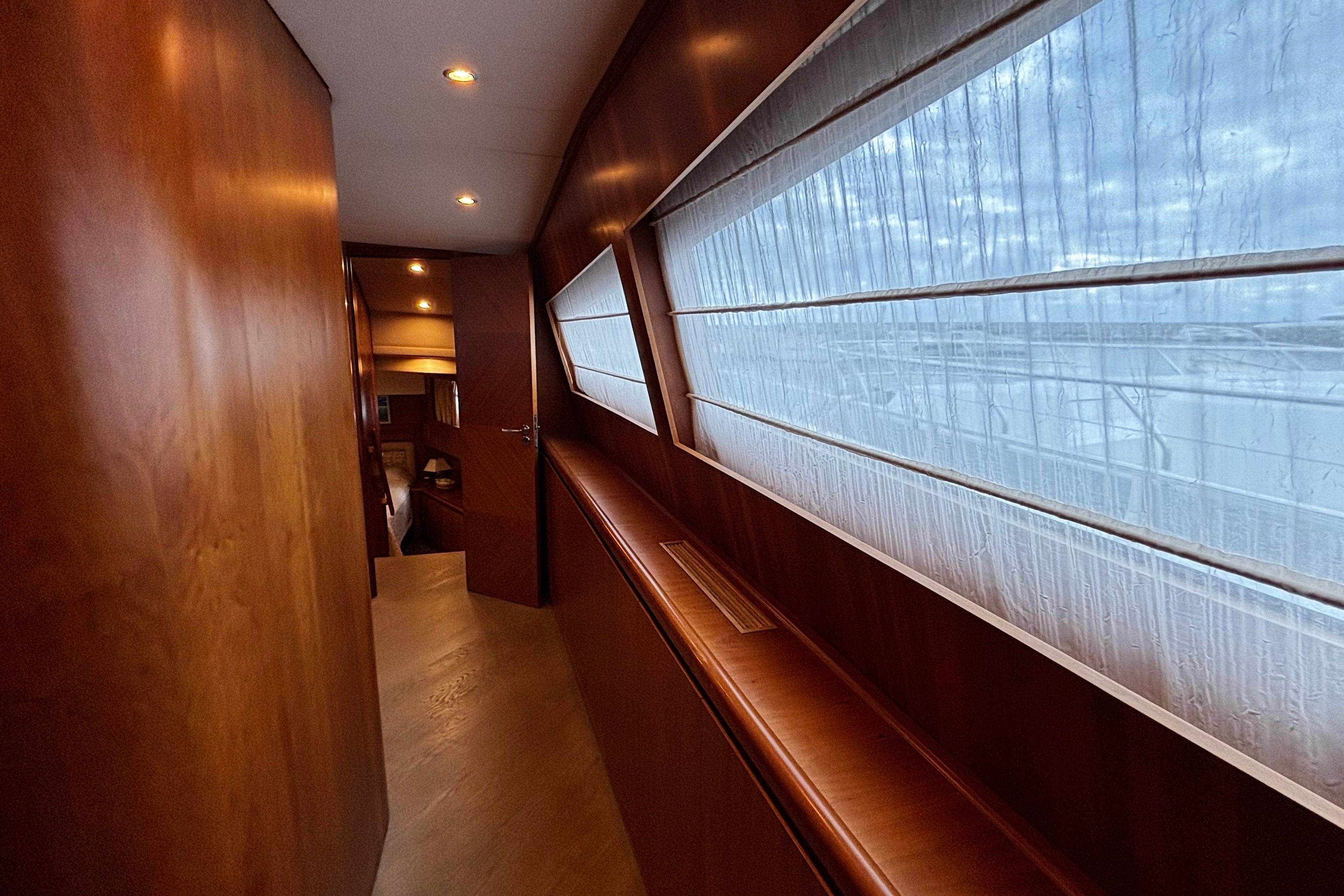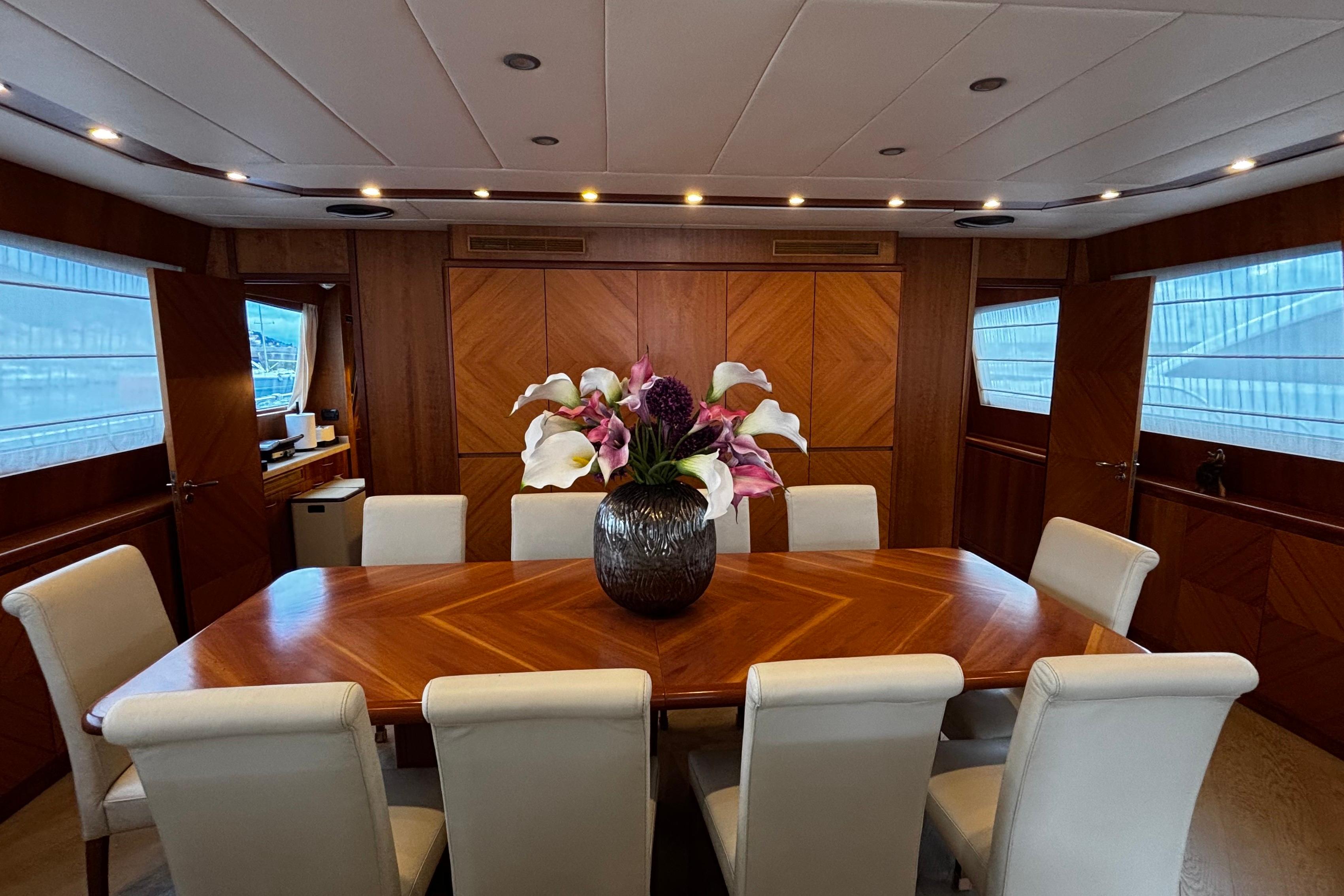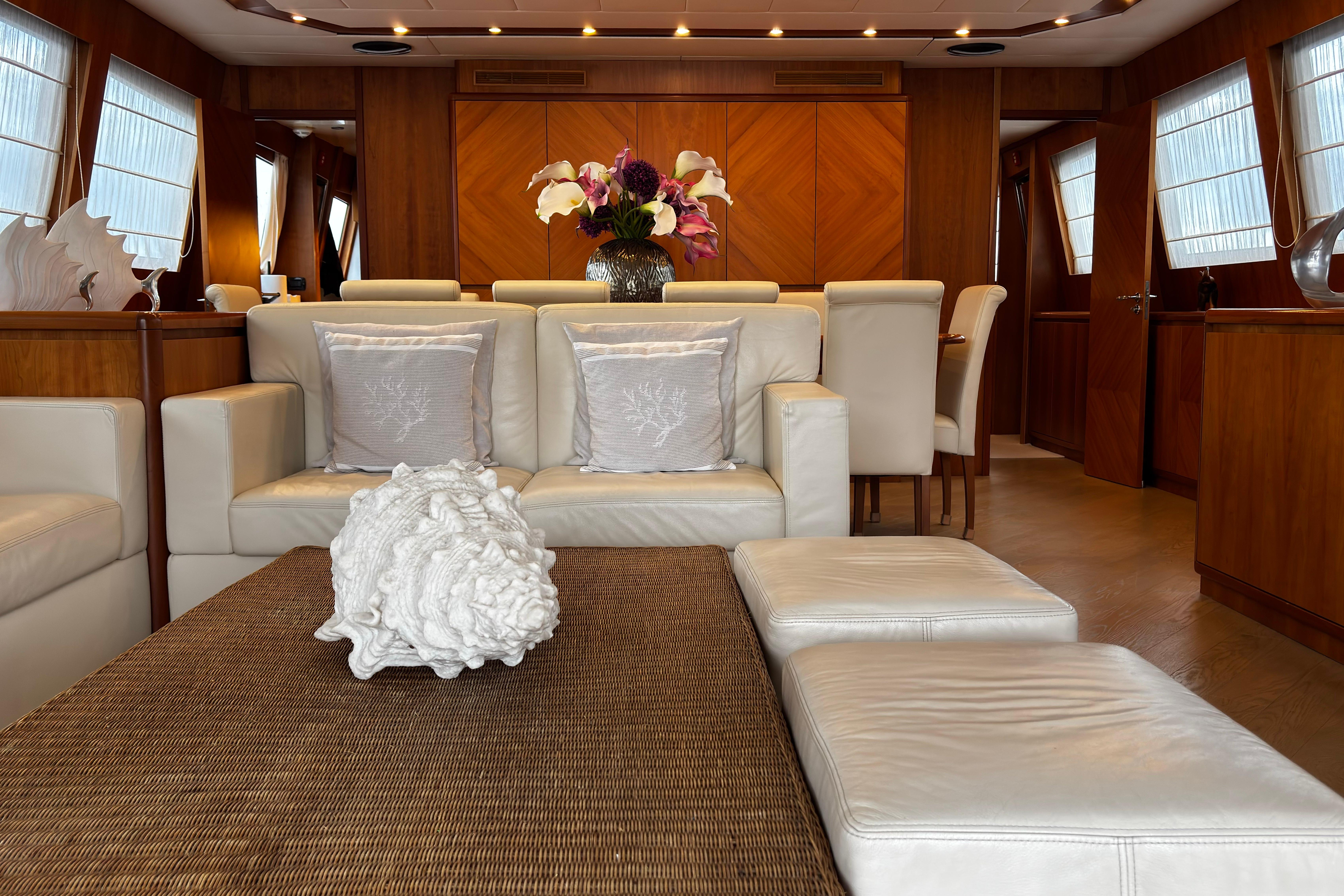 Grazie alla larghezza superiore ai 7 metri, agli spazi estremamente generosi e alla distribuzione intelligente degli ambienti, questo yacht offre una vivibilità paragonabile a imbarcazioni di categoria superiore: grande salone open space, zona pranzo dedicata, cucina completa e un flybridge molto ampio con prendisole in pelle e tavolo pranzo.