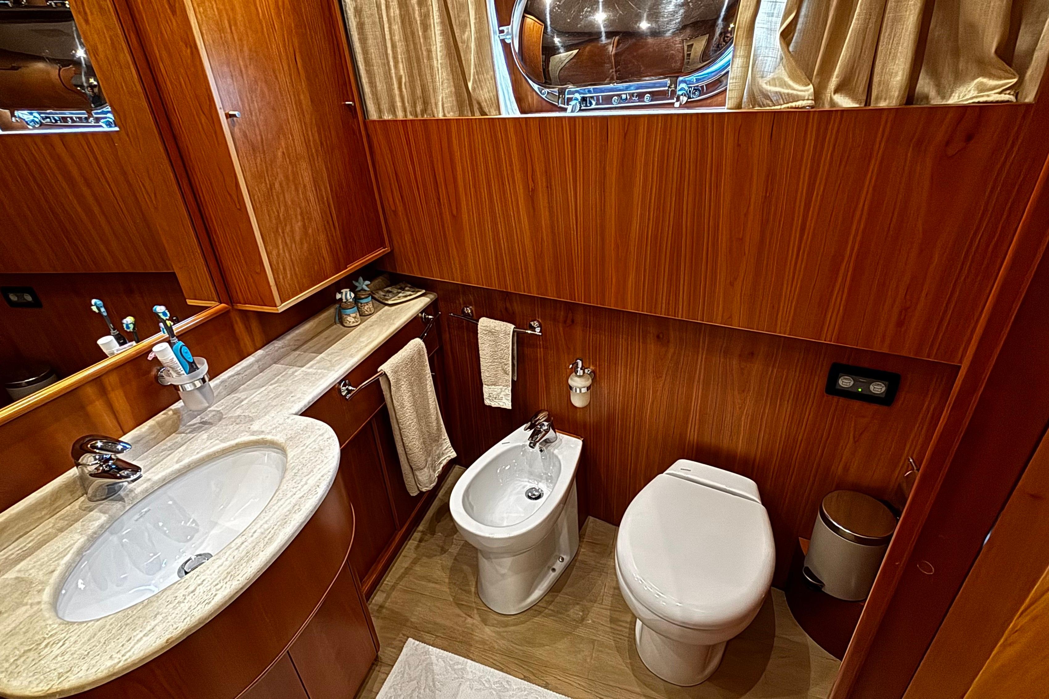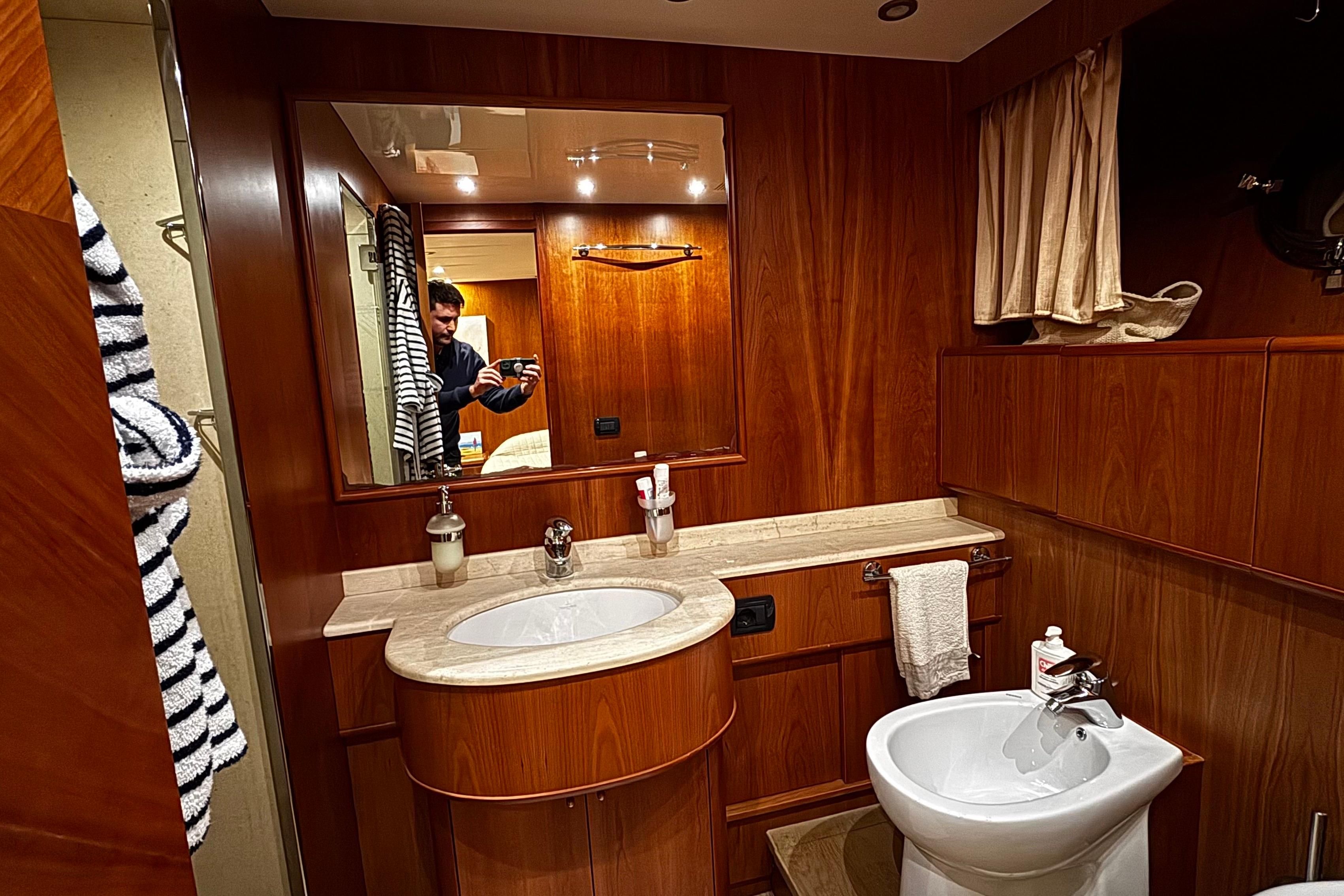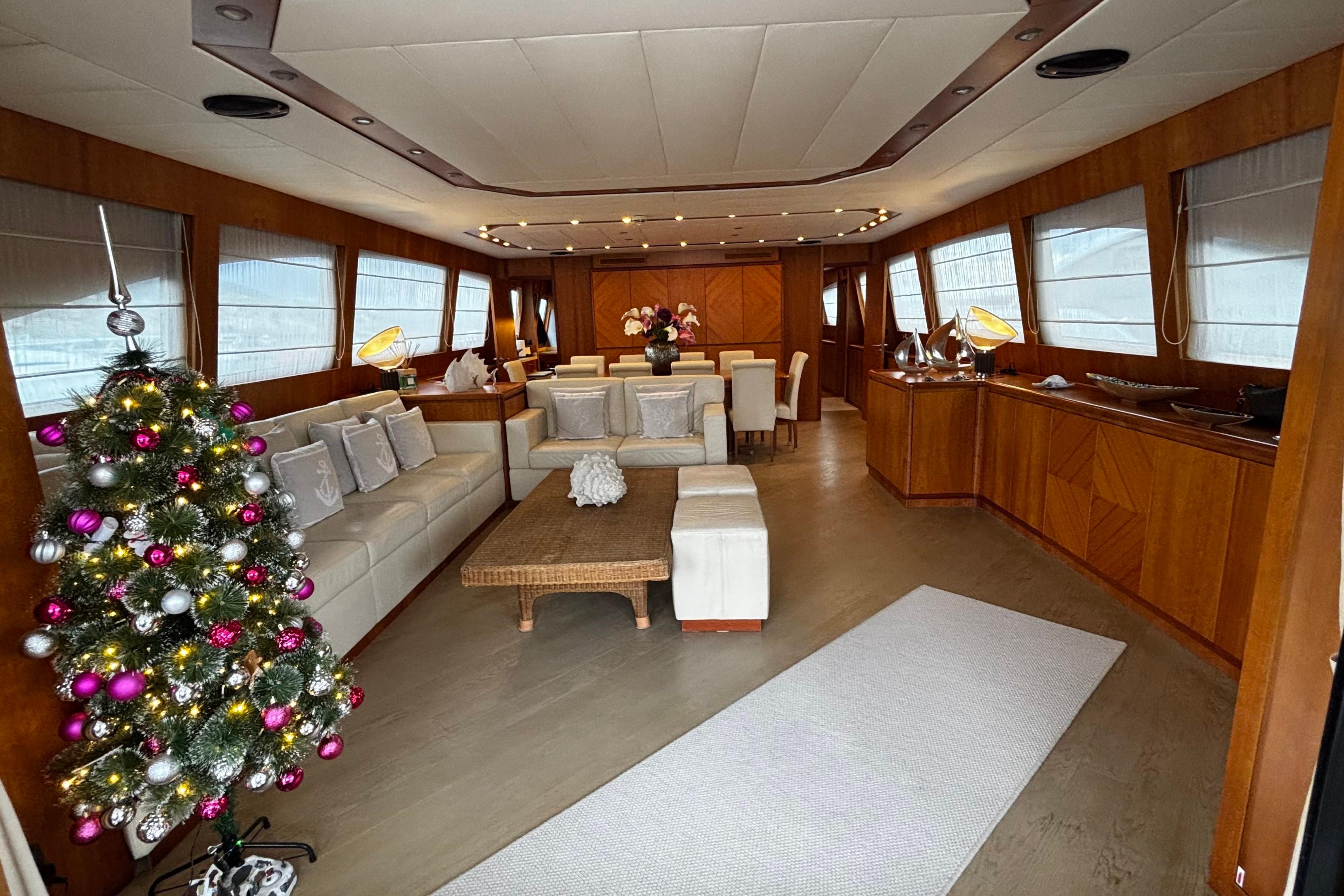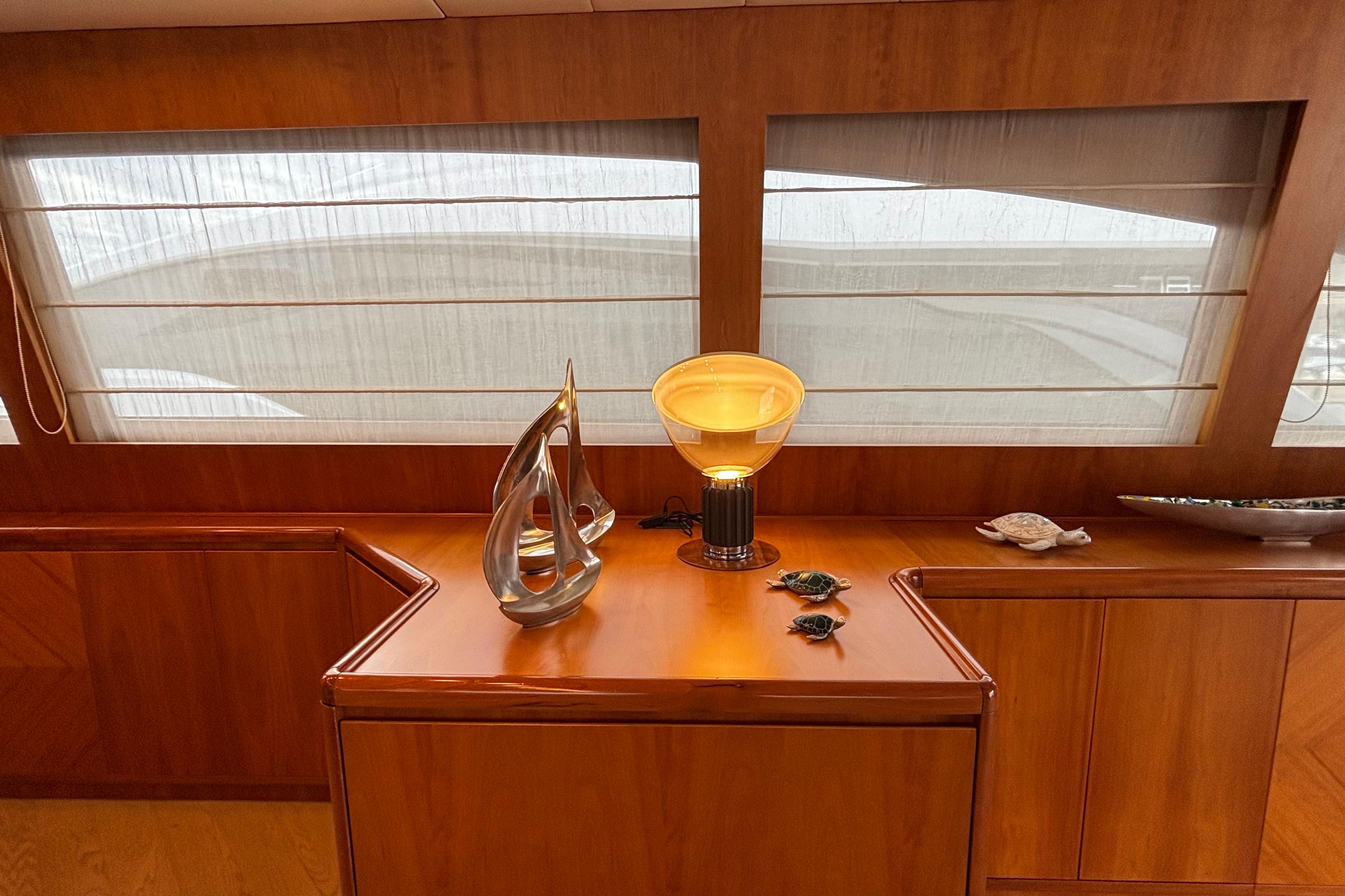 Grazie alla larghezza superiore ai 7 metri, agli spazi estremamente generosi e alla distribuzione intelligente degli ambienti, questo yacht offre una vivibilità paragonabile a imbarcazioni di categoria superiore: grande salone open space, zona pranzo dedicata, cucina completa e un flybridge molto ampio con prendisole in pelle e tavolo pranzo.
