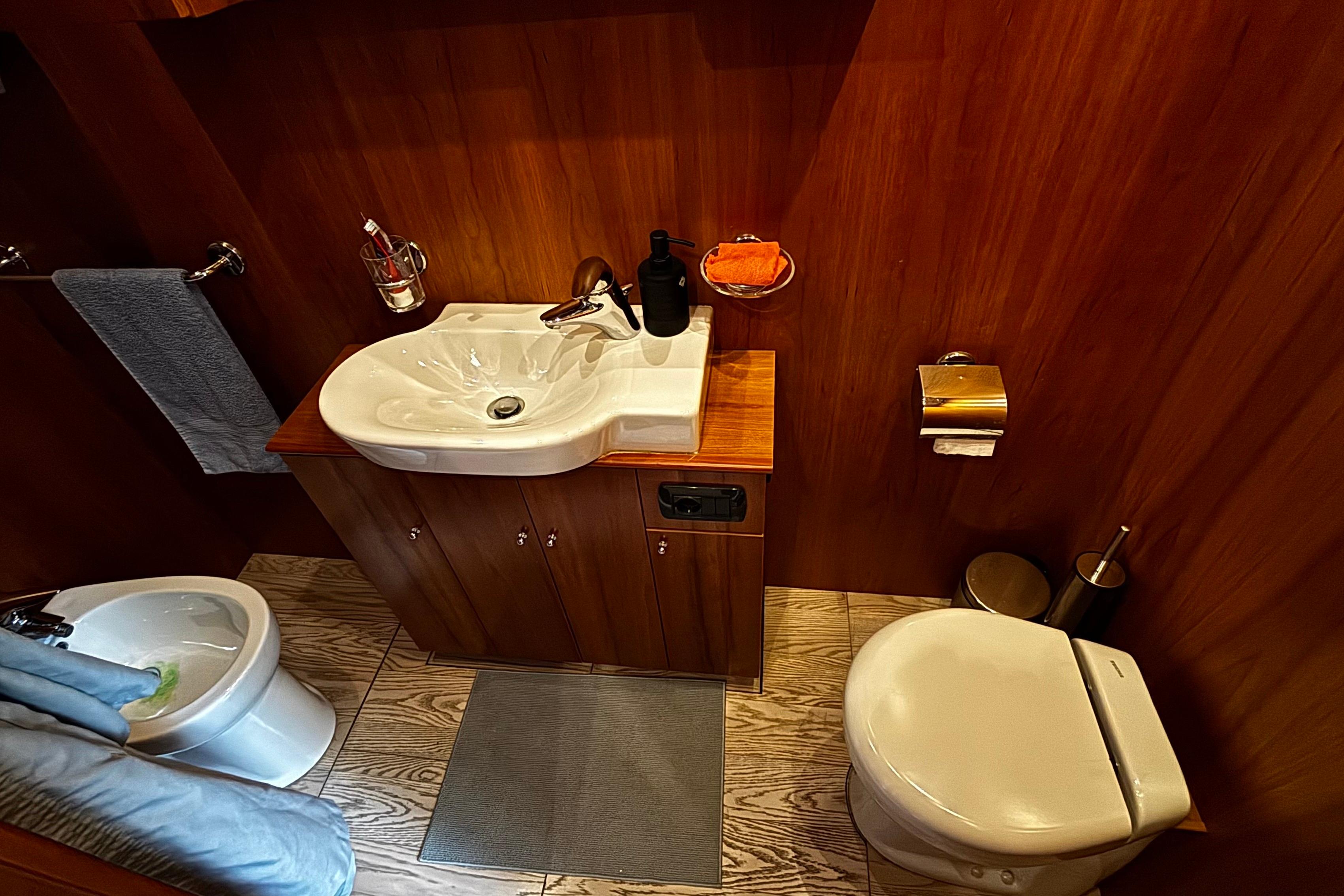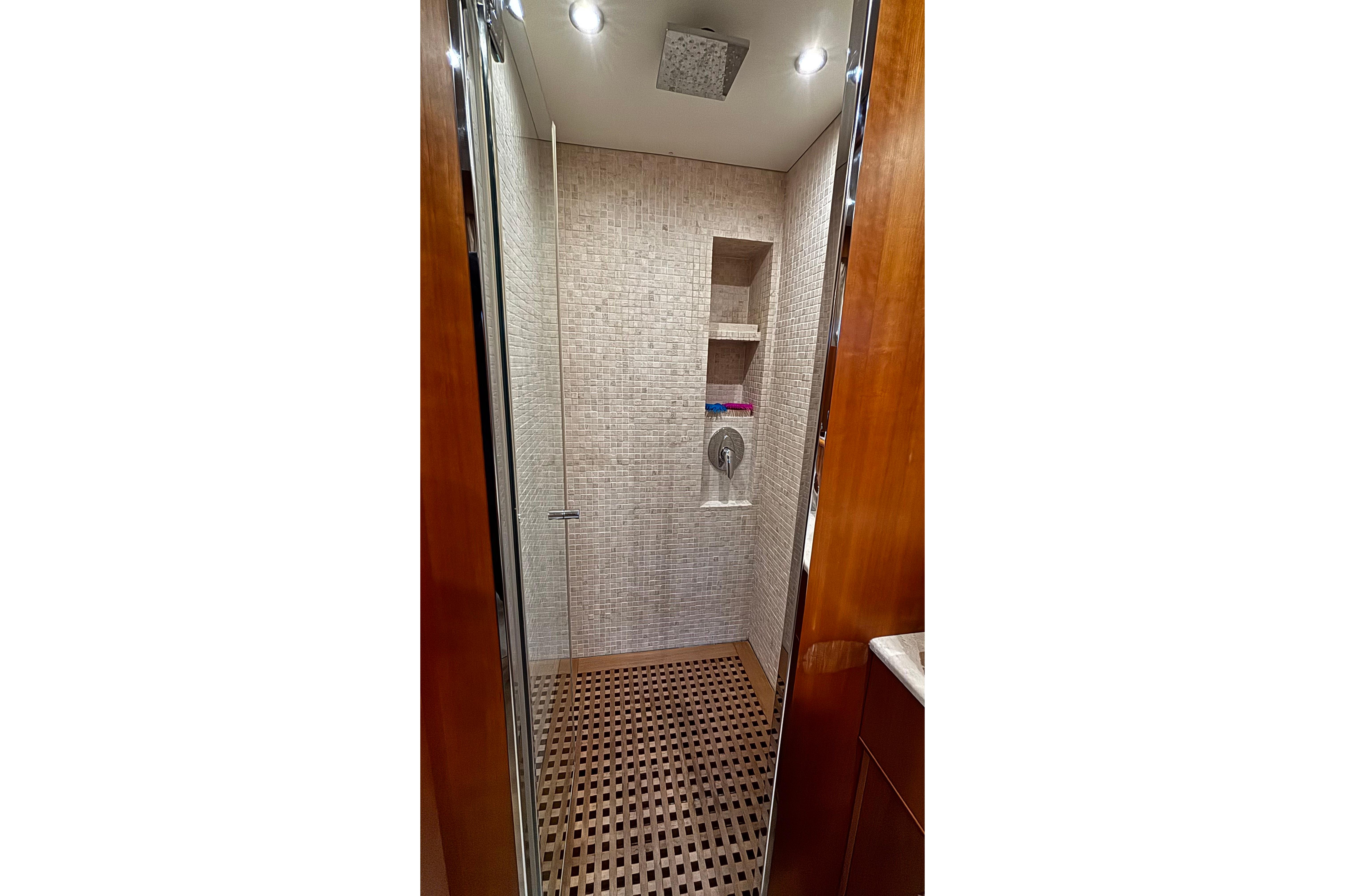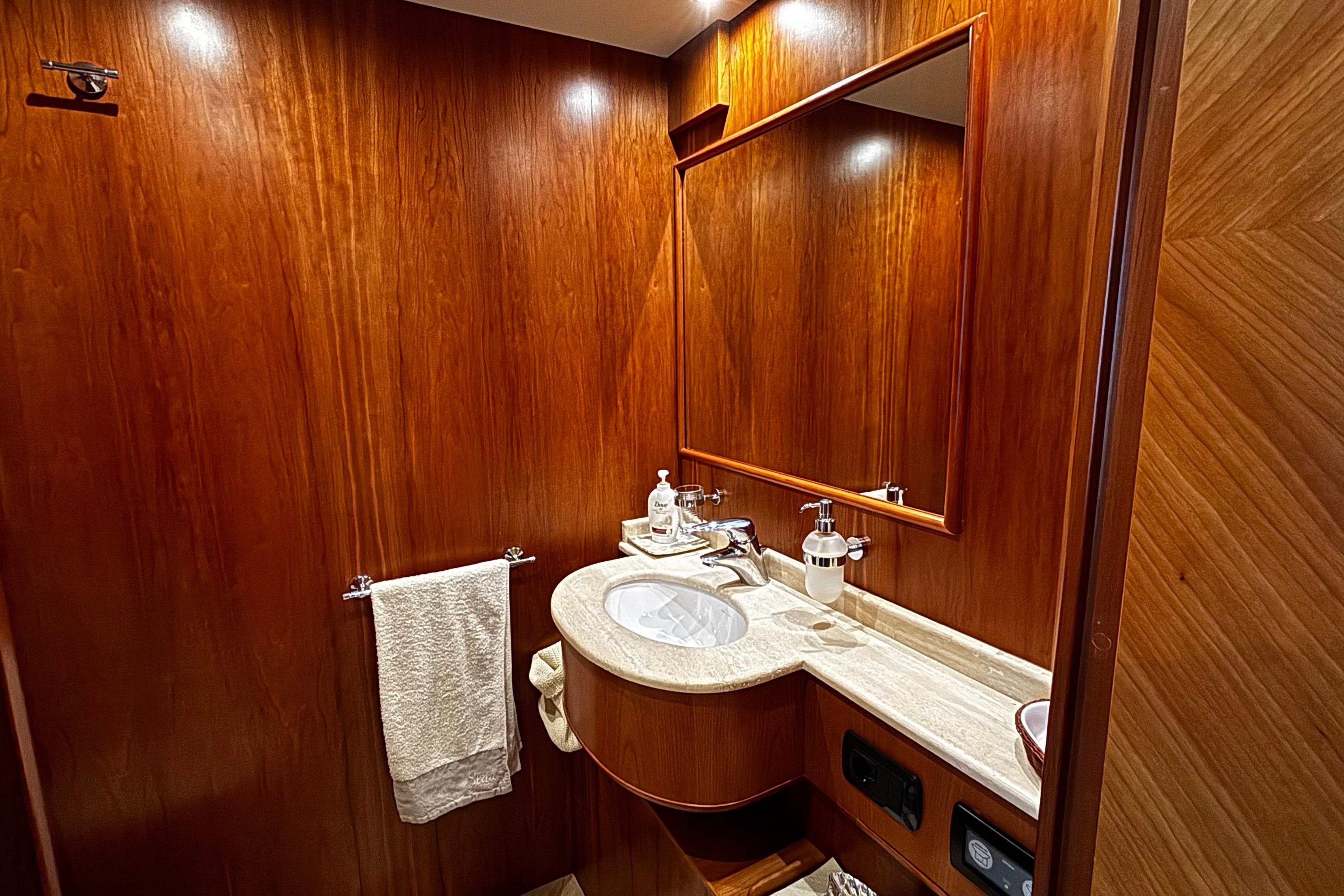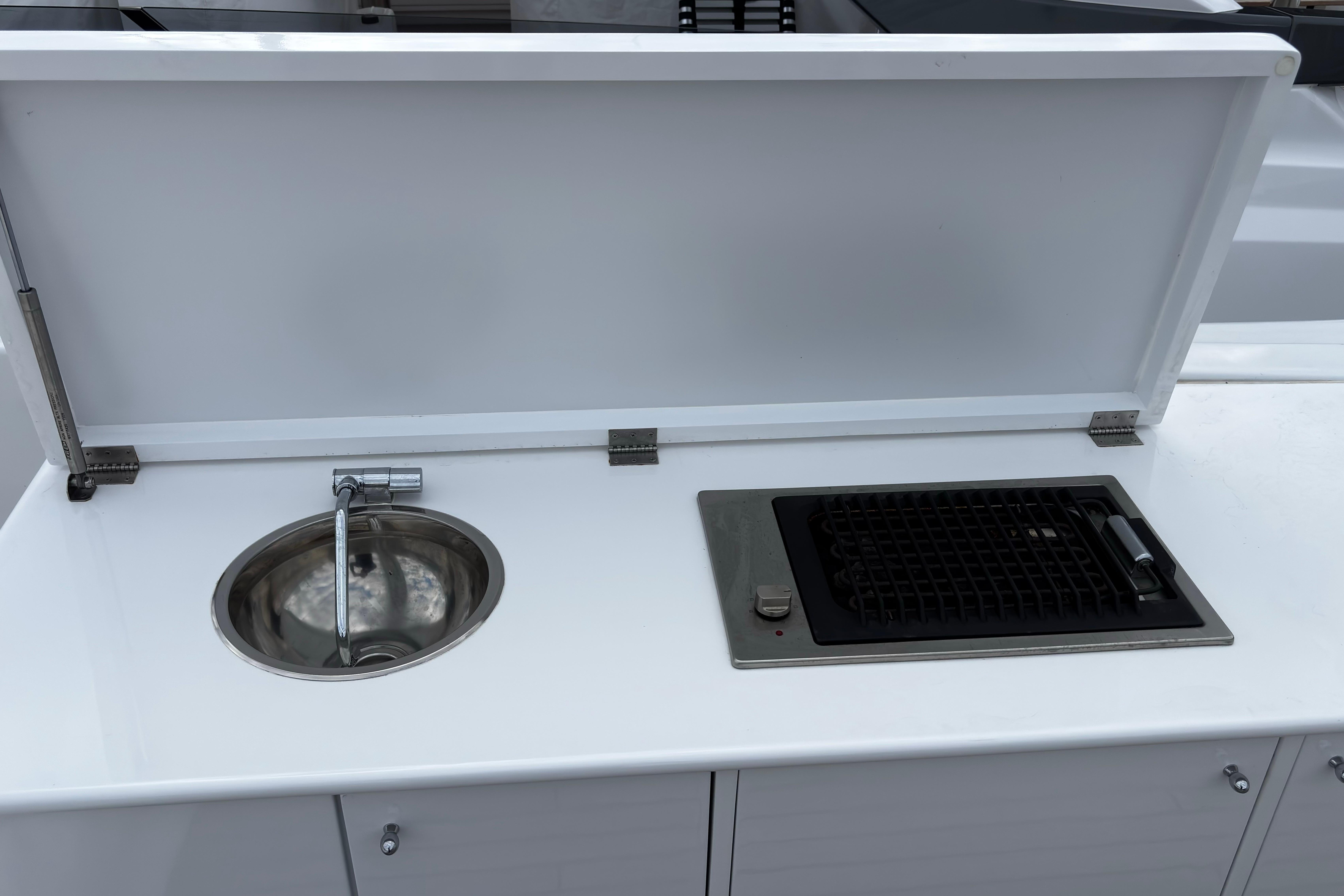 Grazie alla larghezza superiore ai 7 metri, agli spazi estremamente generosi e alla distribuzione intelligente degli ambienti, questo yacht offre una vivibilità paragonabile a imbarcazioni di categoria superiore: grande salone open space, zona pranzo dedicata, cucina completa e un flybridge molto ampio con prendisole in pelle e tavolo pranzo.
