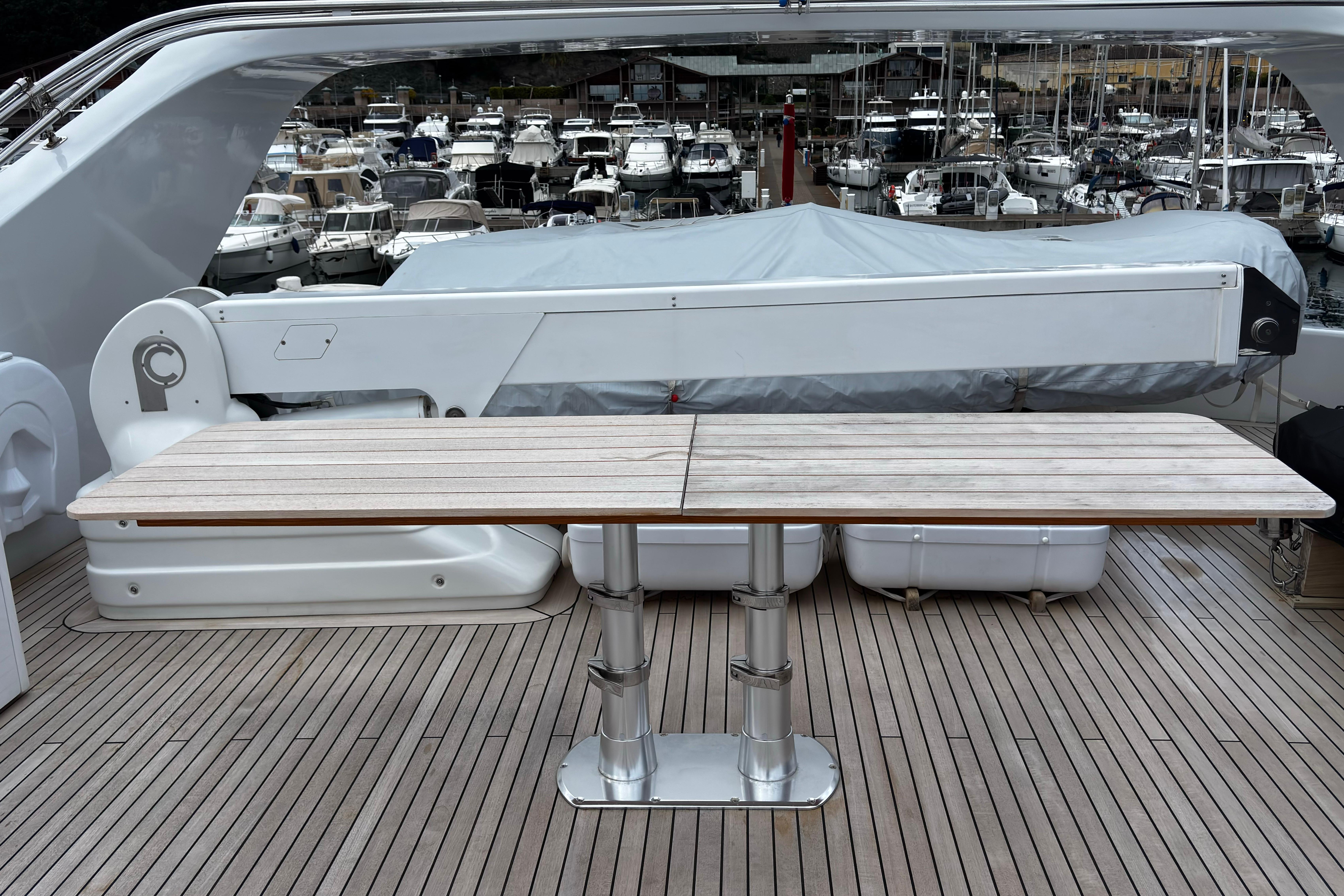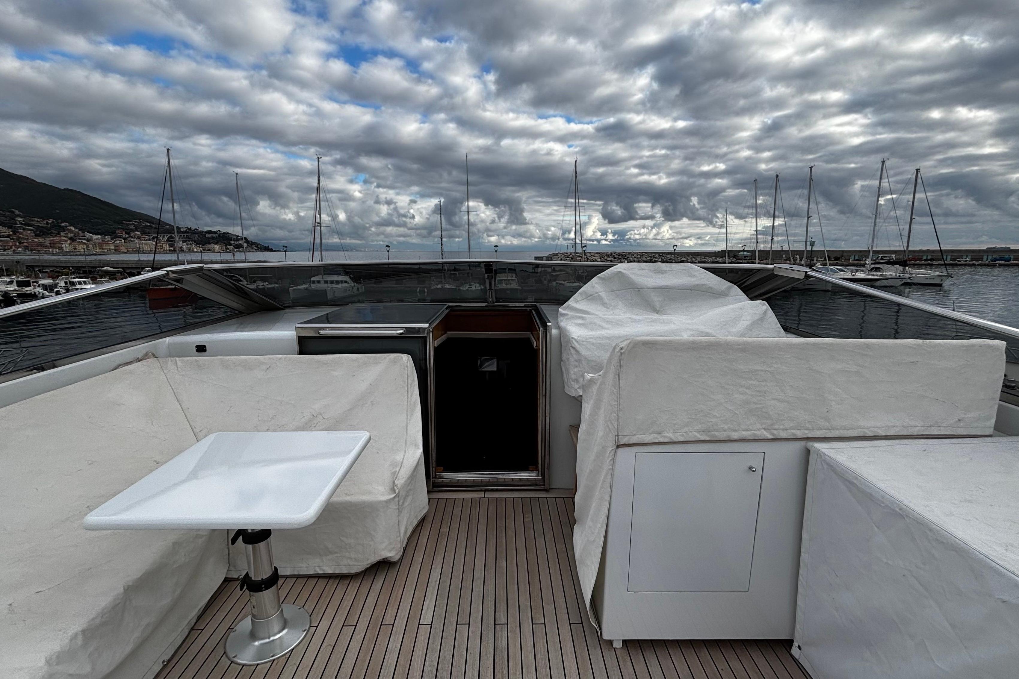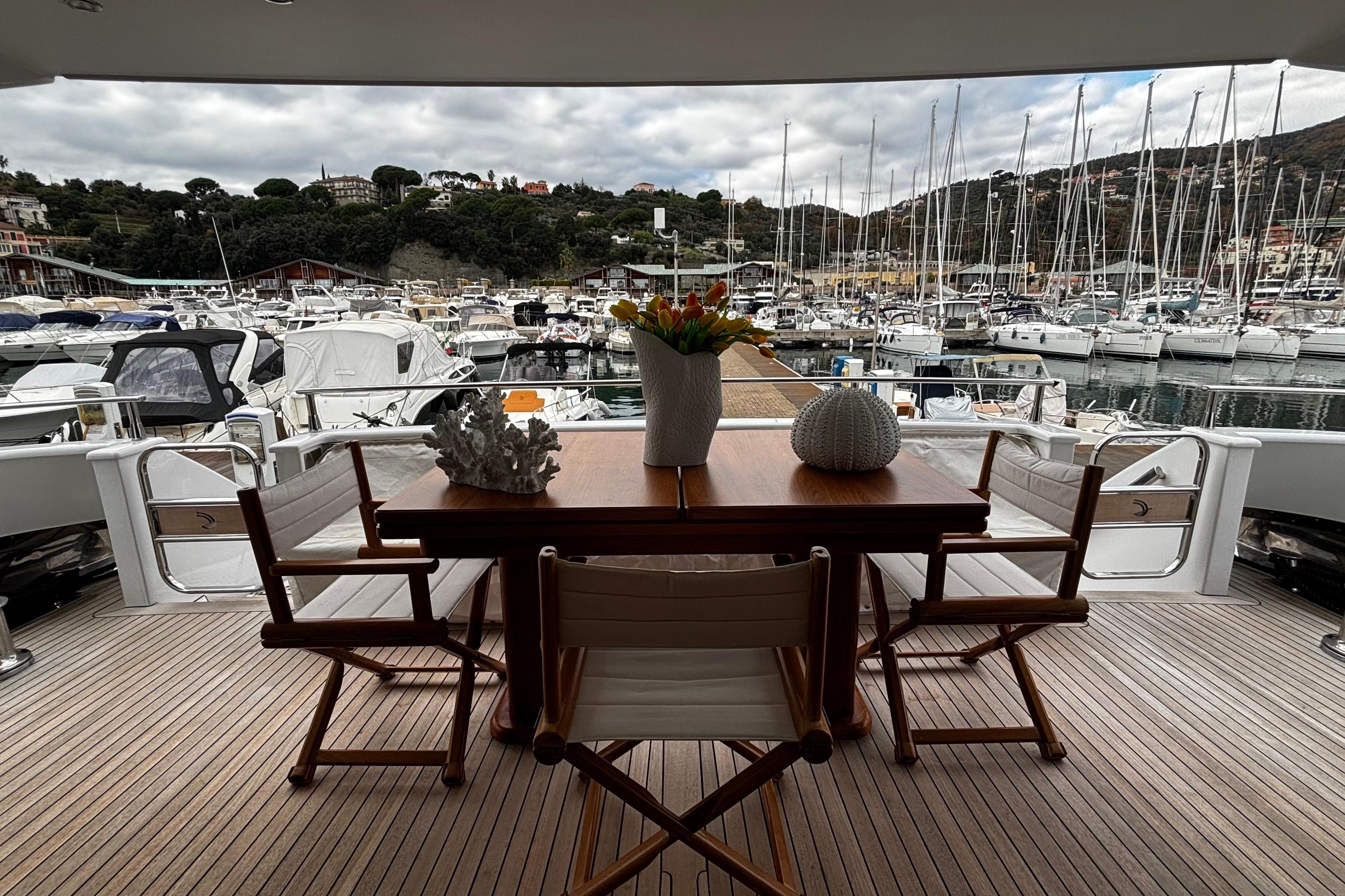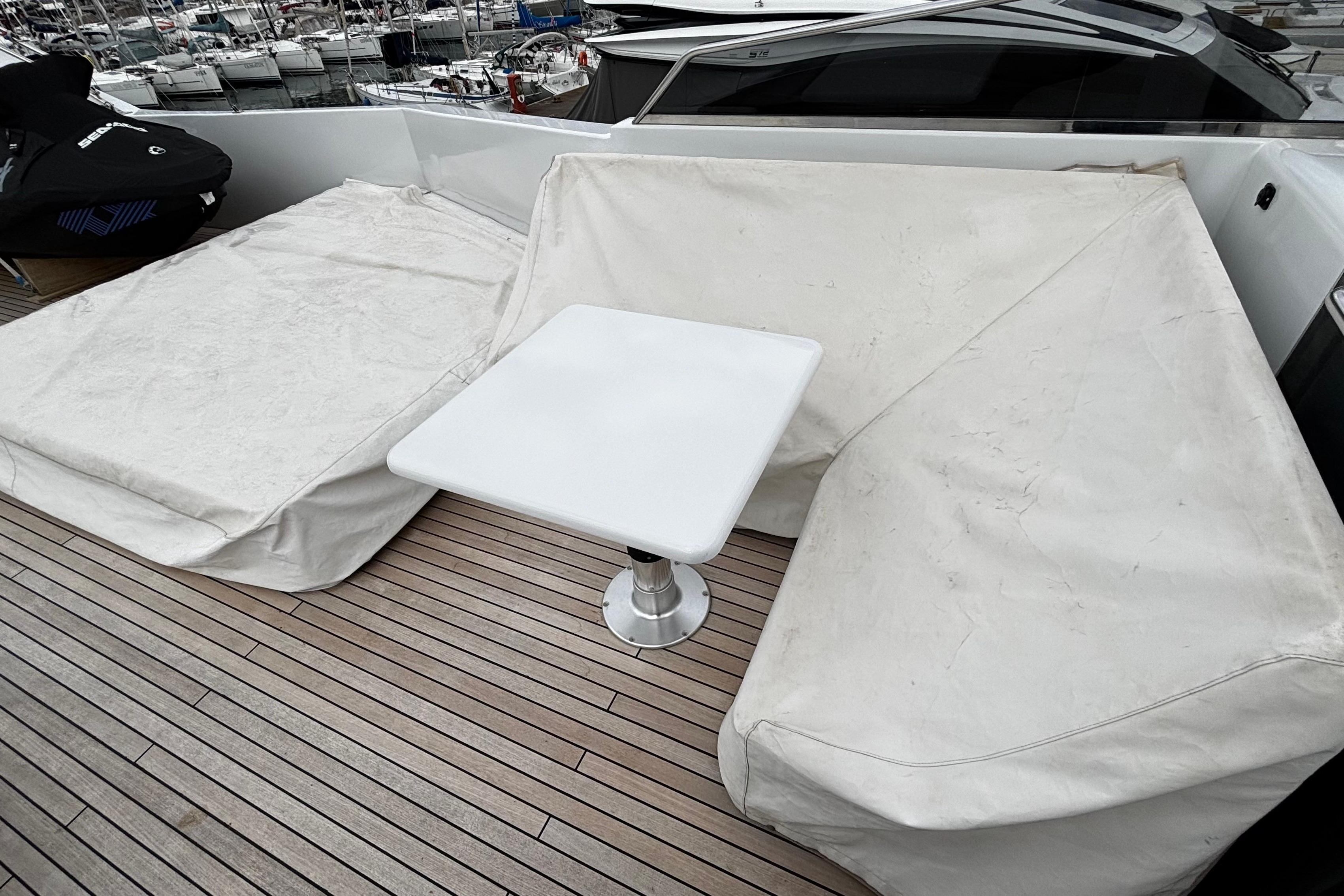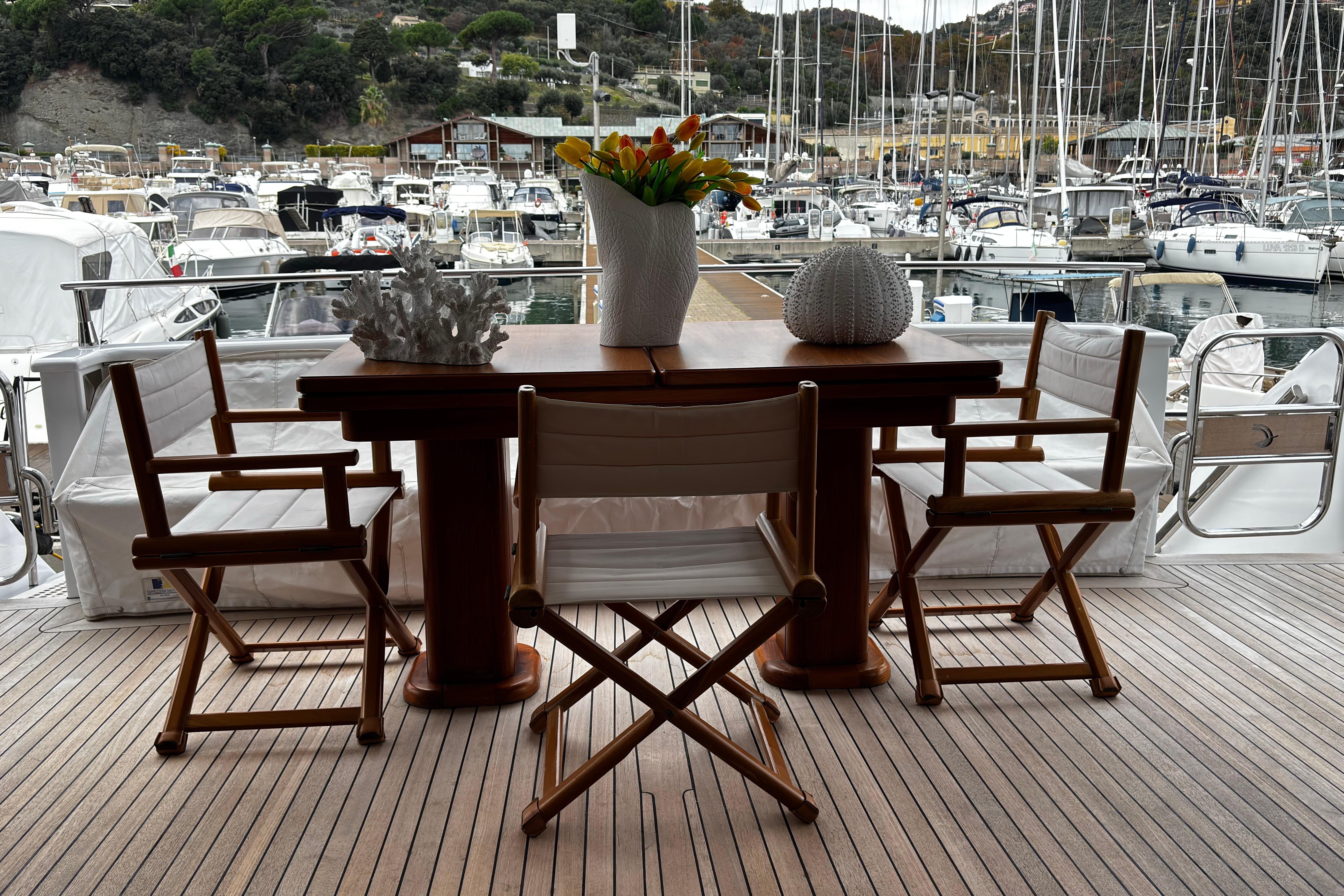 Ampio pozzetto in teak con tavolo pranzo, grande prendisole di prua, flybridge molto vivibile con zona living, tavolo e prendisole dedicati. Passerella, piattaforma di poppa, scaletta bagno elettrica e teli di copertura completano gli esterni.