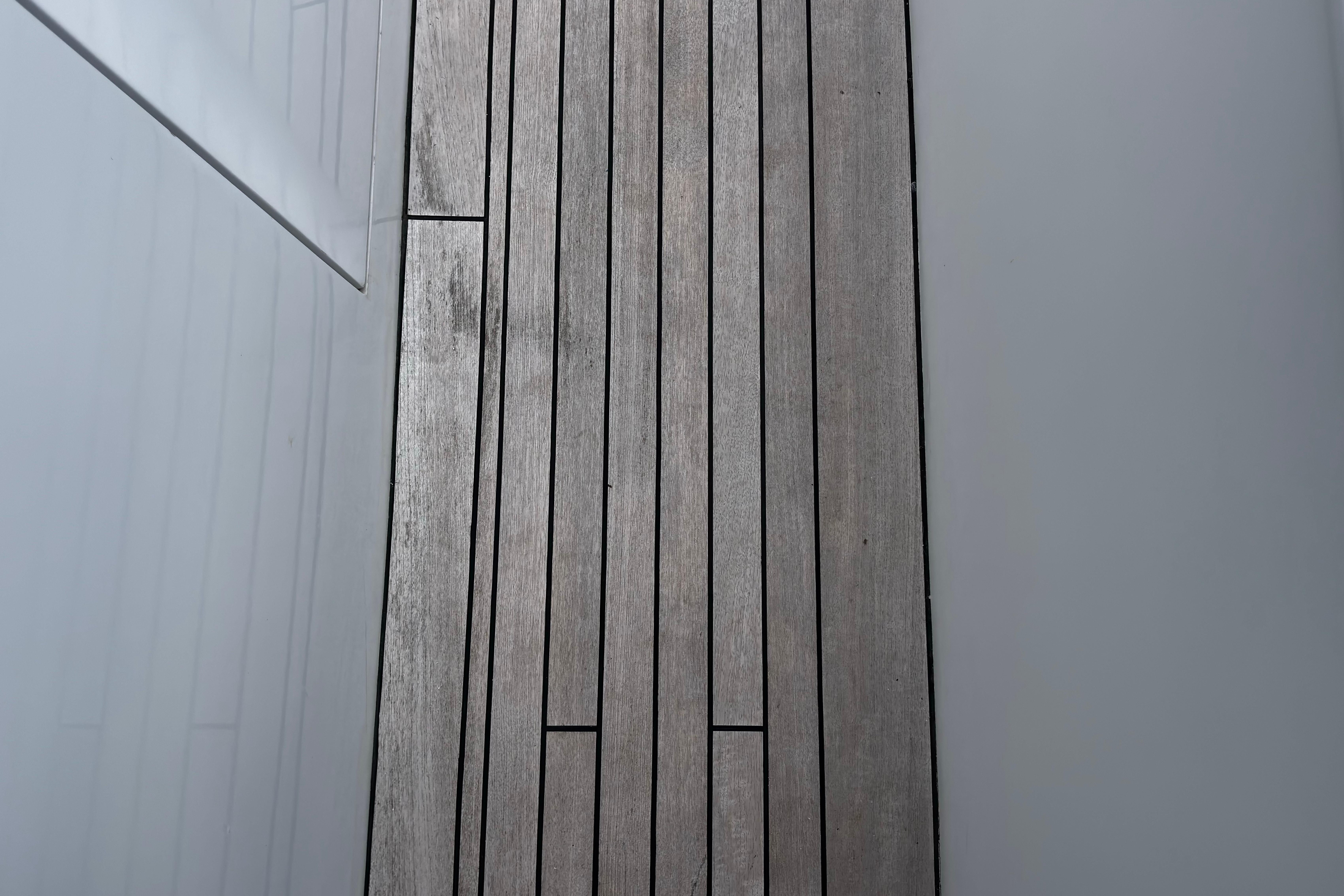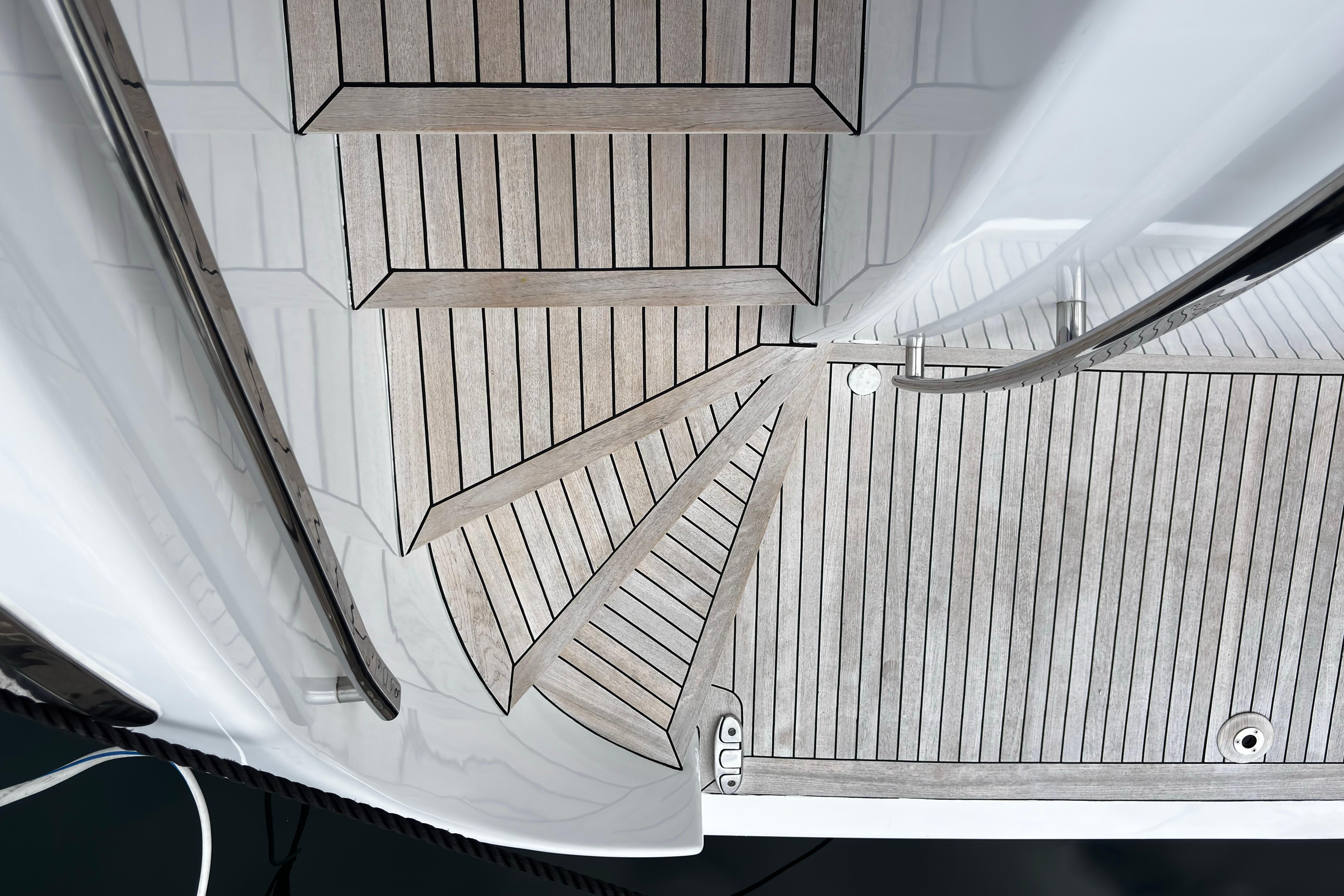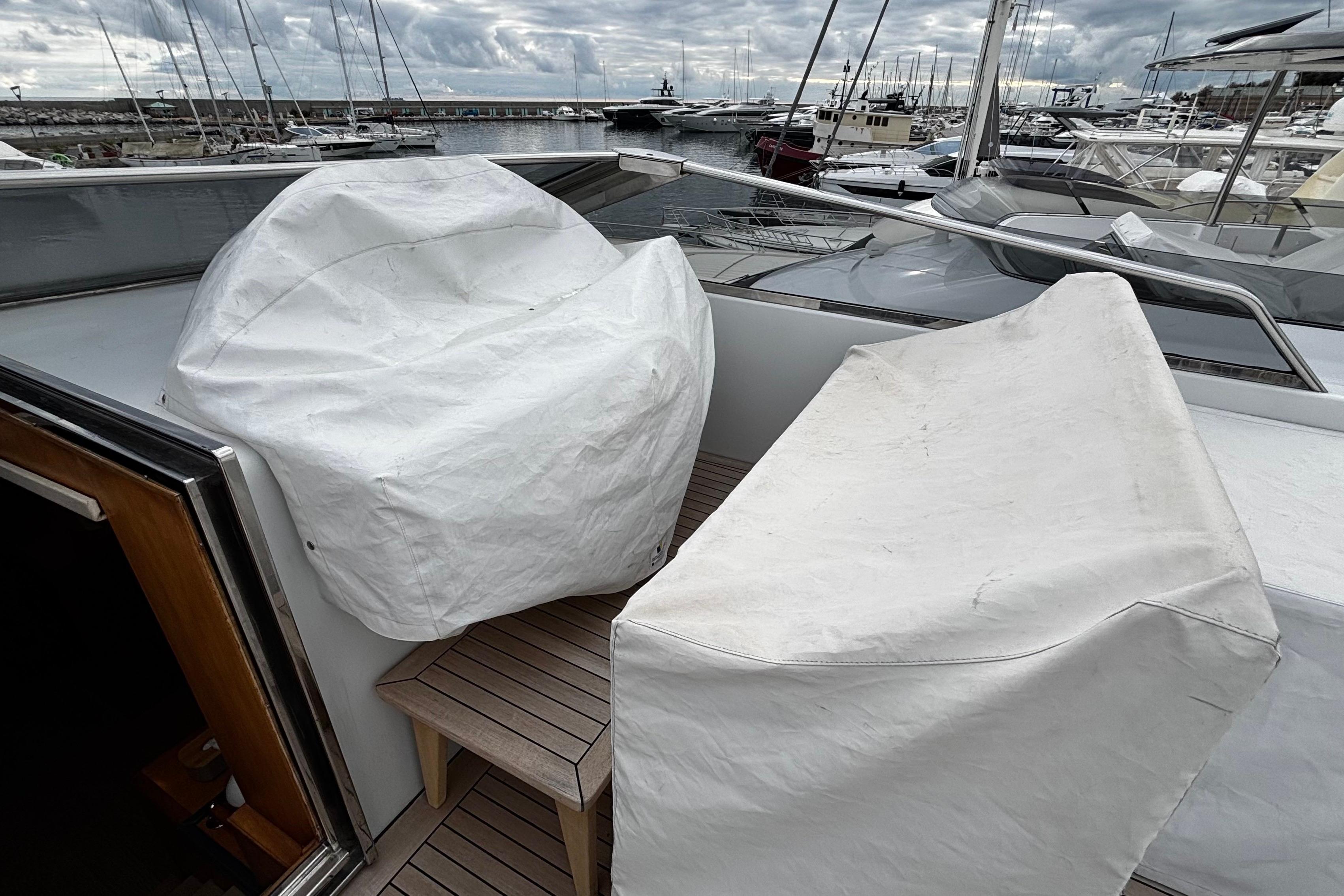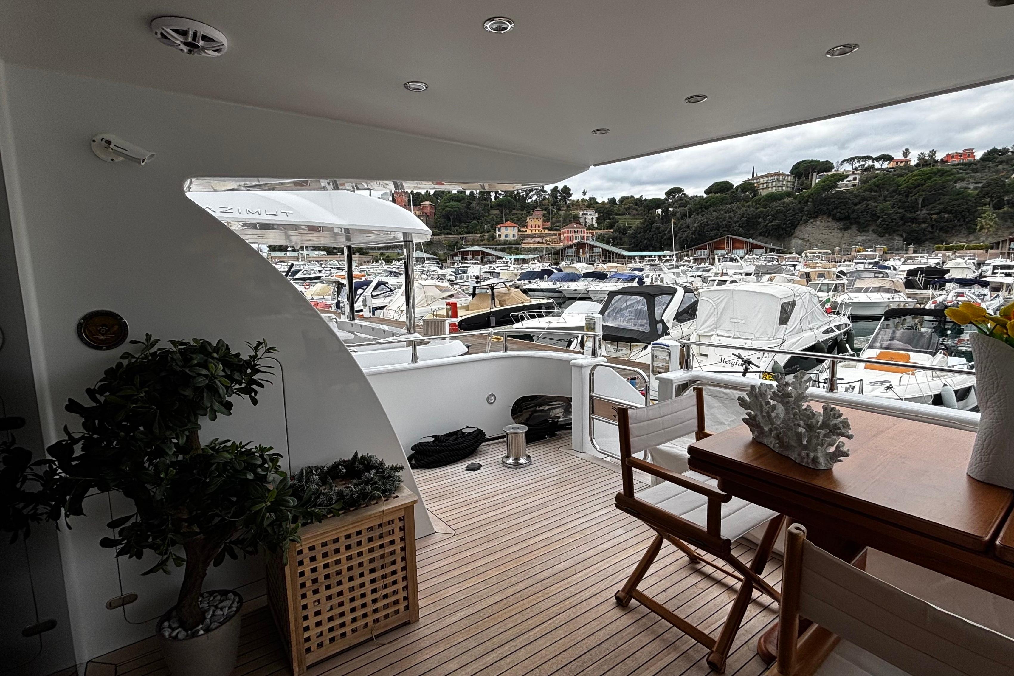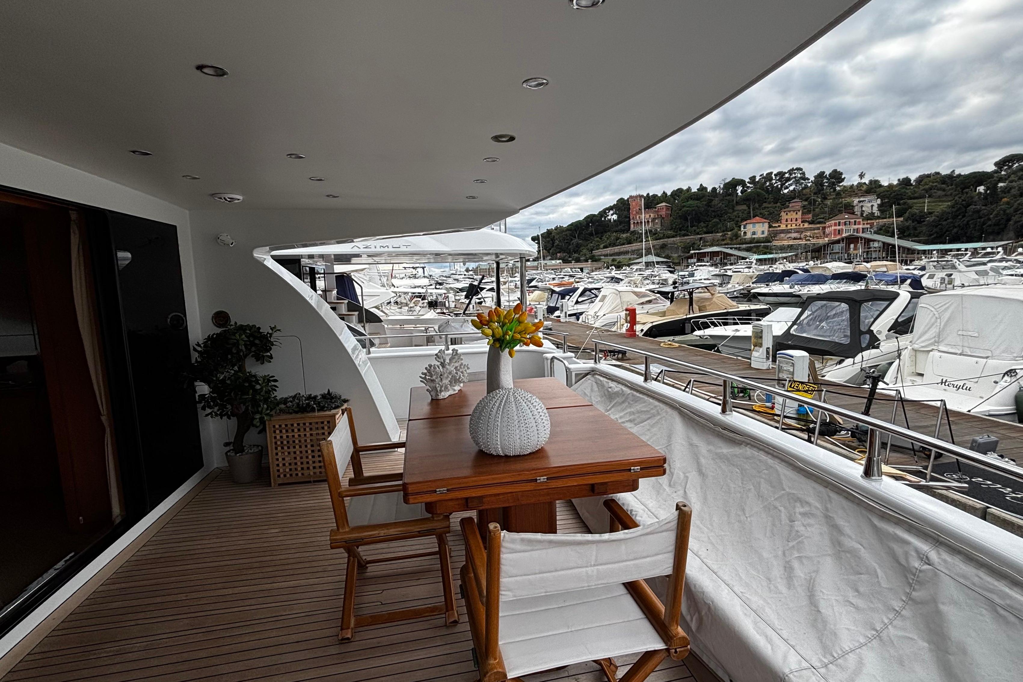 Ampio pozzetto in teak con tavolo pranzo, grande prendisole di prua, flybridge molto vivibile con zona living, tavolo e prendisole dedicati. Passerella, piattaforma di poppa, scaletta bagno elettrica e teli di copertura completano gli esterni.