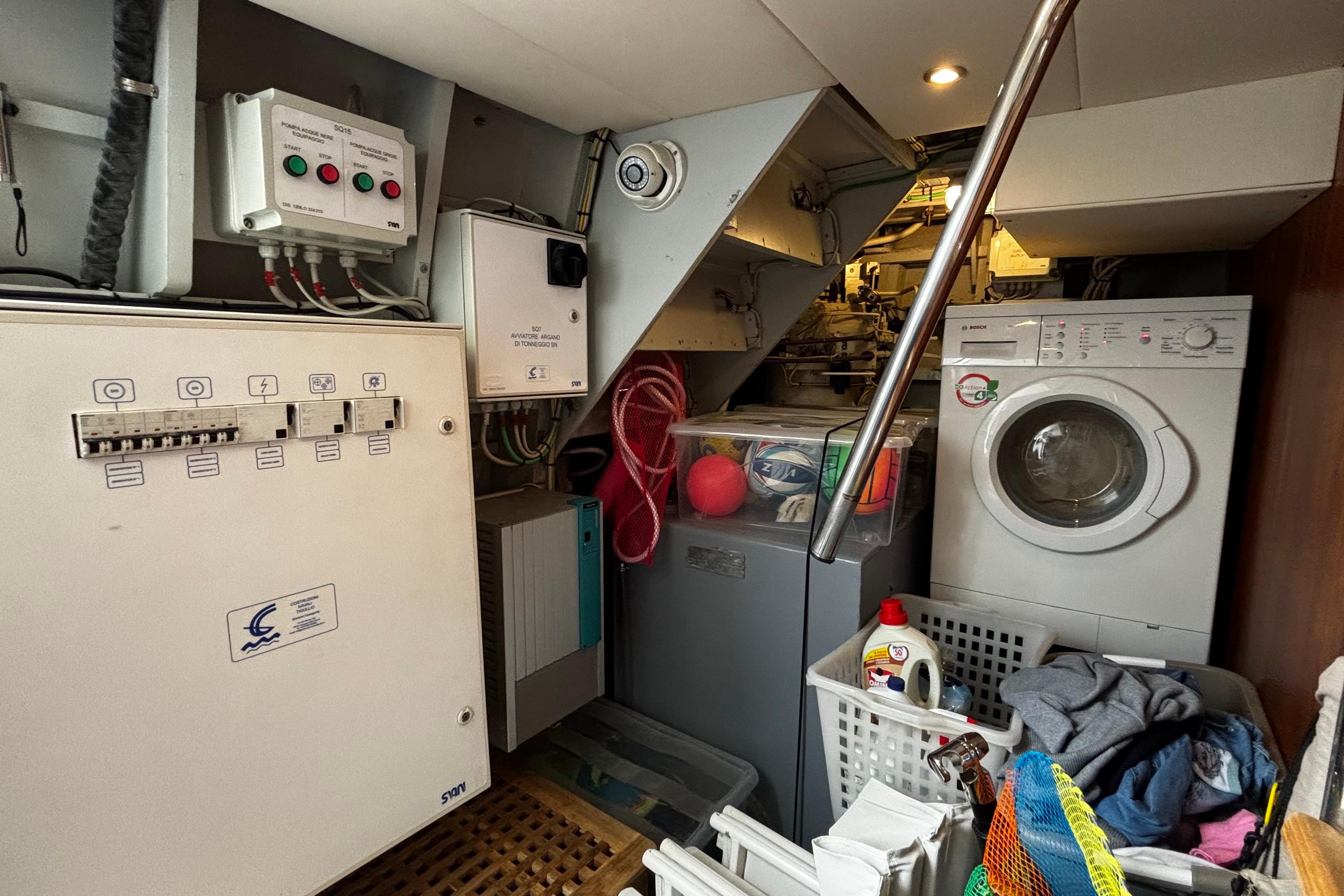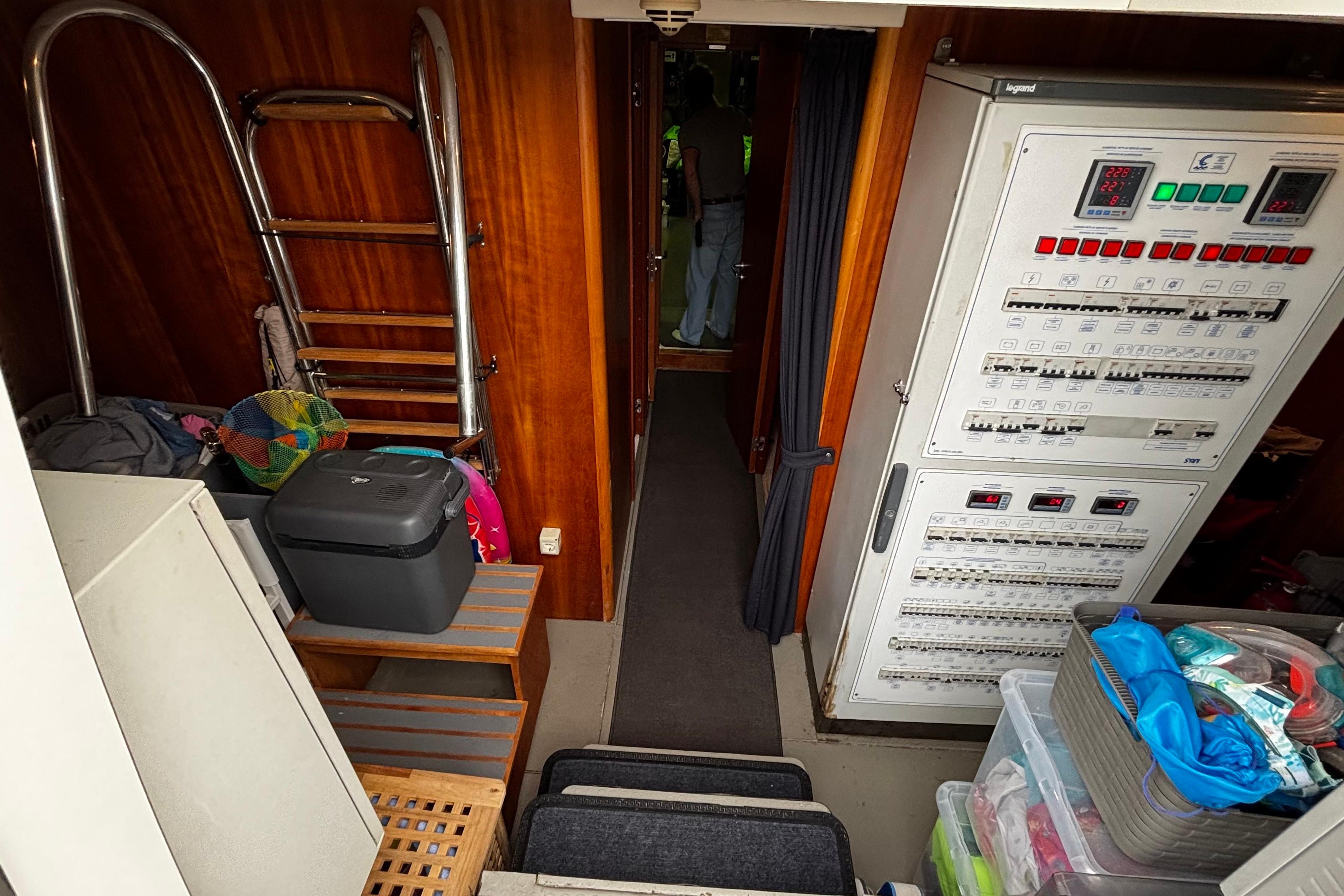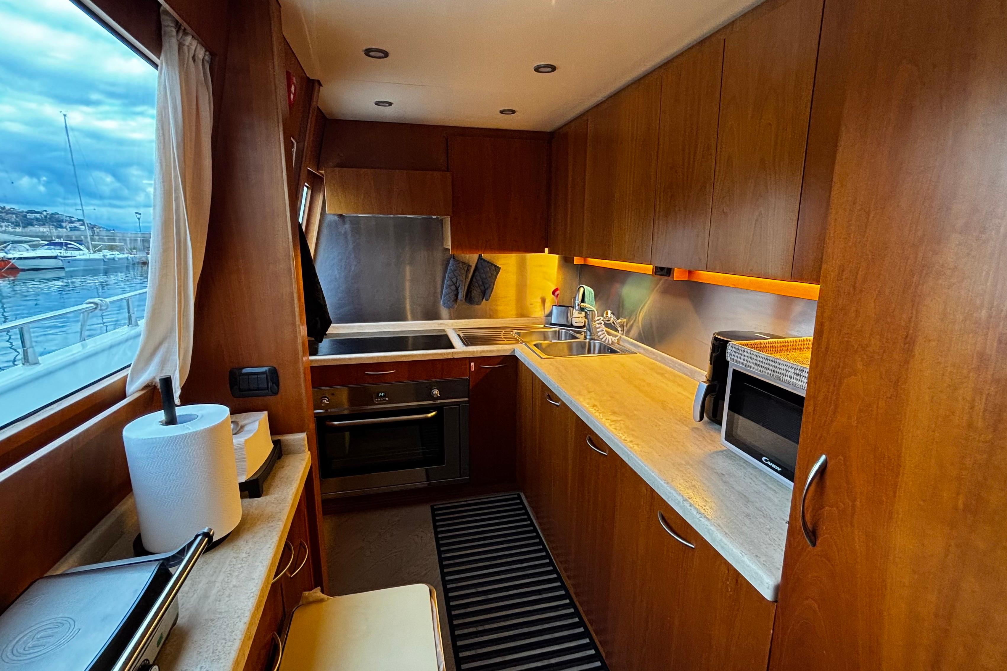 Interni luminosi, pavimenti in rovere, climatizzazione caldo/freddo in ogni ambiente, cucina completa con elettrodomestici domestici di fascia alta, numerosi frigoriferi interni ed esterni per lunghe permanenze a bordo.