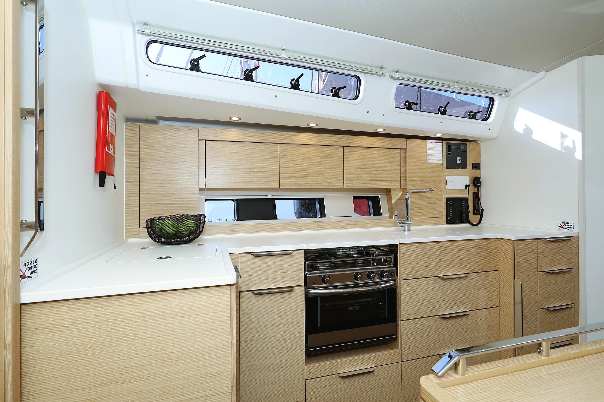 B3: Saloon with full functional L-galley on stb and dining area on port (only with C3 or C4 layout)