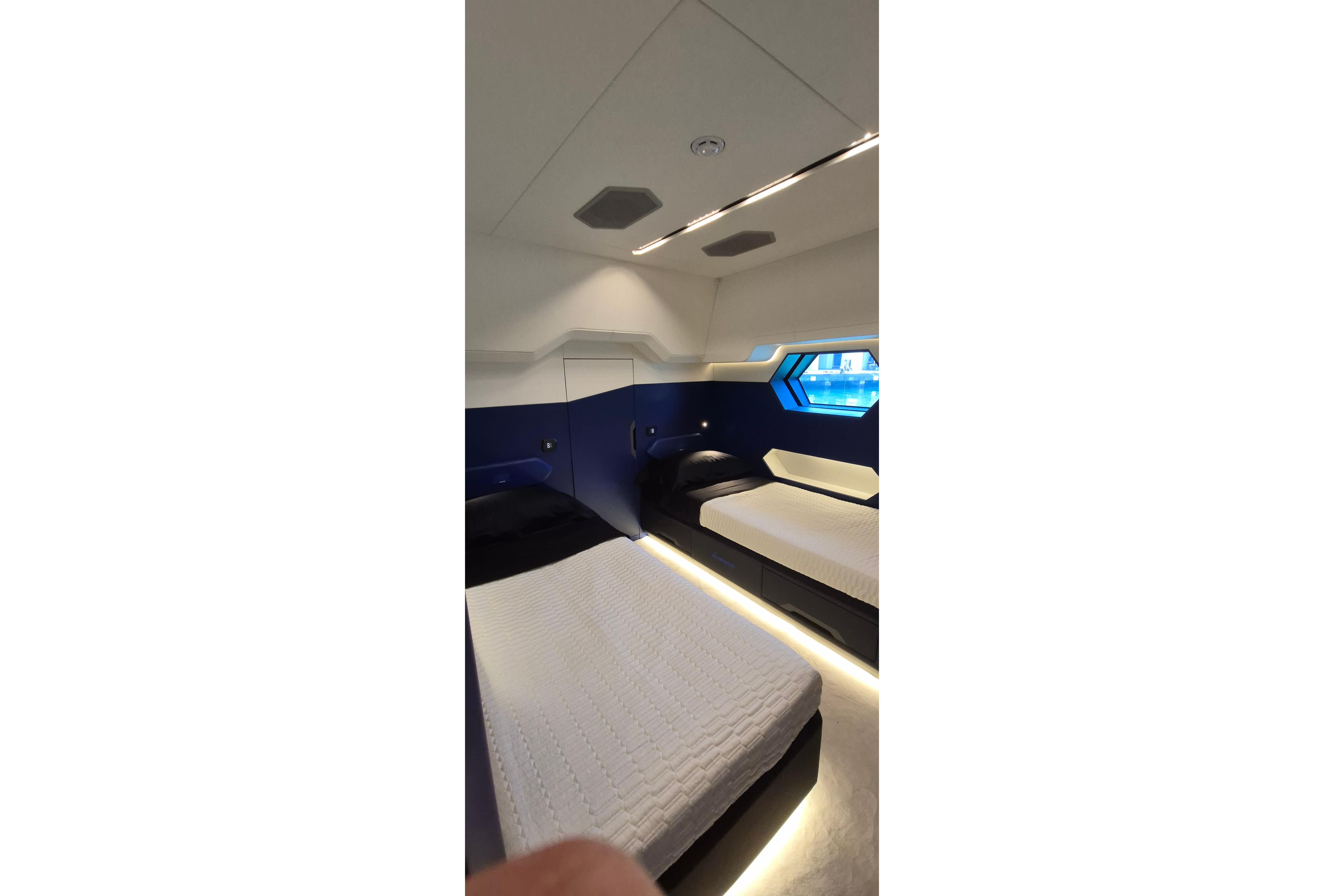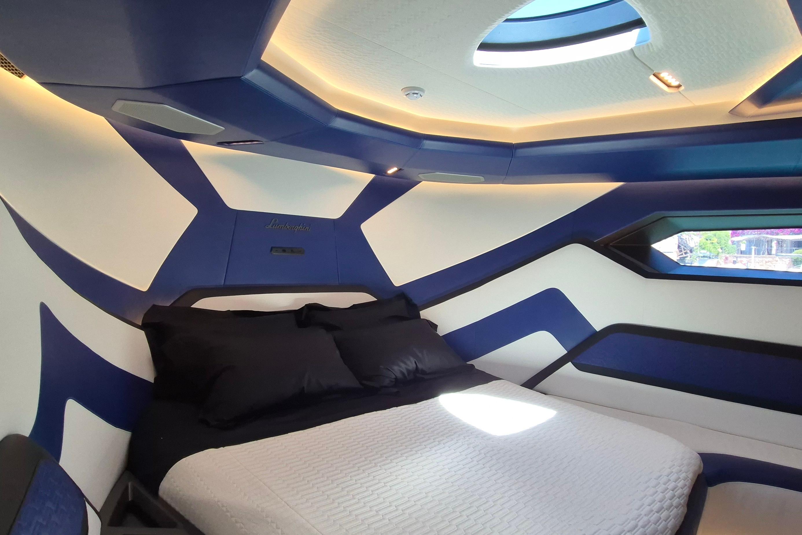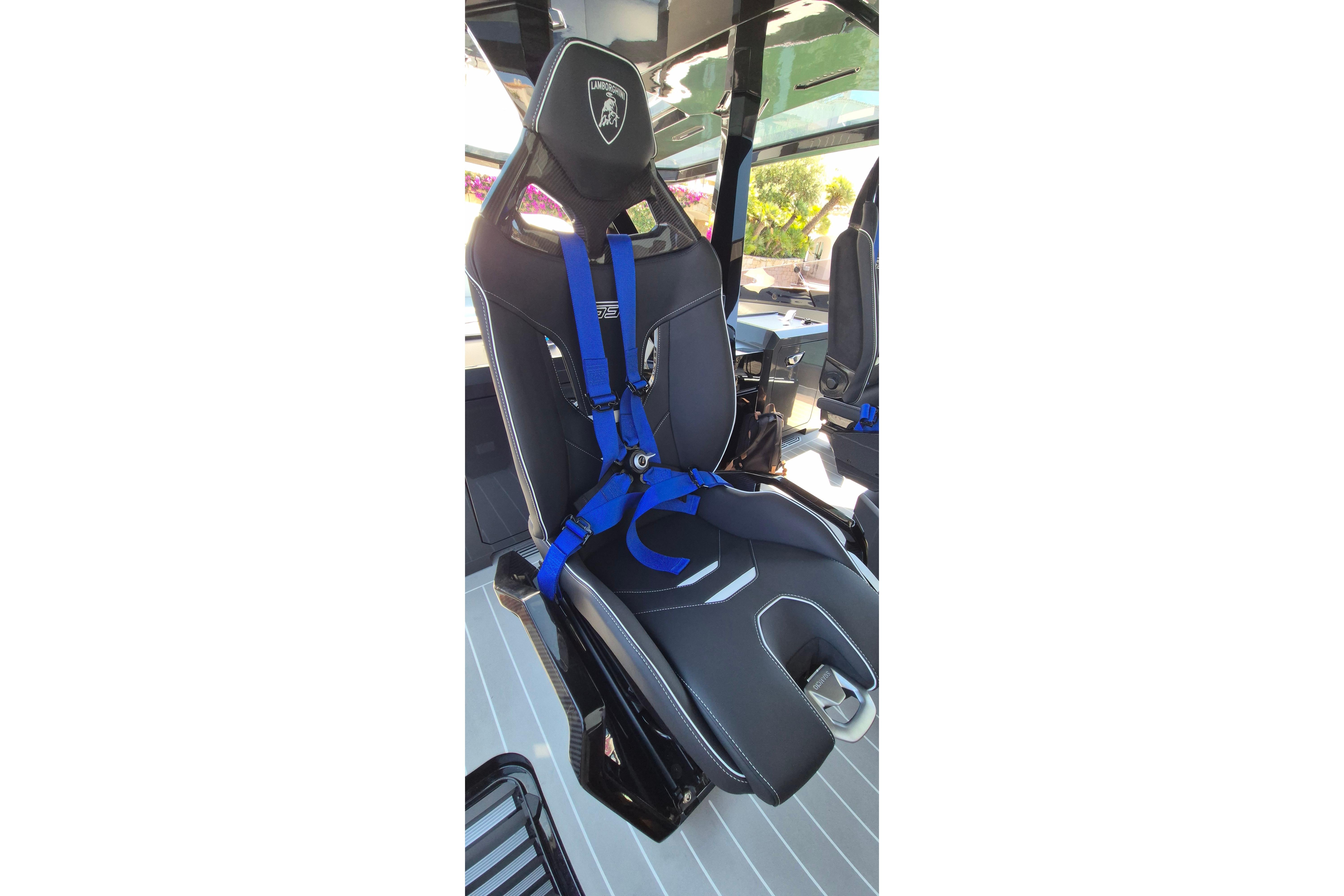 Hull 33 features a White & Black exterior with blue accents, paired with Huracán-style helm seats, creating a clear connection to Lamborghini’s automotive identity.