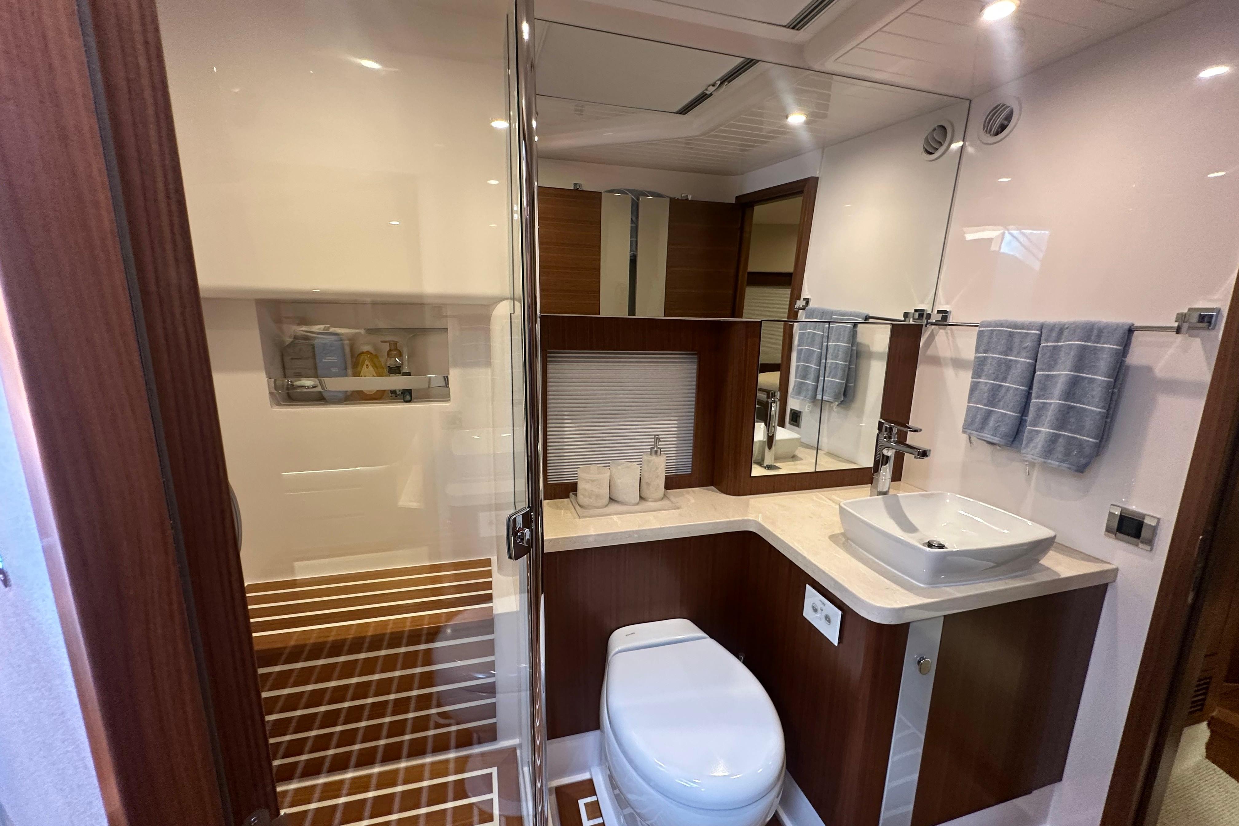 Powered by twin Volvo Penta D11 IPS 950 engines, each delivering 725 horsepower, this yacht promises exhilarating speed and efficiency with its advanced POD drive system.