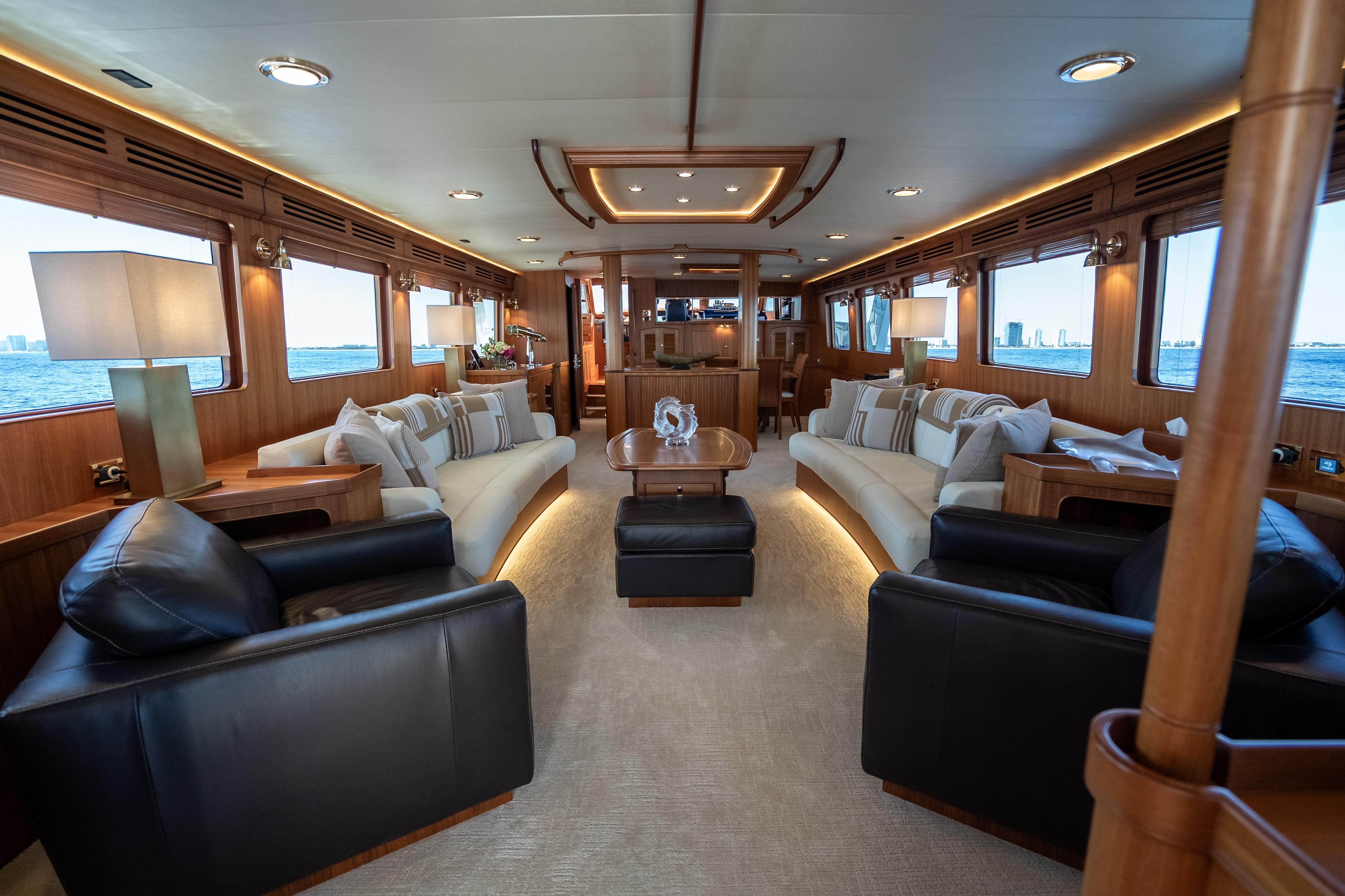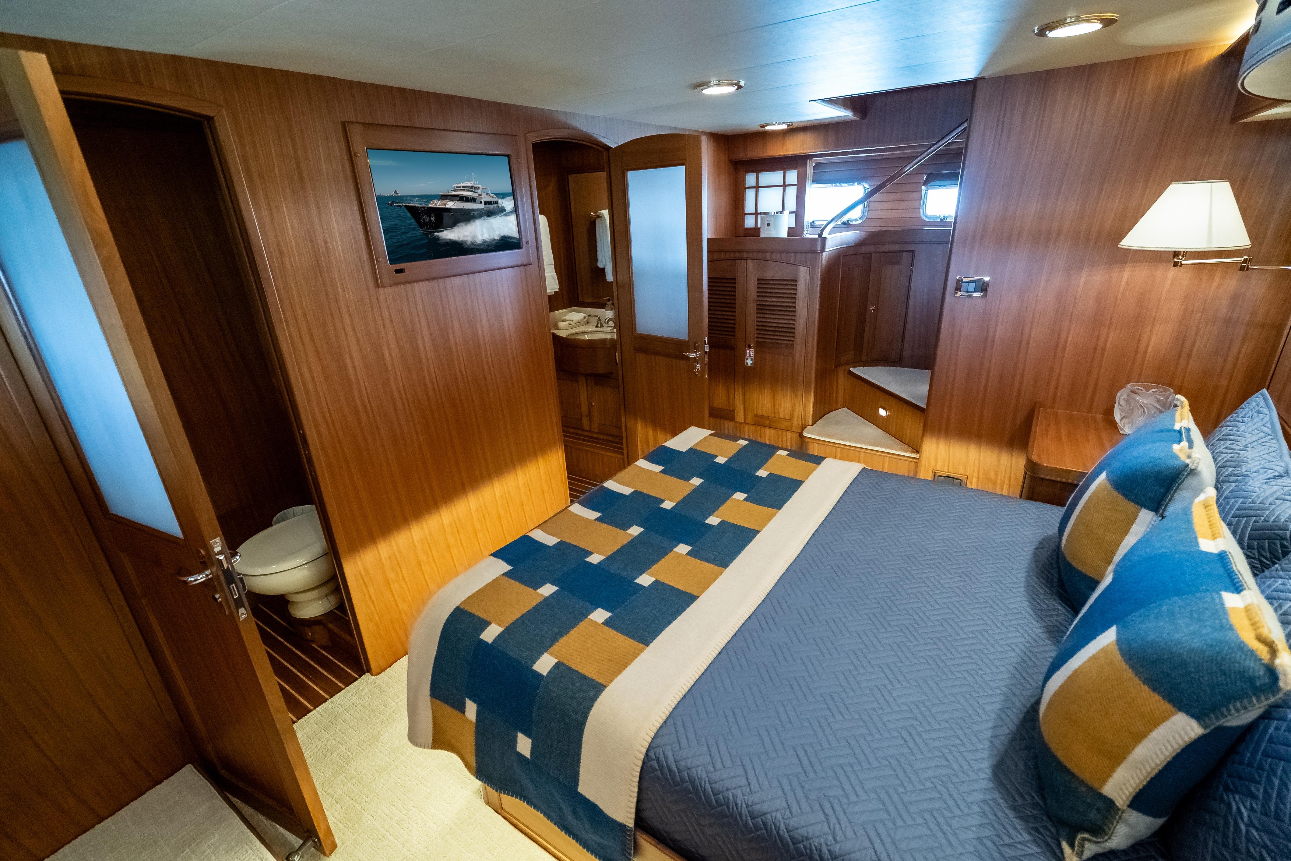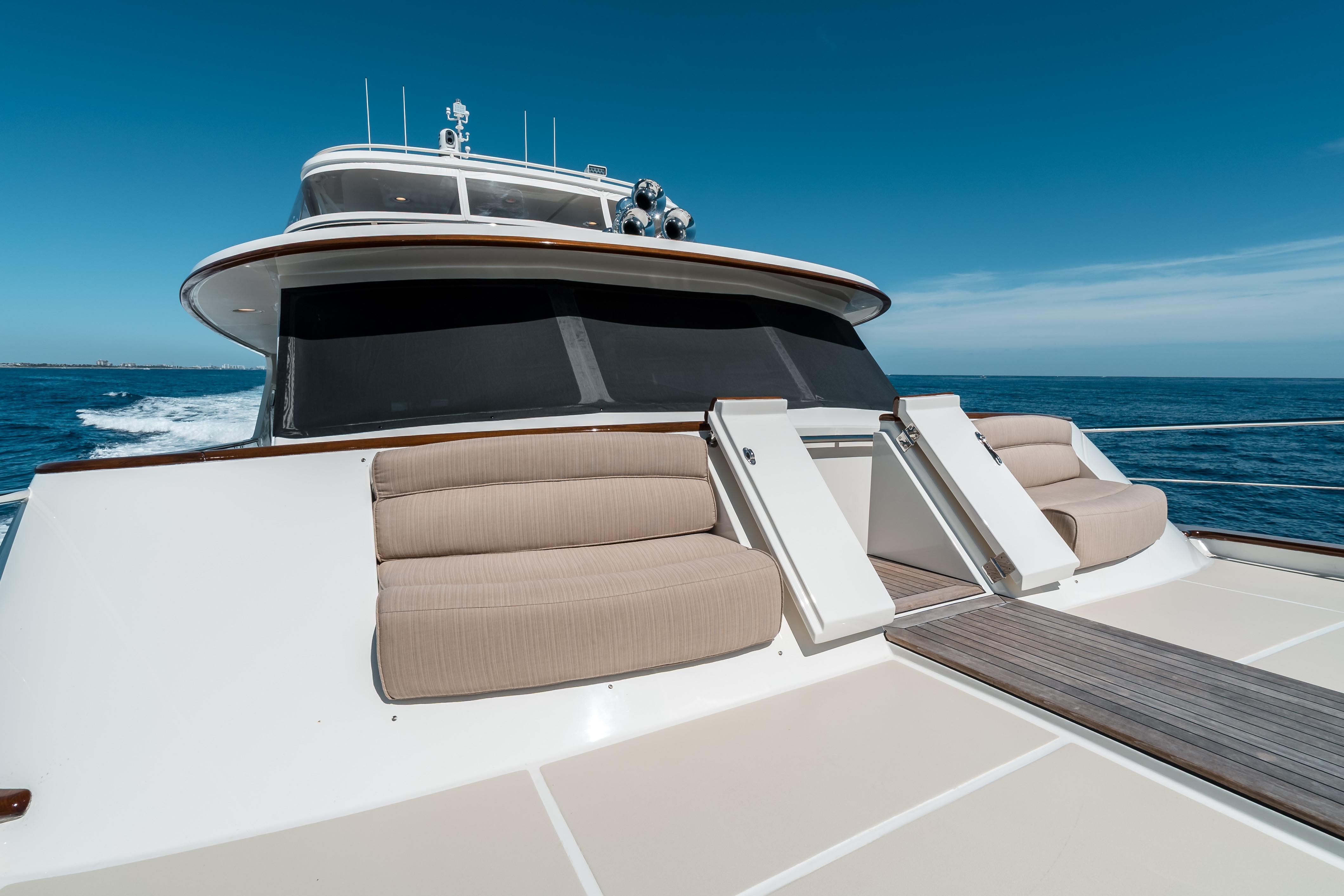 She has both the preferred open flybridge arrangement with upper and lower helms as well as the 4 cabin layout with two full-beam staterooms.The fully serviced CAT C32s provide a 20-knot cruise and top speed of 25 knots.