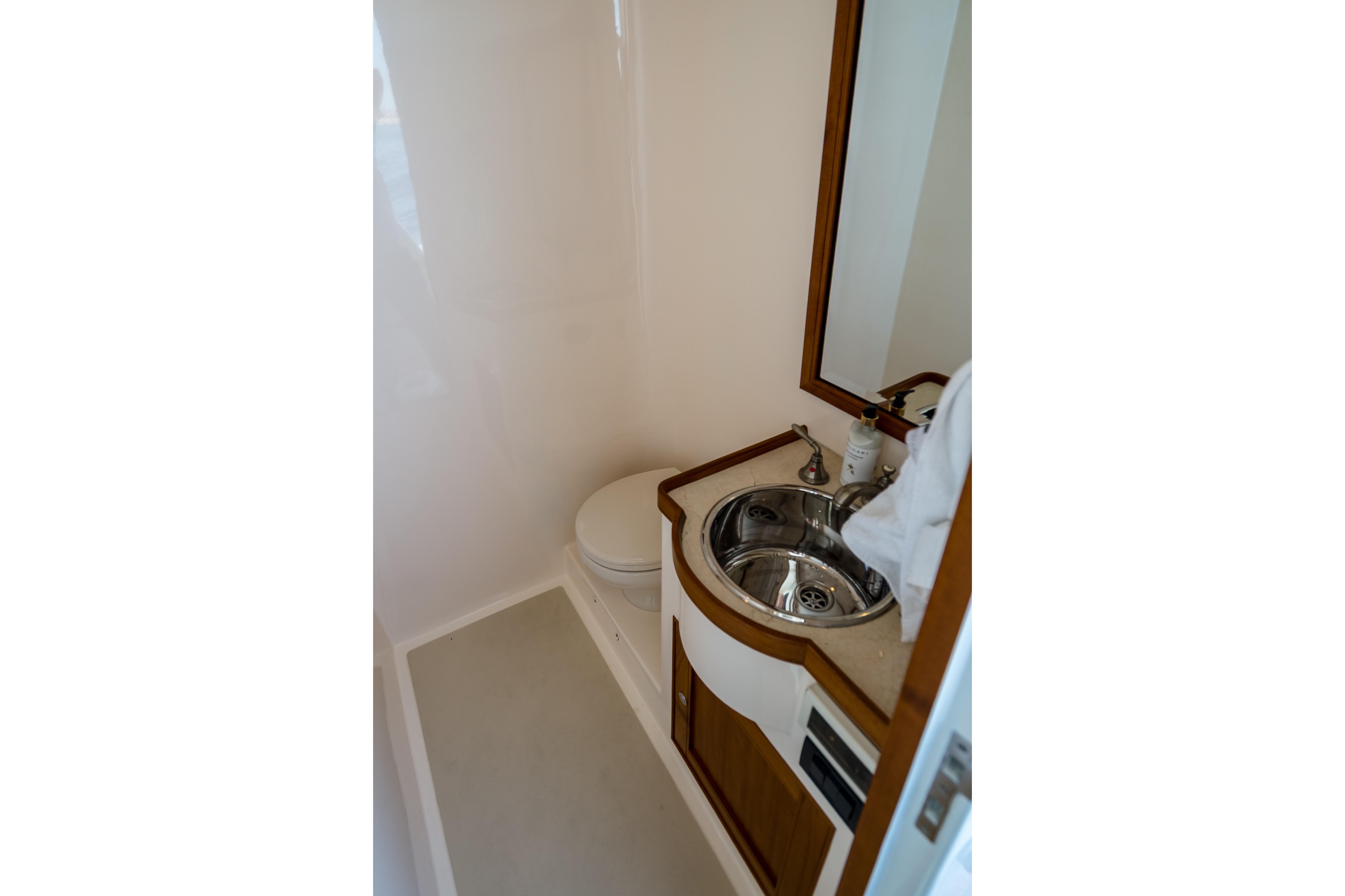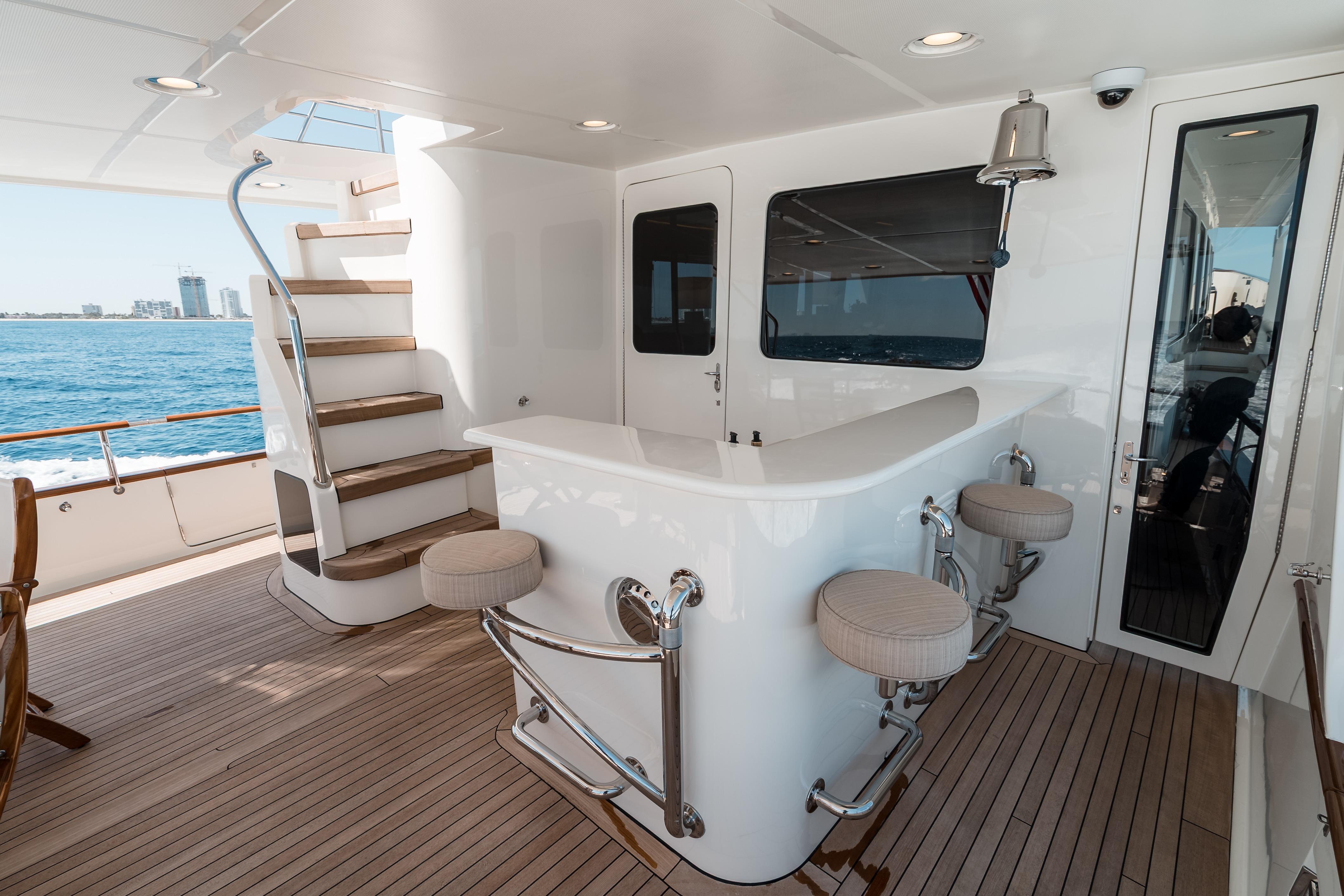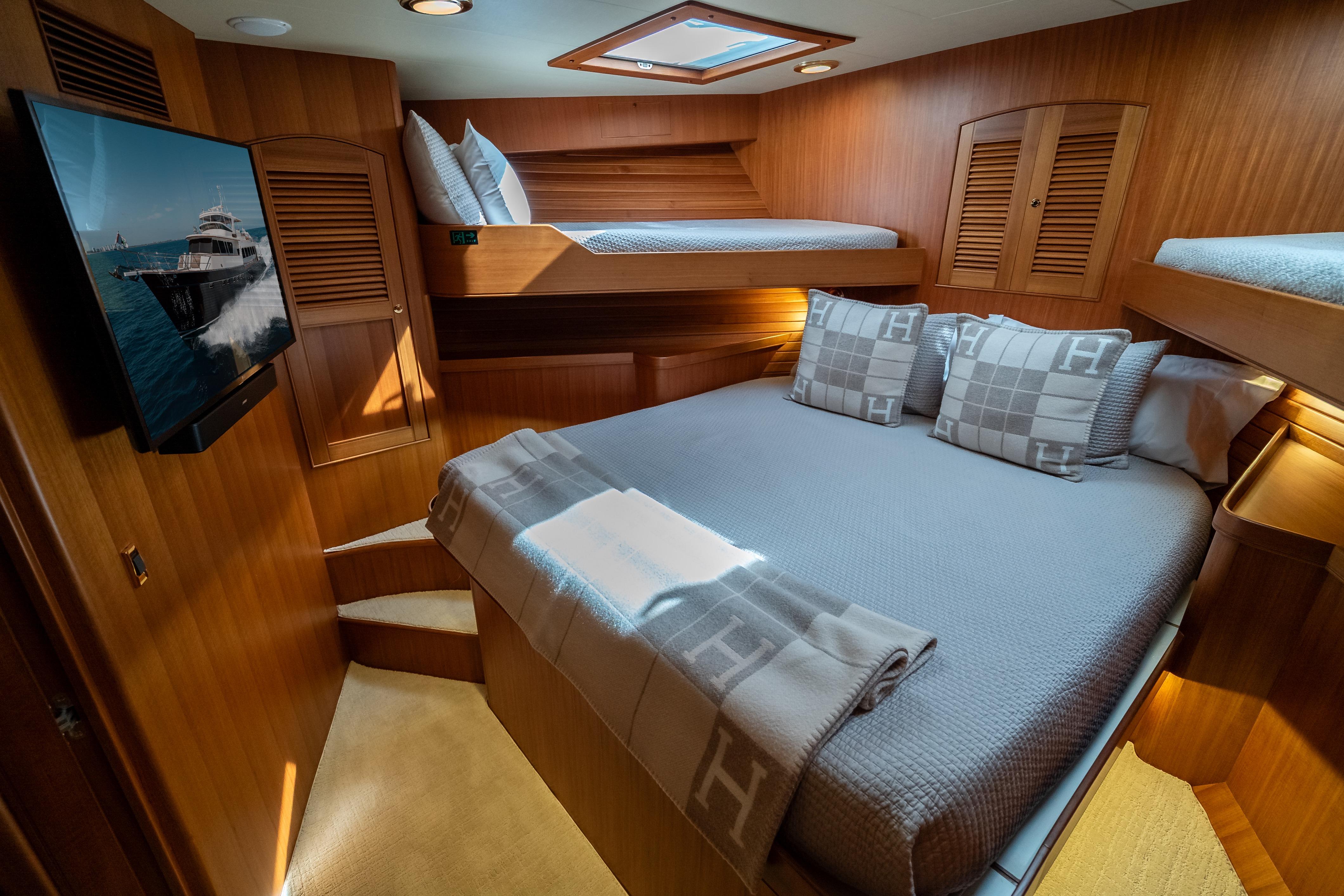 She has both the preferred open flybridge arrangement with upper and lower helms as well as the 4 cabin layout with two full-beam staterooms.The fully serviced CAT C32s provide a 20-knot cruise and top speed of 25 knots.