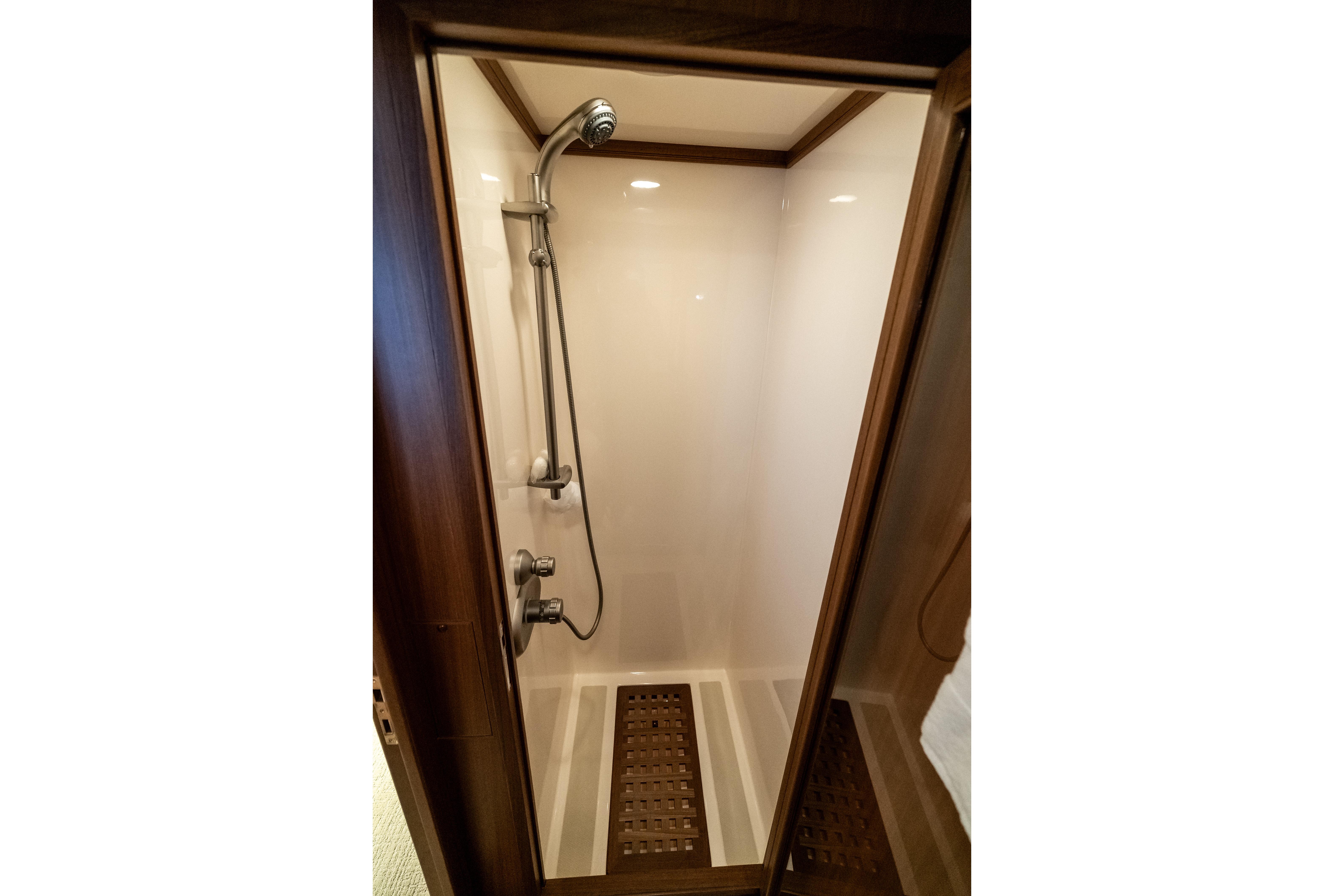 Moving forward you step into the crew area with twin bunks to starboard and a single bunk to port. There is a dining table and settee in this area. The Crew has a separate head/shower forward to starboard. There is a microwave for the crew and a deep freezer under bunk.