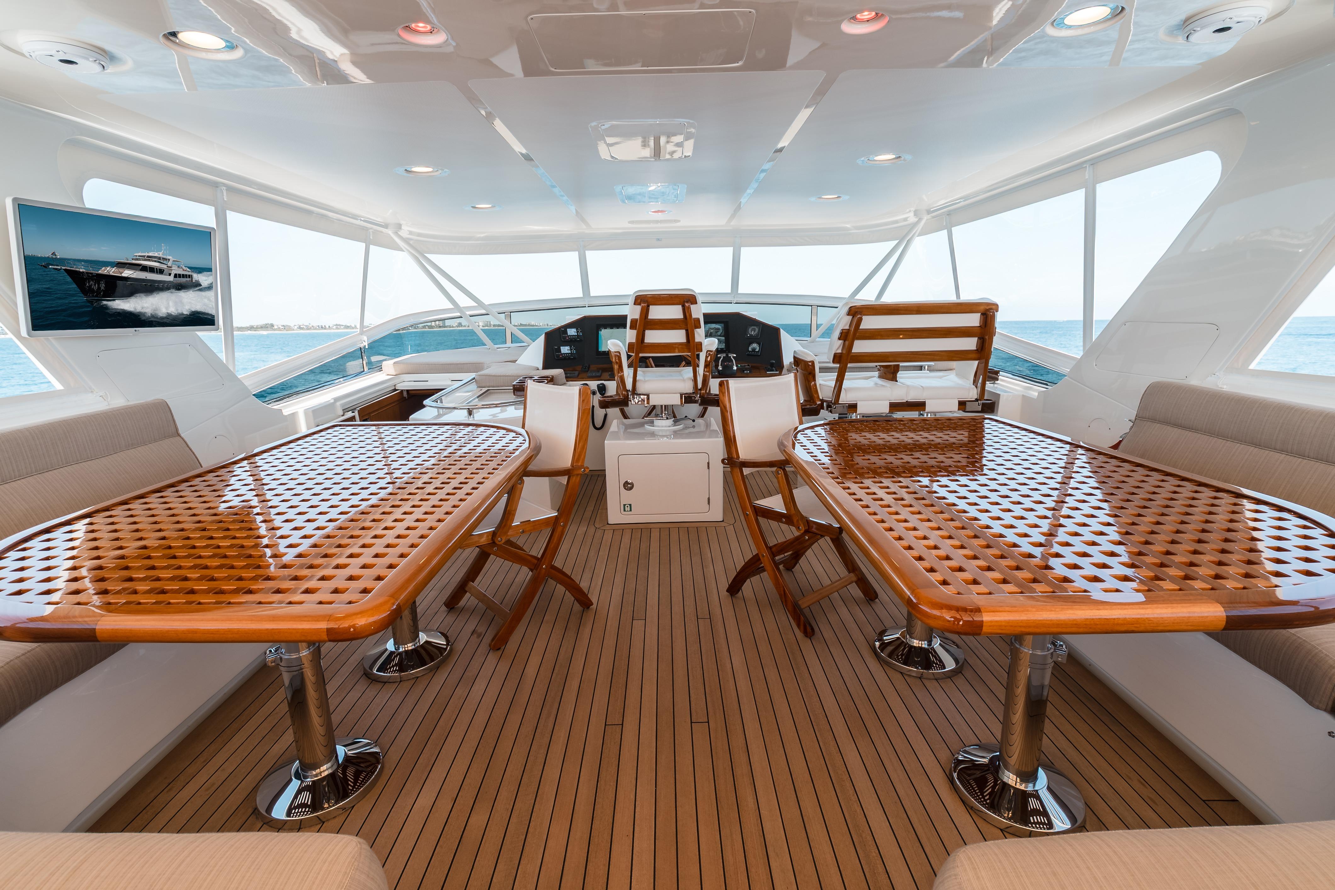 When you step aboard the large aft deck, you are greeted by an elegant outdoor living area. There is a large teak inlaid table with comfortable seating for 8 people.