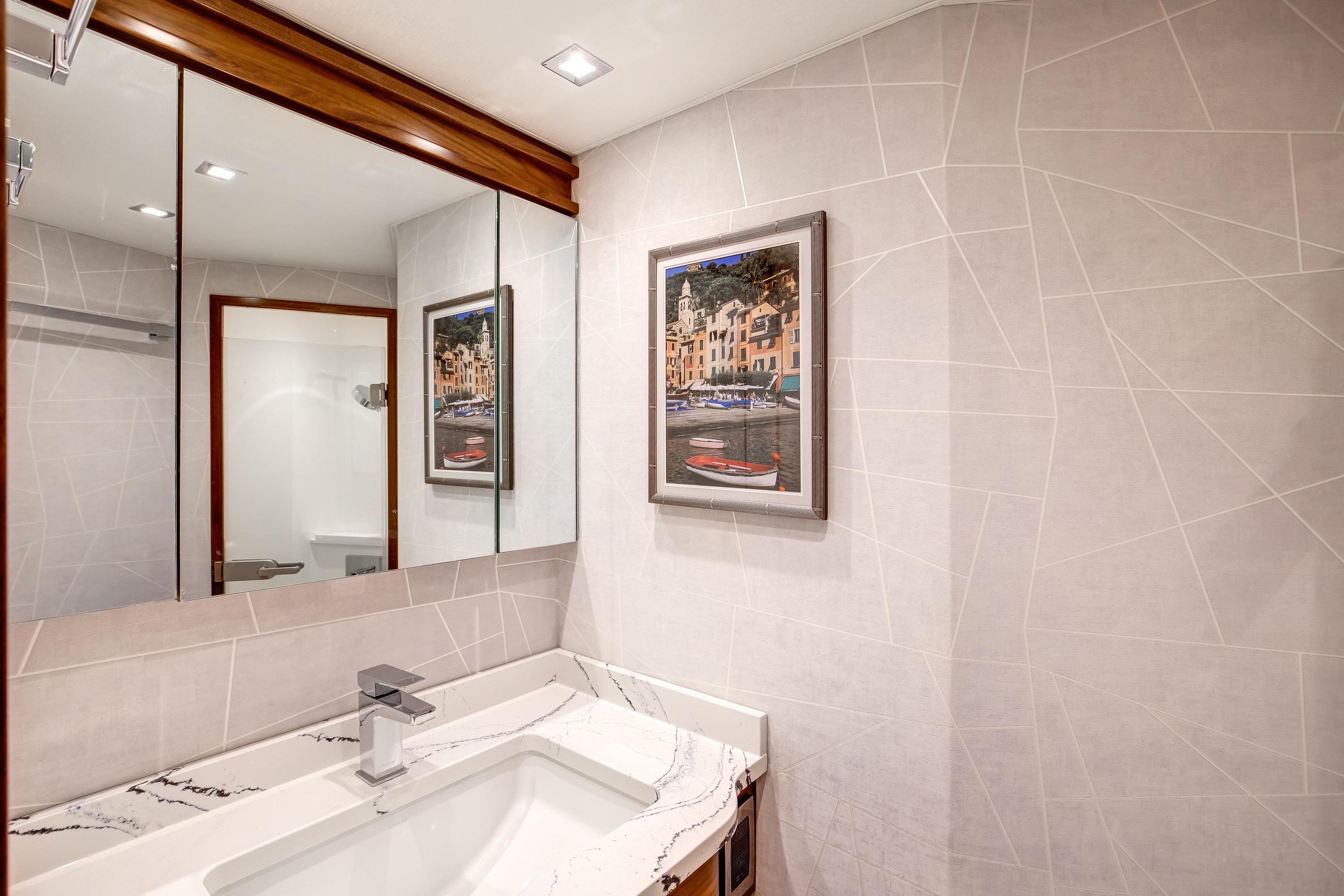 - Mirrored wall behind upper vanity, medicine cabinet with mirrored doors