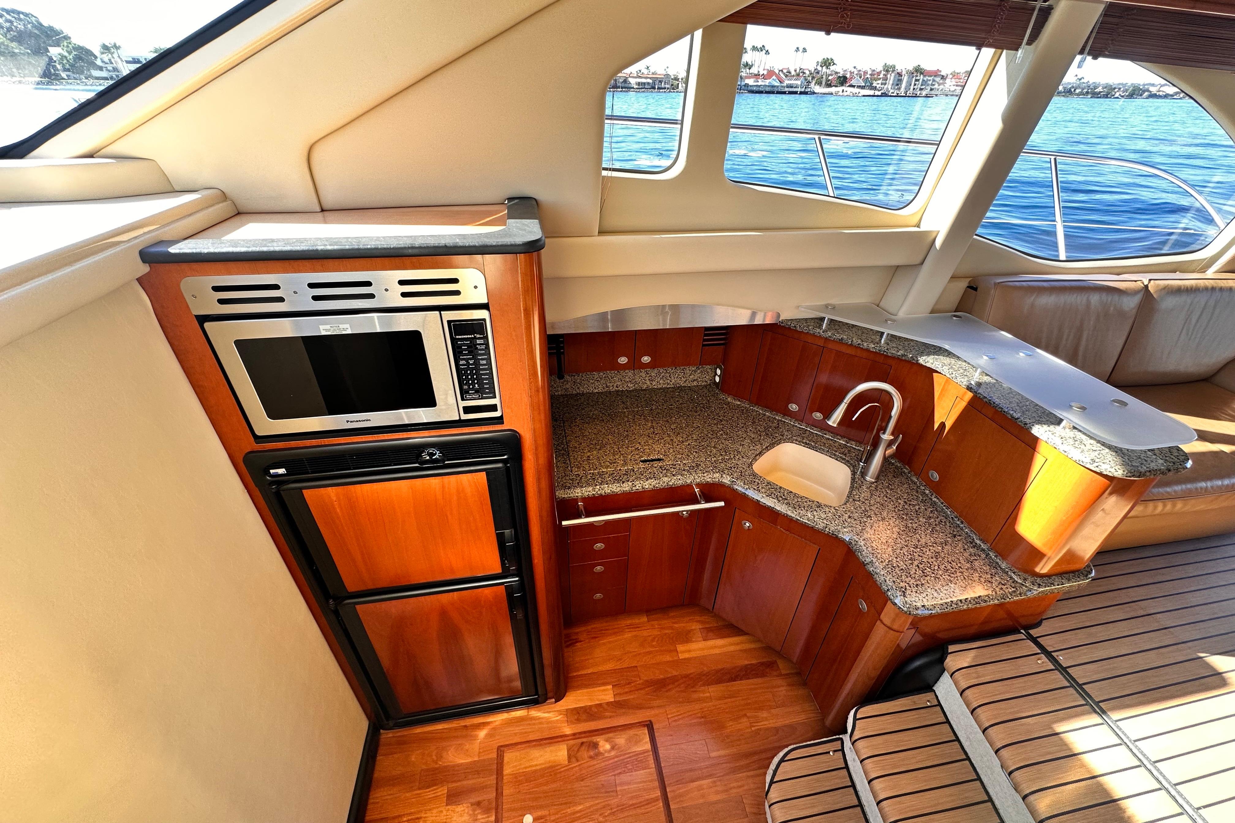 Stepping into the cockpit onto the Flexiteek decking, you’ll find storage beneath the molded settee side compartments. A Norcold refrigerator with a small freezer is situated under the stairway leading up to the flybridge.