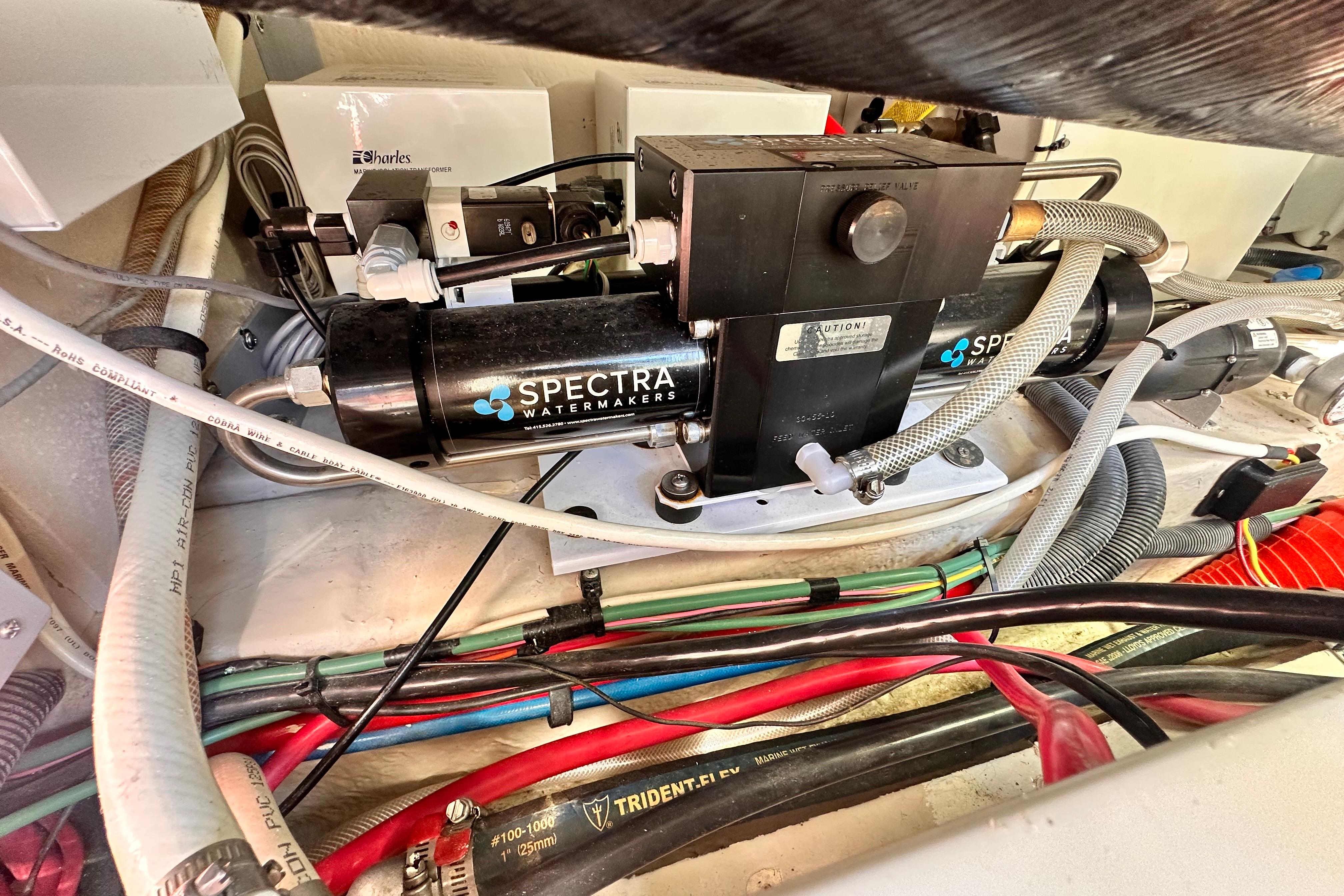 ForedeckIt is set up for a Brower davit system; although the davit itself has been removed for unknown reasons, the cradle, mount, and controls remain in place. The vessel comes with a Zodiac Yachtline 340 tender powered by a Yamaha four-stroke outboard.