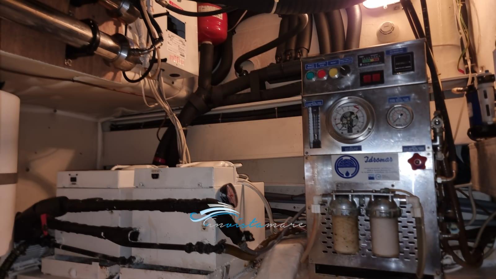 Allarme motore, Allarme sentina, Ancora, Autoclave, 2 Autogonfiabile, Batterie, Doppia timoneria, Faro orientabile, Flap idraulici (N°2), Impianto antincendio, Lavaggio catena, Lavandino nel Pozzetto, Luci di cortesia, Passerella (IDRAULICA), Piattaforma, Pompa di sentina automatica, Porta ingresso, Presa 220V banchina, Presa acqua banchina, Raddrizzatore, Tromba, Winch tonneggio di poppa.