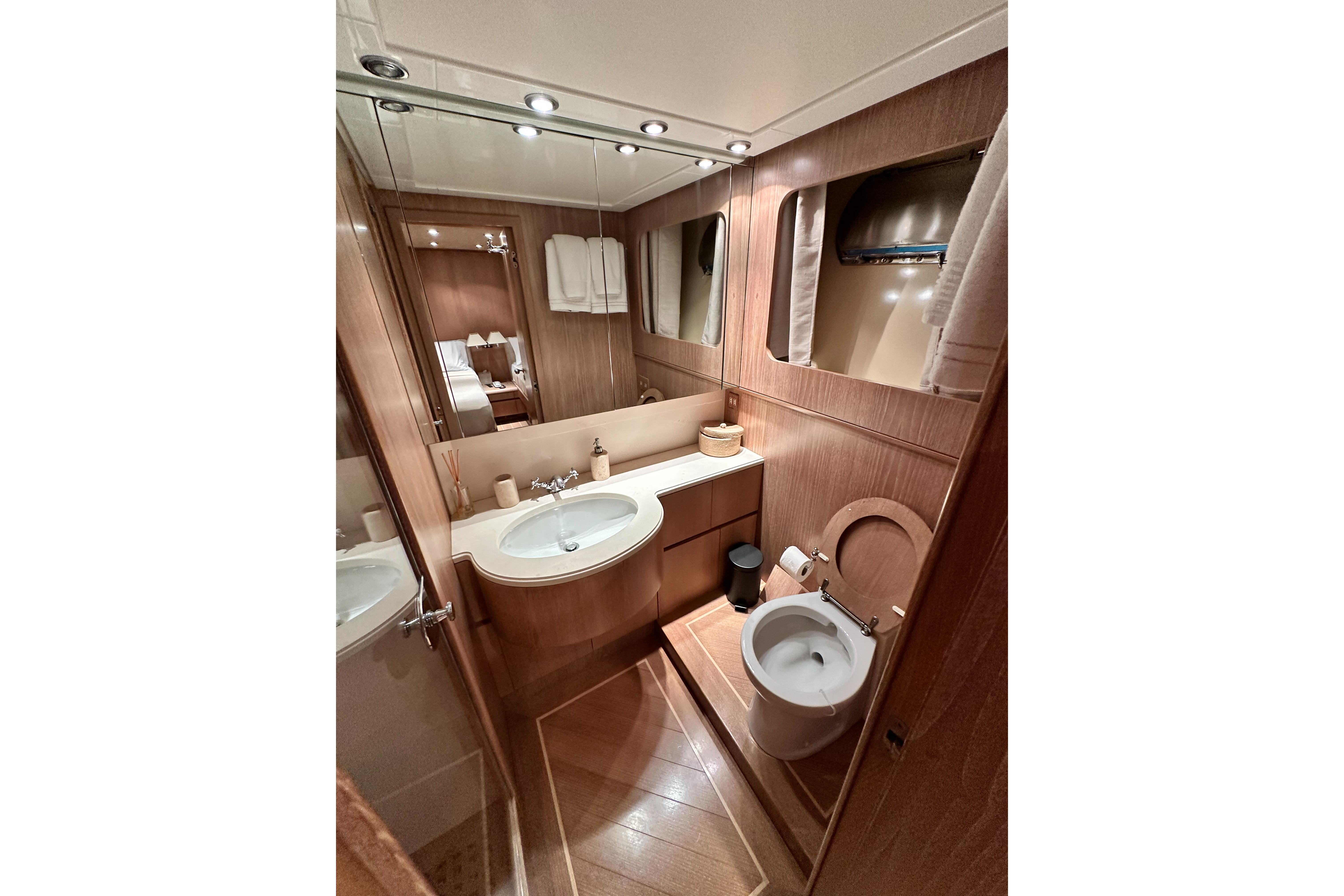 Her four-cabin layout accommodates eight guests in comfort, featuring a spacious full-beam Master, a well-appointed VIP cabin, and two guest cabins—one newly convertible to double. All interiors have been refreshed with new upholstery, mattresses, headboards, soft goods, Smart TVs, and an upgraded Wi-Fi and Starlink setup. New sunshades, Alcantara ceilings, and updated furnishings further elevate her contemporary feel.