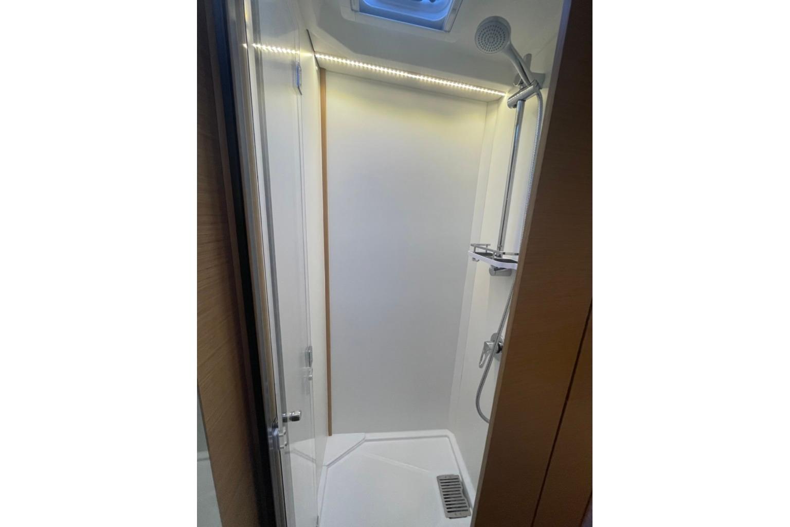 However, it’s the forward stateroom where this boat really sets itself apart. The square queen bed has plenty of space to walk around on all sides, and the large central armoire is perfect for mounting a television for viewing in bed. The gorgeous shower stall is placed on centerline, allowing for 6’6” headroom; a luxury usually only found on much larger boats.