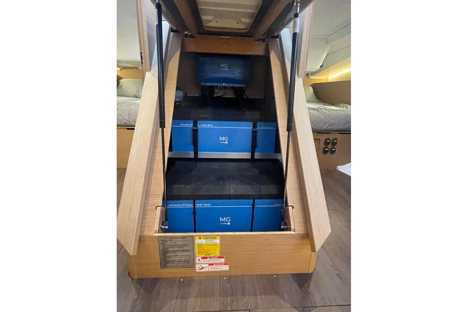 Electric propulsion system: 1076 lbs: The ServoProp 15 weighs 143 lbs. There are 8 MG batteries that weigh 116 lbs each (total 933 lbs). This system also replaced house batteries so the system total is 1076 lbs.
