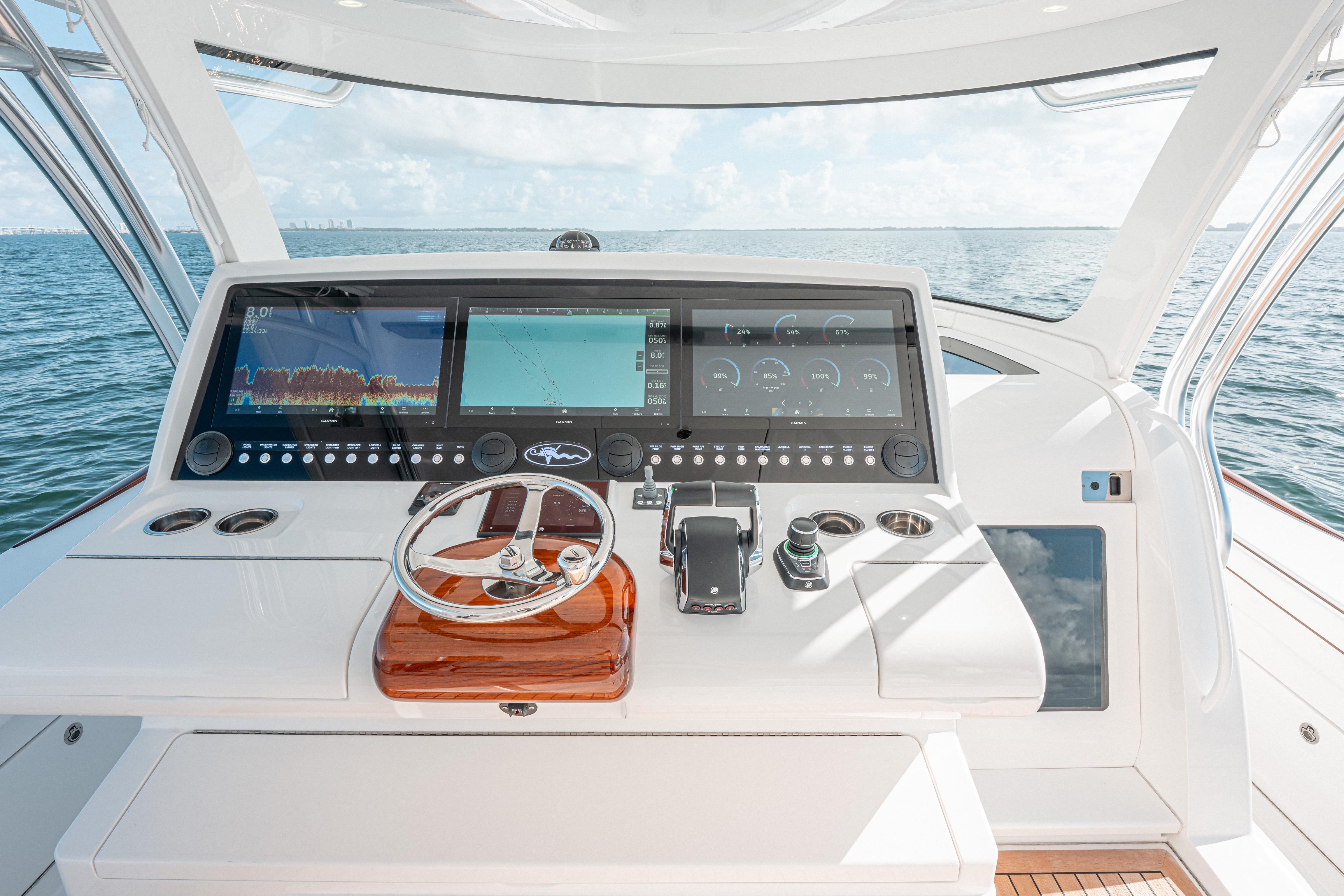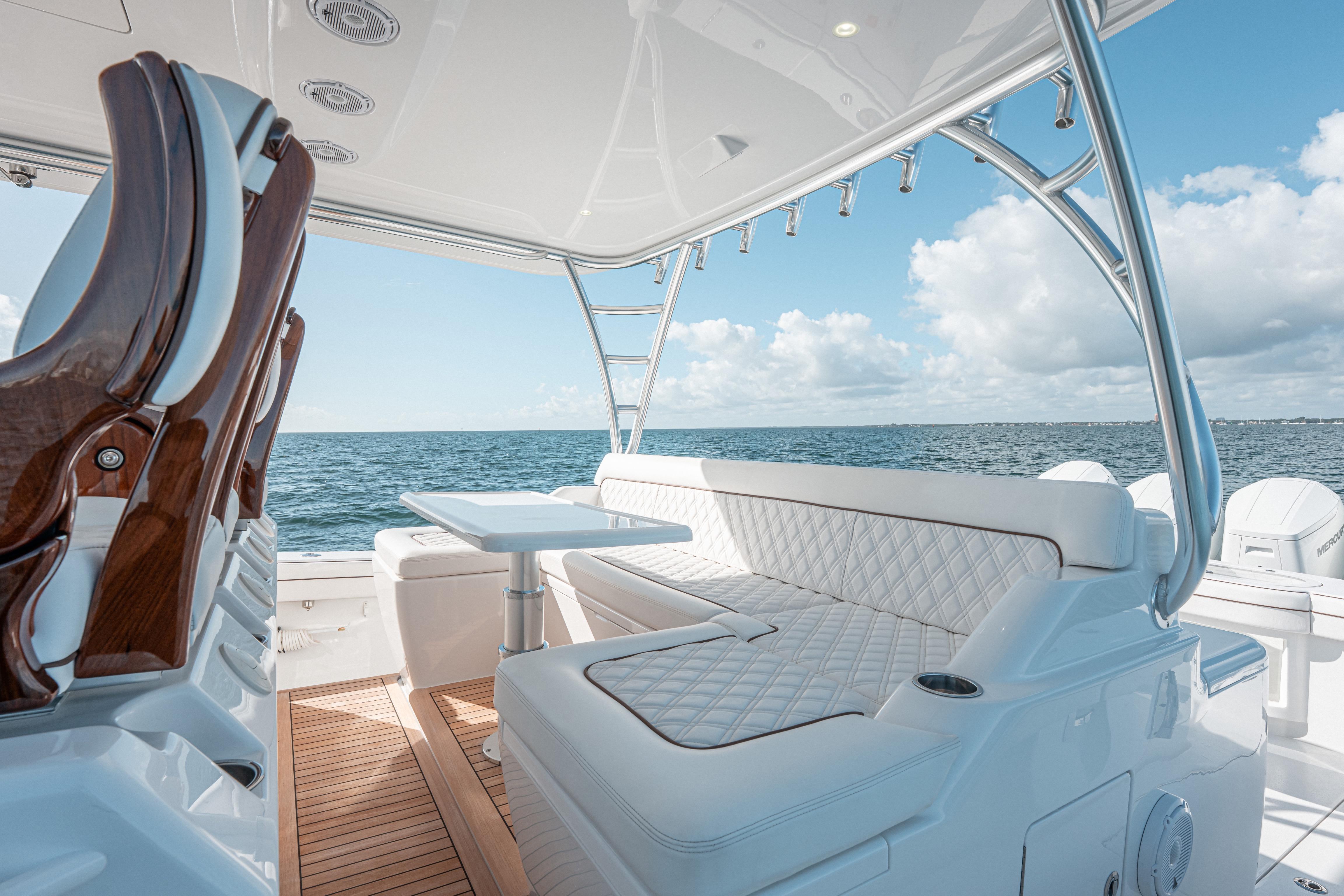 Anglers will appreciate the tournament-ready layout, featuring massive fish boxes, dual livewells, mezzanine seating with tackle storage, and a full suite of high-end electronics. The open deck allows effortless 360° fishability while still providing generous seating for guests.
