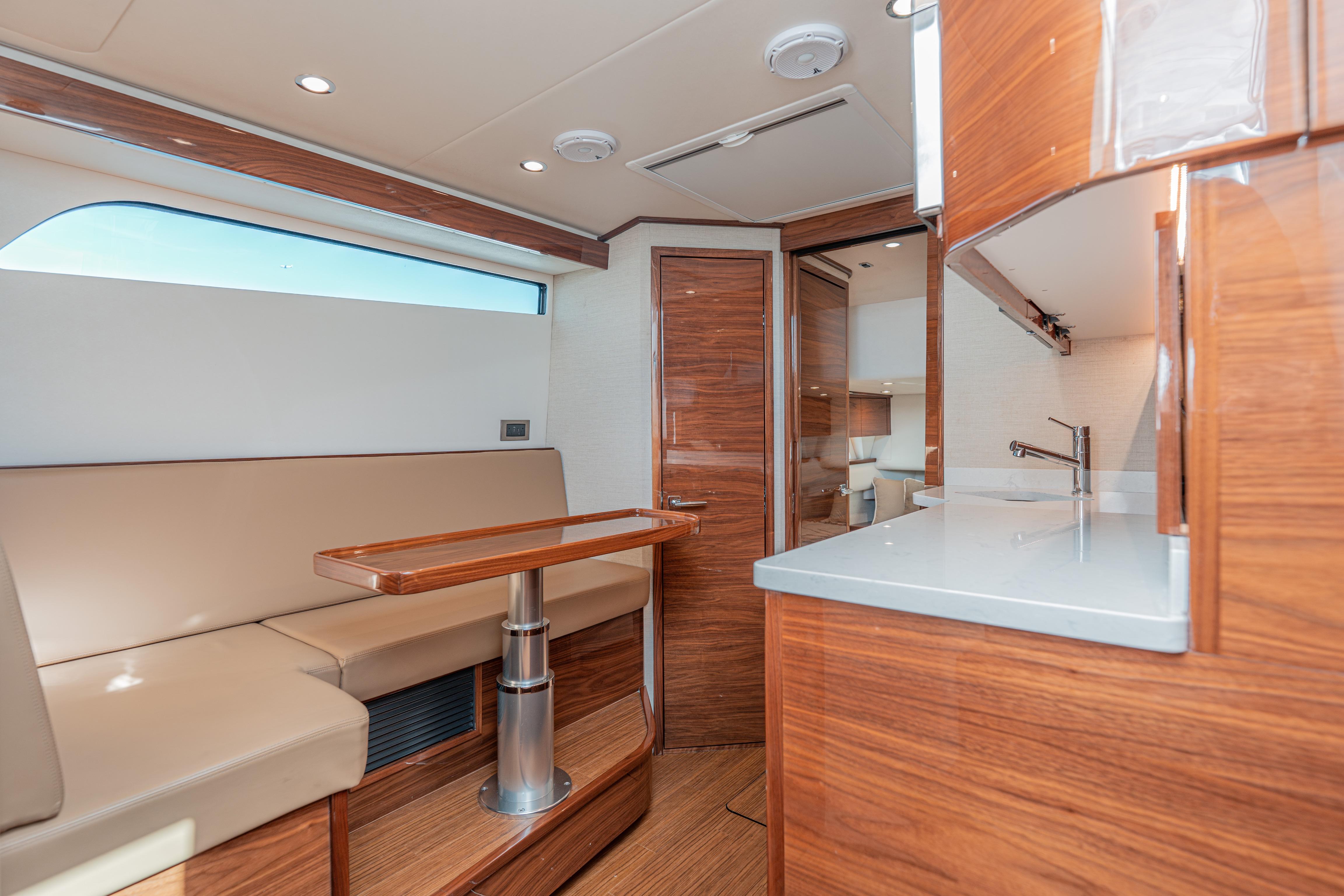 - Forward facing U-shaped lounge and table aft of helm station