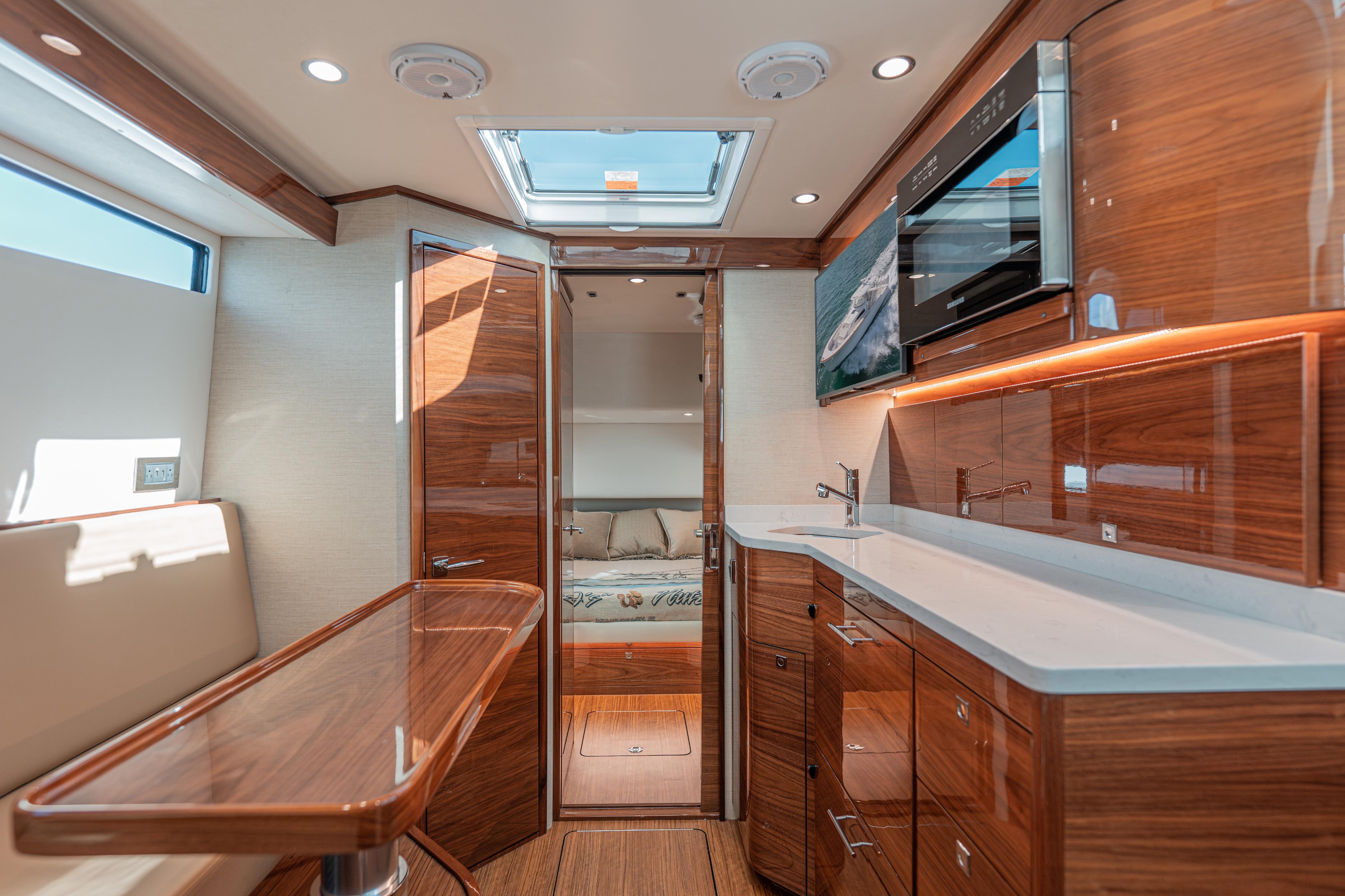 The V-55 stands out with true yacht-level comfort—a spacious salon with premium finishes, full galley, private stateroom, and an enclosed head with separate shower. Perfect for extended trips without sacrificing comfort.