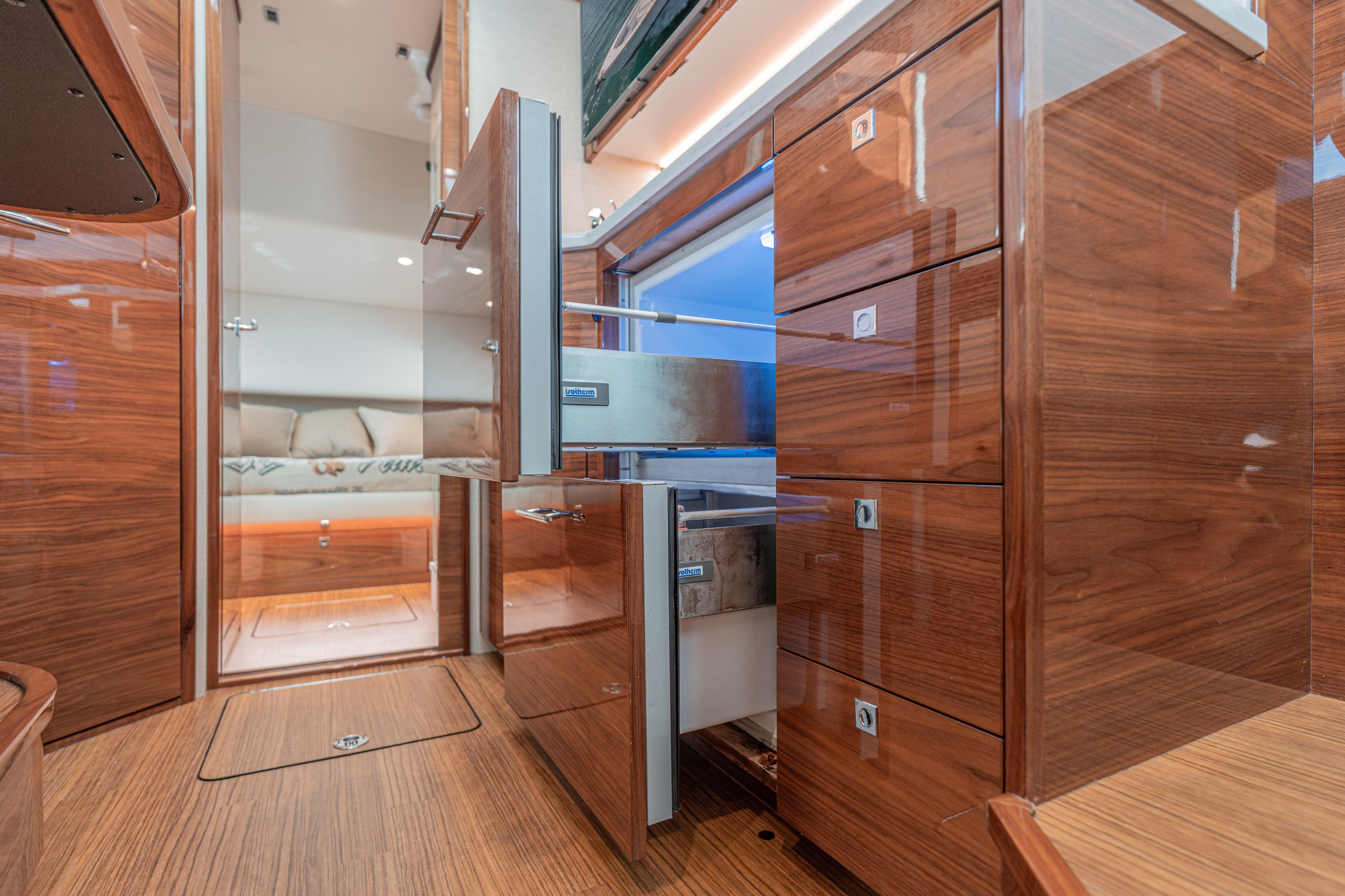 - Full galley: Invisacook two-burner induction cooktop integrated into quartz counter, stainless steel sink, refrigerator/freezer, microwave/convection oven, storage, and HDTV