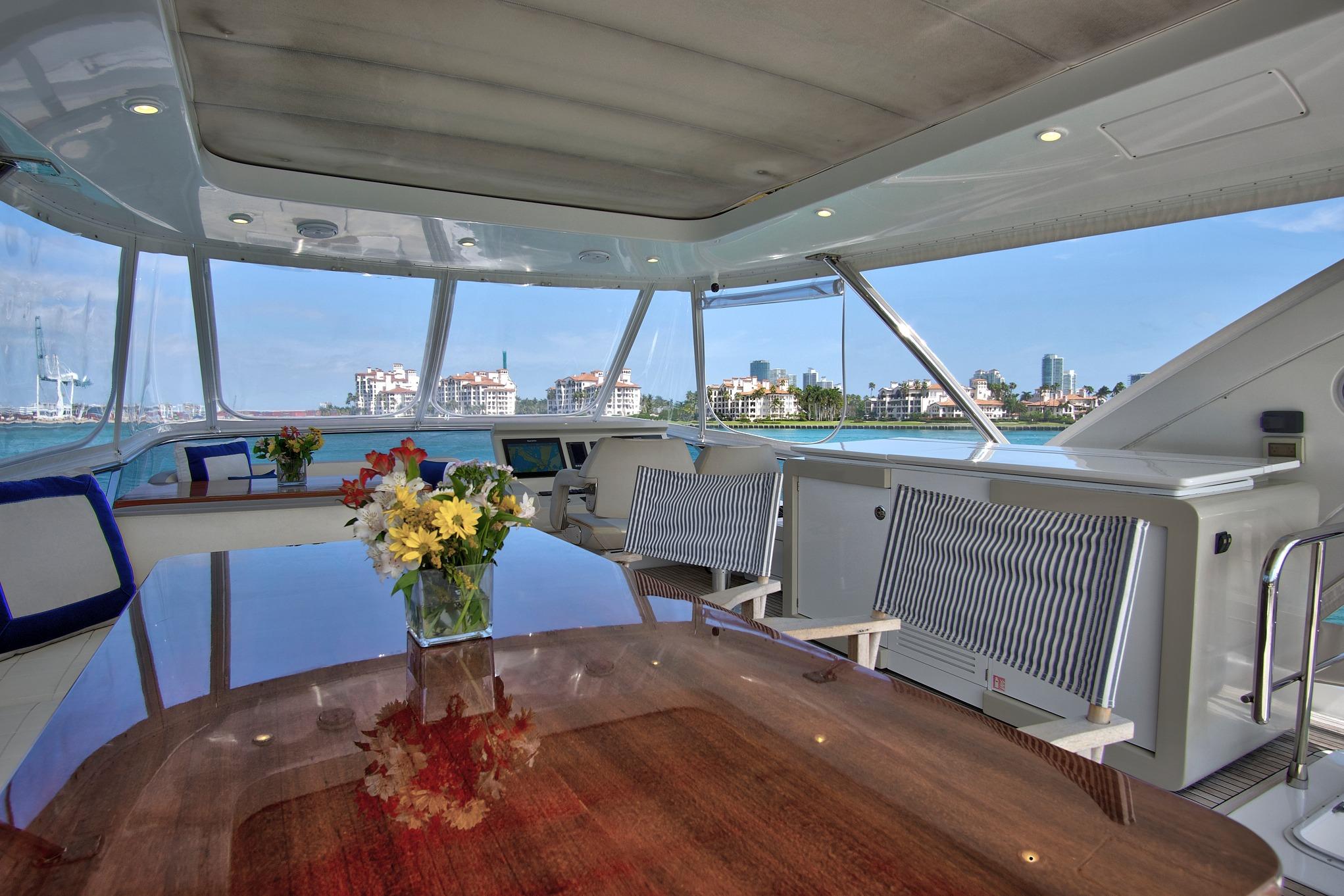 The flybridge is a standout space—large, open, and fully equipped for everything from casual lounging to elegant dining. Amenities include a retractable sunroof, surround-sound stereo system, overhead and floor lighting, multiple seating zones, a high-gloss dining table for eight, a forward seating area with an additional dining table, and a complete wet bar with sink, refrigerator, ice maker, and Kenyon grill/cooktop. A custom removable Isinglass enclosure ensures comfort in both sunny and inclement weather.