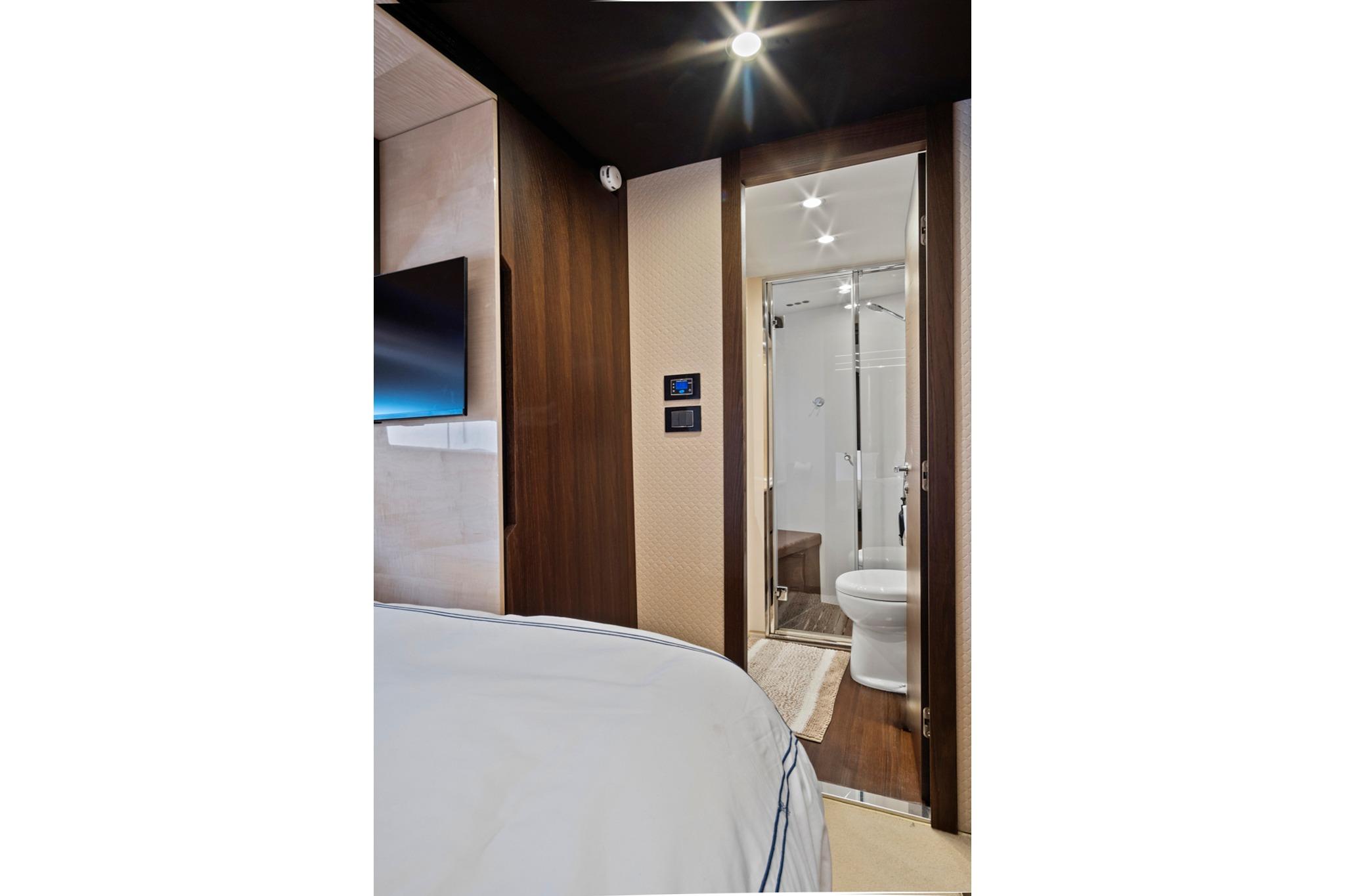 - Master stateroom with king bed, mirrored front TV and seating area with table