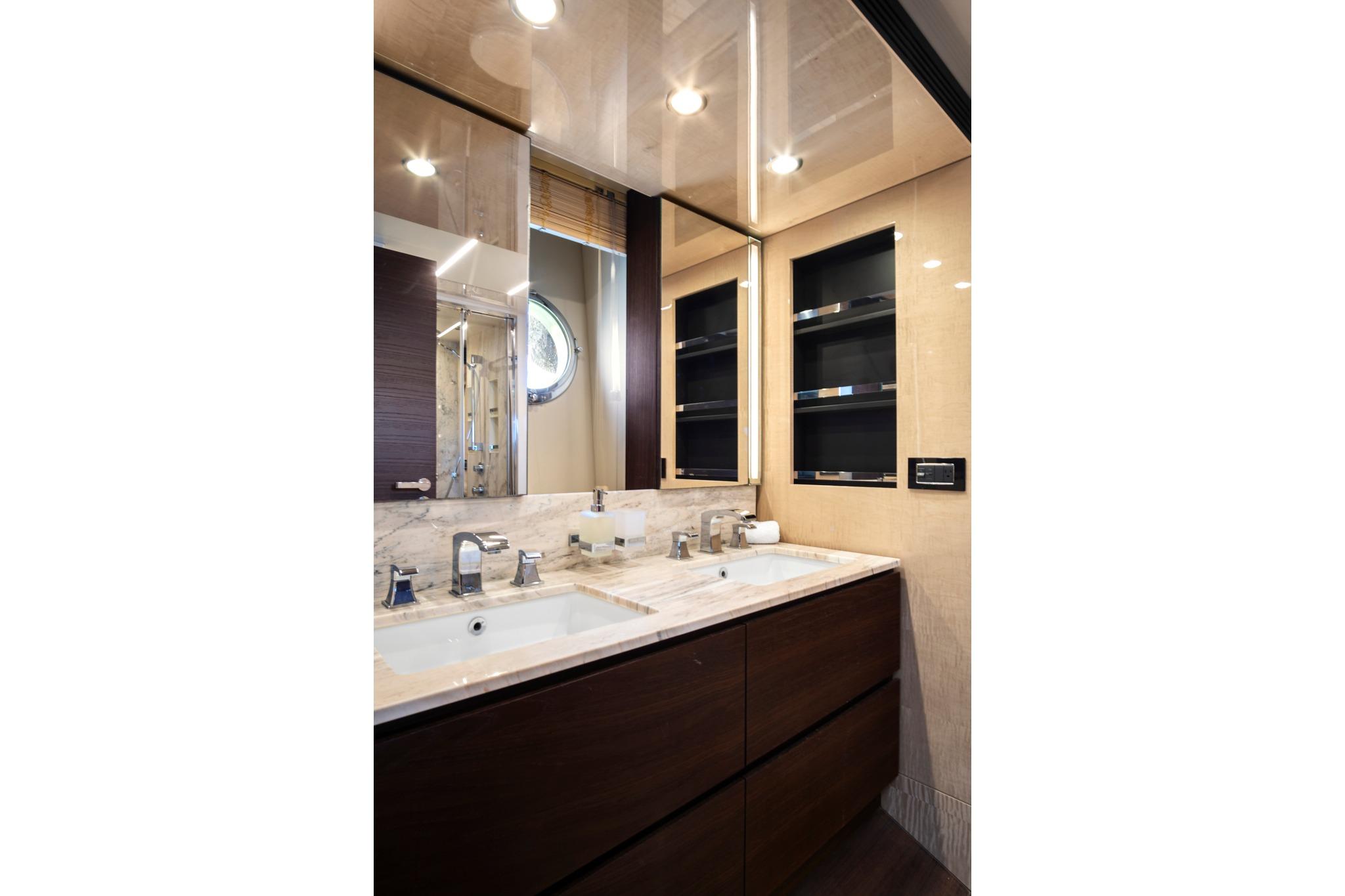 The full-beam master stateroom, located aft, is elegantly appointed in soft ivory tones with rich wood accents. It includes a king-size bed, built-in dresser, full-length mirrored closet, large windows, a semi-transparent mirror TV, nightstands, reading lights, seating area with table, plush carpeting, and an ensuite bath featuring double sinks, marble counters, a glass walk-in shower, porthole window, mirrored storage cabinets, and additional under-sink storage.