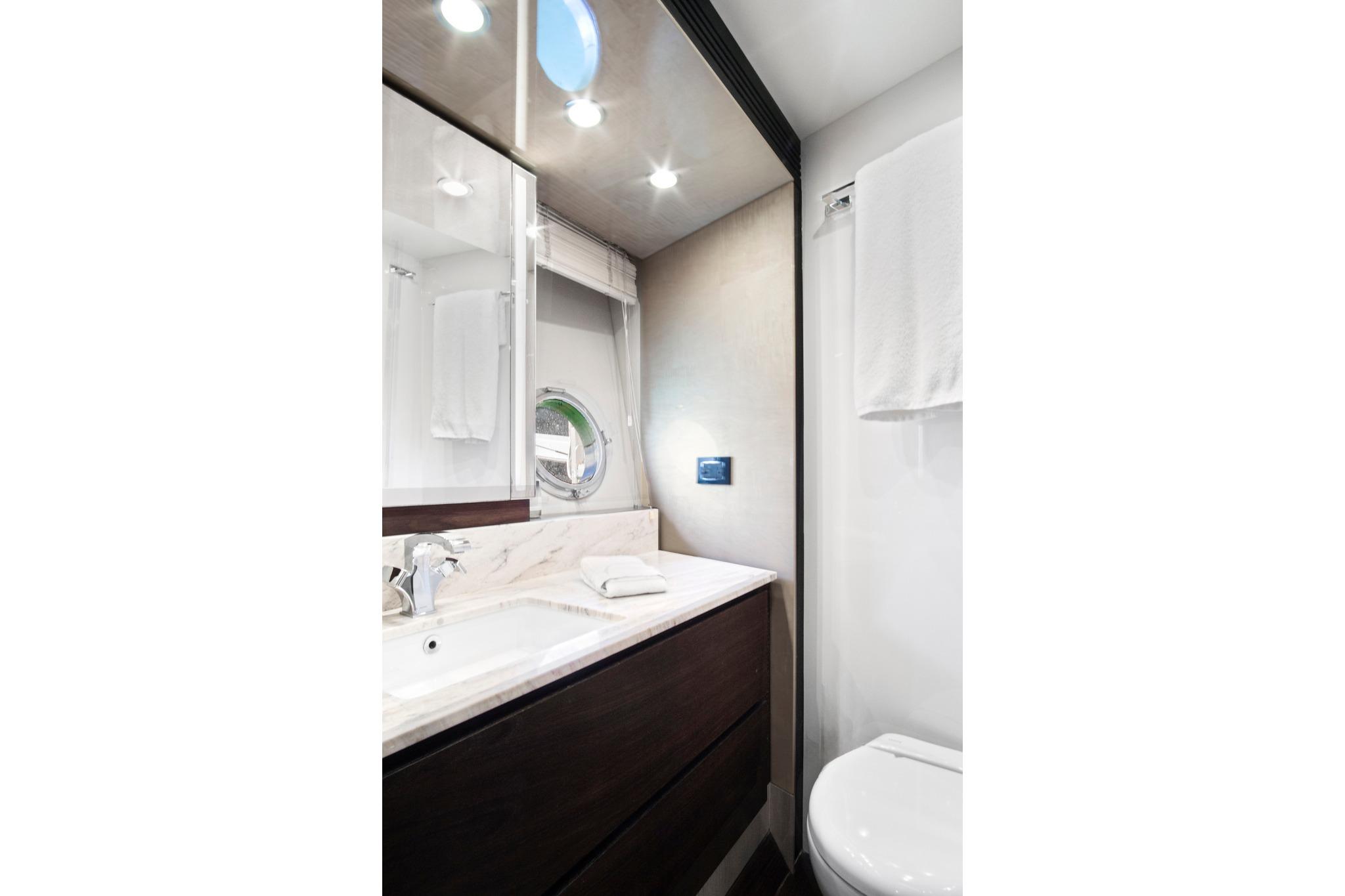 The yacht is fully outfitted for extended cruising, featuring a water maker, hydraulic swim platform, and an expansive flybridge designed for relaxation and entertainment. Multiple seating, lounging, and dining options complement the vessel’s open, contemporary interior layout. The main level features an aft salon, center galley, dedicated dining area, forward interior helm, and below deck, a four-stateroom layout—each with its own ensuite bath. Crew quarters are accessed portside from the rear and include two berths and dedicated storage.