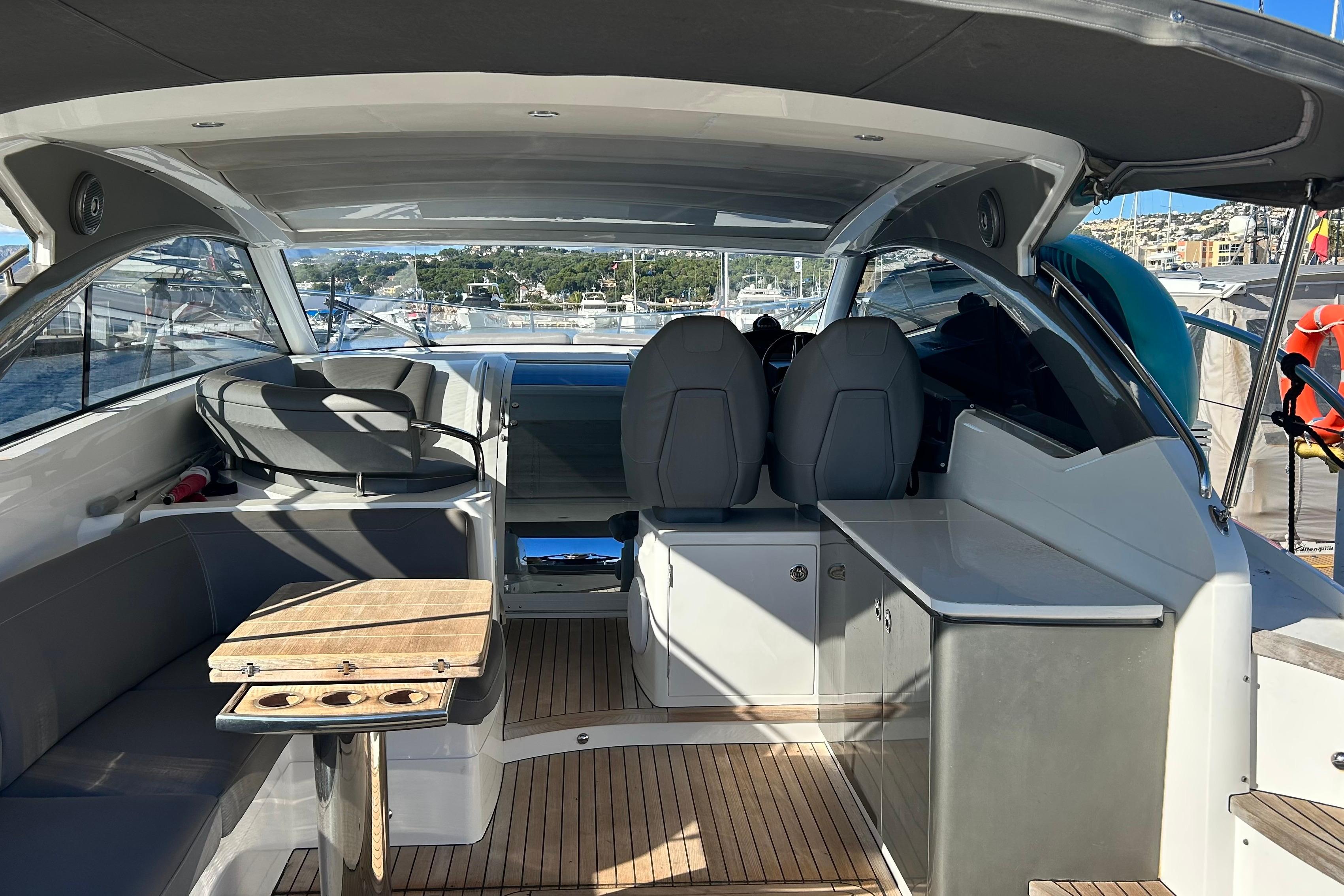 The new V40 quintessentially showcases the dynamic exterior, exceptional seakeeping and voluminous space of our V Class. Her port light windows cascade across the length of her deep-V hull, flooding the saloon and cabins with light. When entertaining, her spacious cockpit enjoys a beautiful teak table and well-equipped wetbar in a striking oyster grey with an option to specify a convertible sunbed aft.