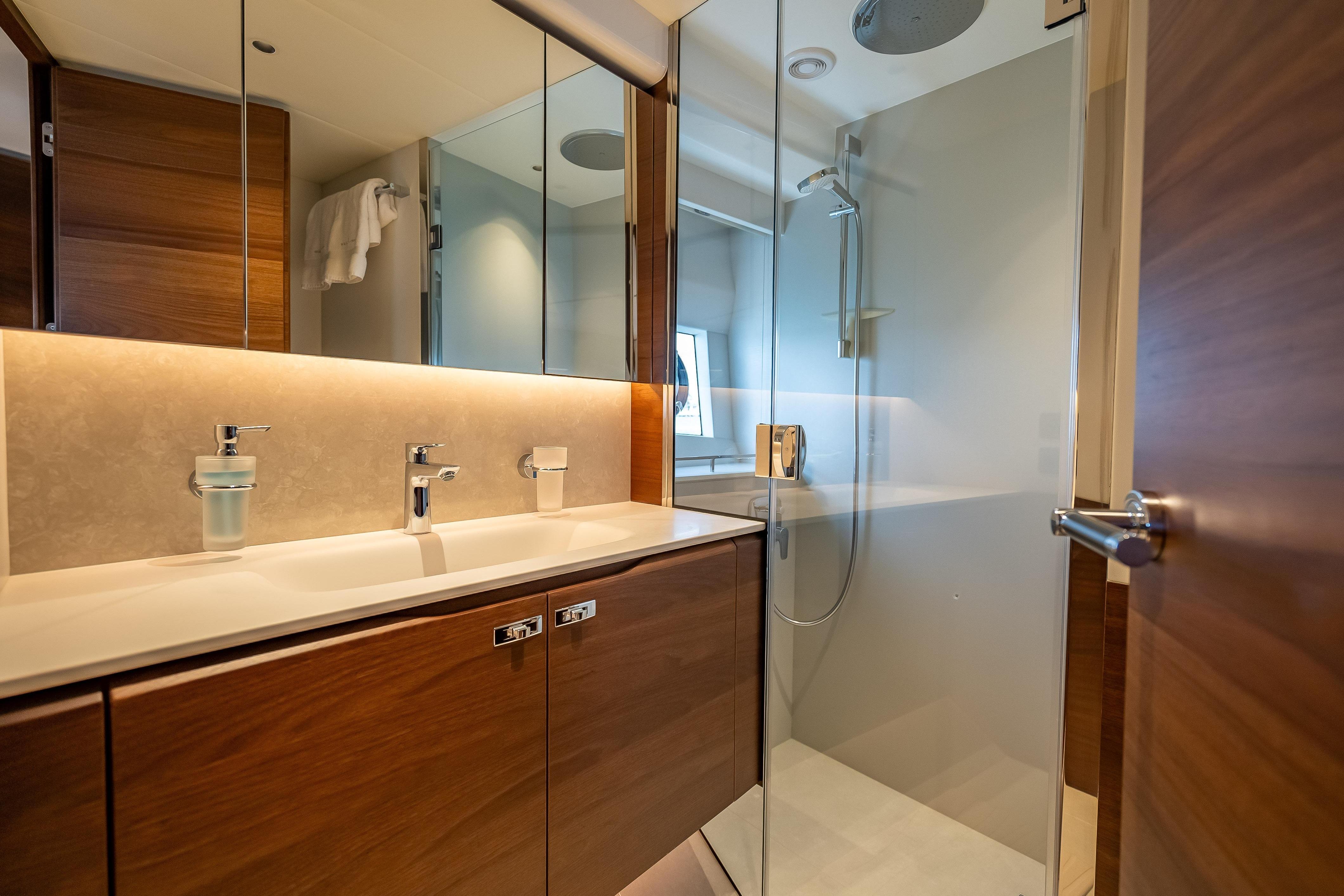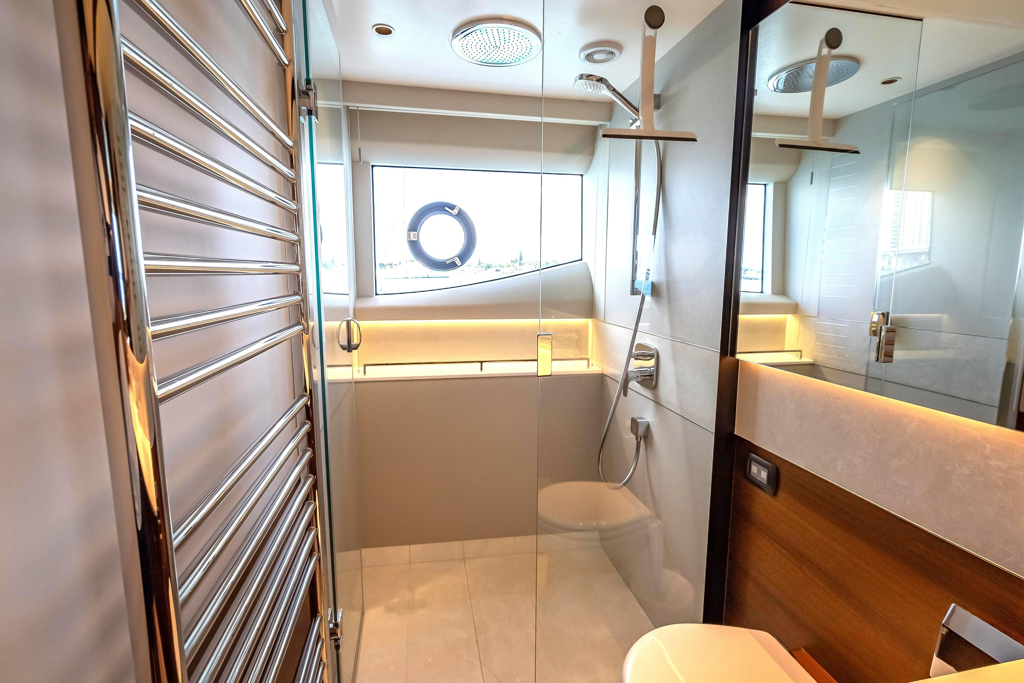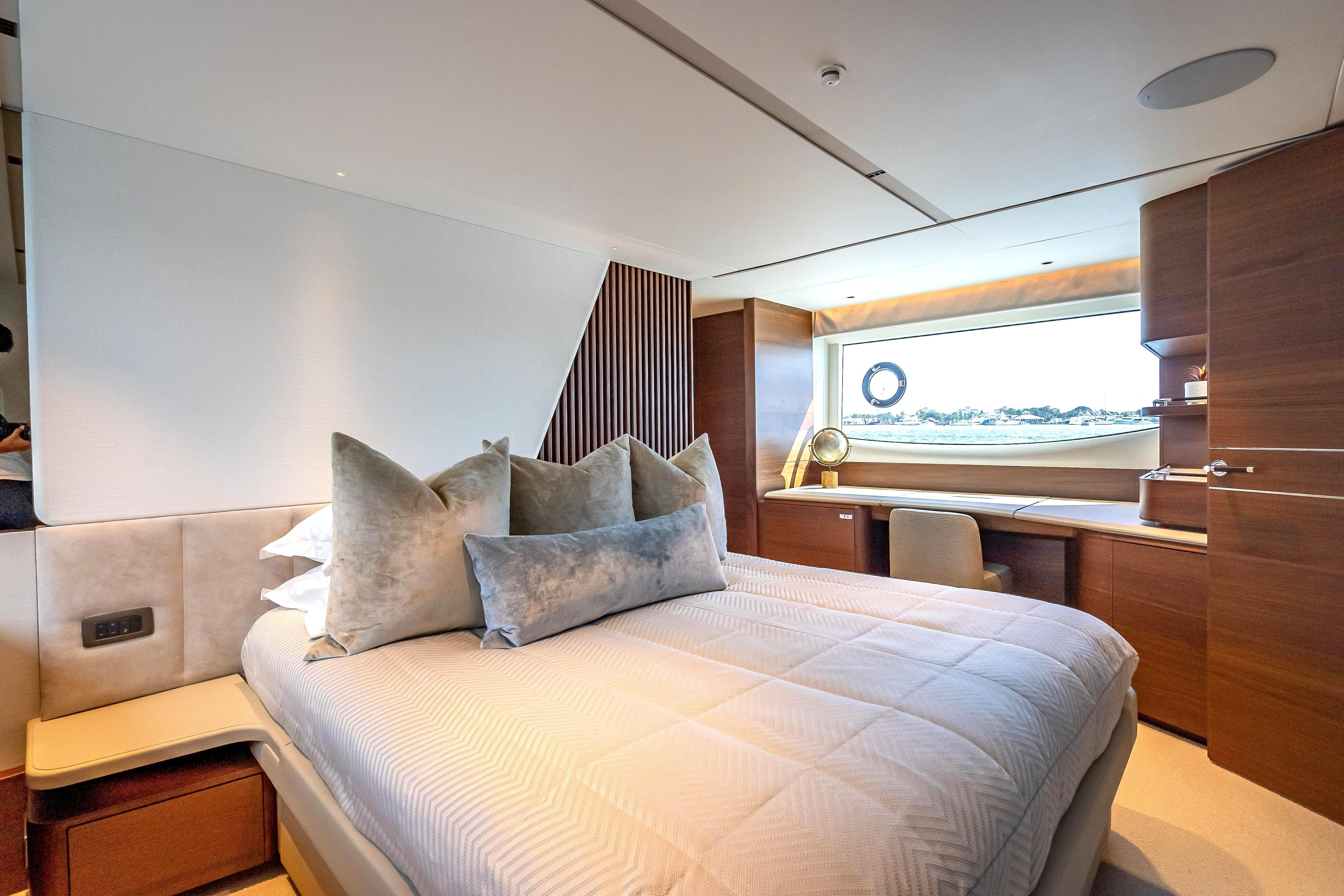 Inside, the yacht features the Walnut Satin interior, upgraded flooring, NAIM premium audio throughout, custom furnishings, electric blinds, heated master head floor, a convertible port guest stateroom, upgraded Wolf appliances, and a custom enhanced crew layout with additional refrigeration and a crew Garmin display.