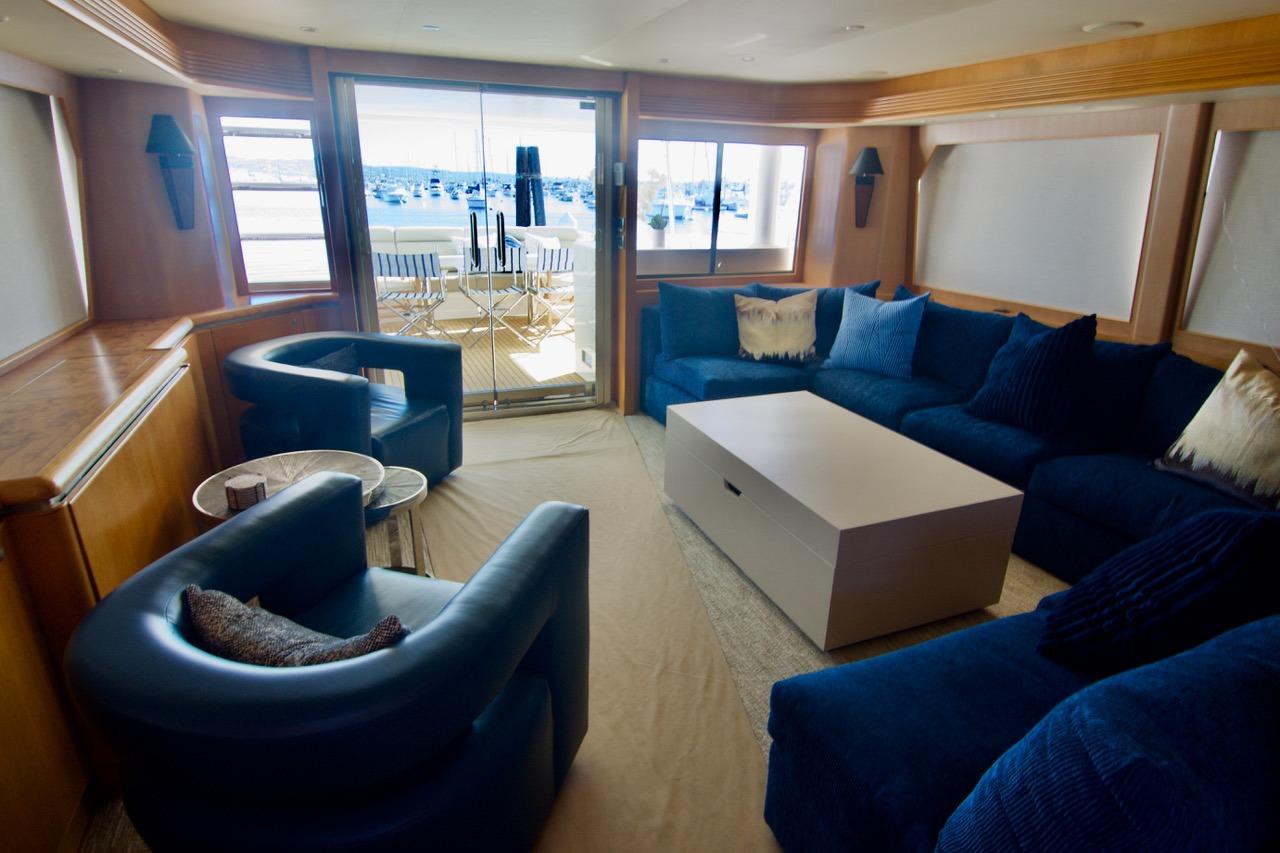 Going forward from the Cal Deck through 2 large glass and stainless locking doors you enter the large main salon. This area is well laid out with a very large seating area to port and 2 swivel chairs on the right side. Large low-profile windows each side and aft for excellent viewing.