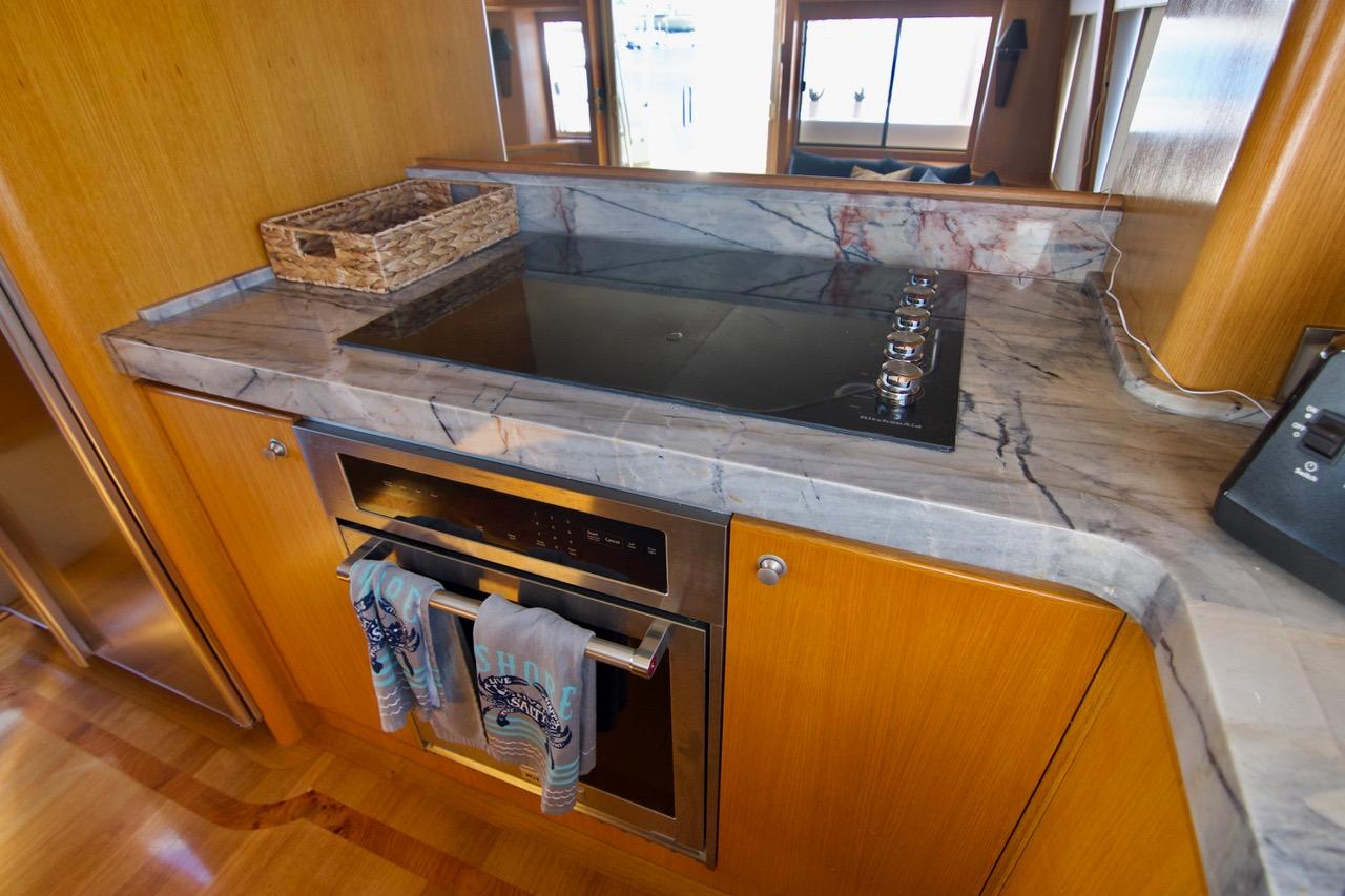 Going up 2 steps you enter into the galley and pilot house area. The full-service U-shaped galley is to port with full wrap around granite counter space with ample storage lockers above, under the counter and across to the starboard side. Large windows all around and the pass through to the pilot house seating/dining area as well as aft to the main salon. Any chef would be pleased with this excellent galley.