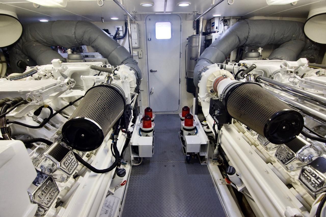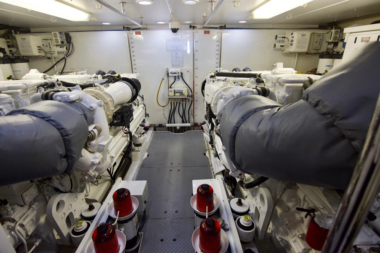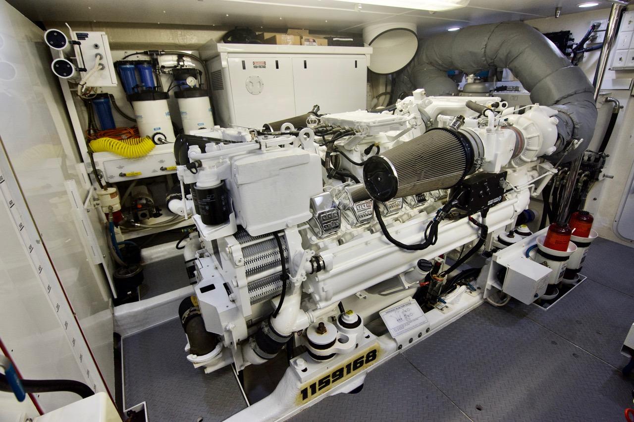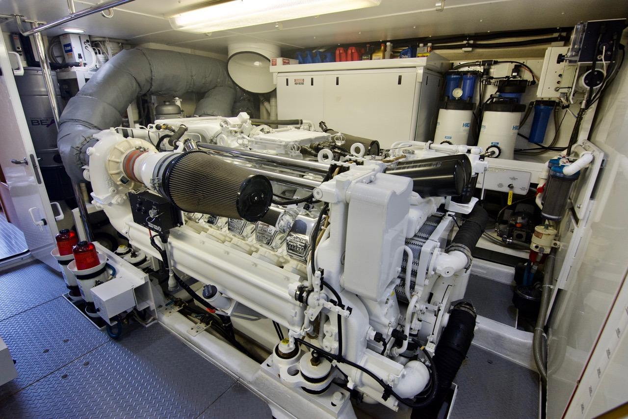 Her fully walk-in walk-in engine room with water tight door has twin Turbocharged, aftercooled MTU 1350HP Diesel engines giving a top speed of 21 knots. Coupled with 2700 Gallons of fuel gives her an extended cruising range of close to 2000 miles at reduced speeds.