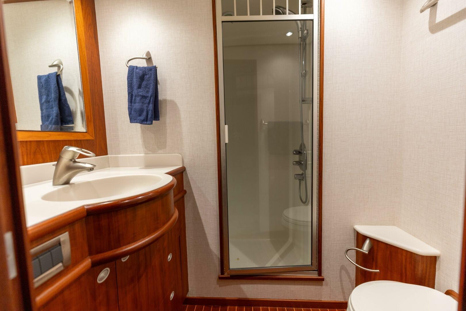 This Stateroom is a mirror image of the Aft Guest Stateroom. This head is a Jack & Jill style head, which shares the Aft and Forward Bunk rooms. This full head & shower area is quite large, offering a great shower and ample storage for guests.