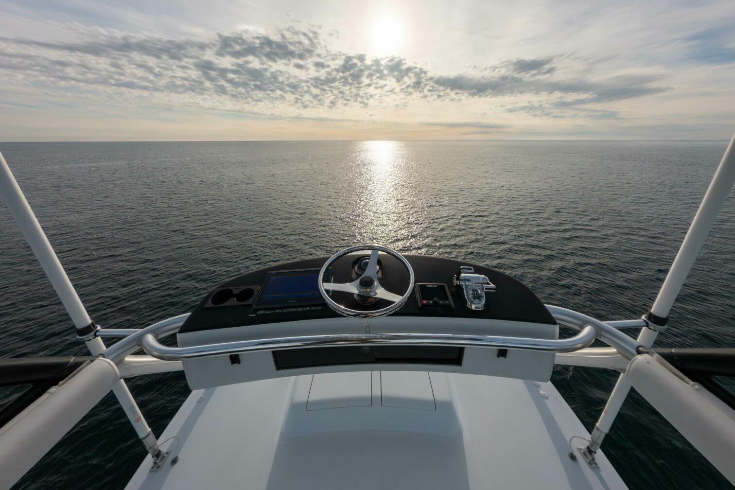 Extremely well-planned cockpit. Firstly, the Mezzanine area offers lots of comfortable seating, which is also air-conditioned. Under the seating area, you’ll find the massive custom Stainless-steel freezer. The Mezzanine step includes huge storage, additional refrigeration, and a drink box, along with tackle storage. This area also houses a very large Fish Box, Live Wells, and a Freeman hatch for the Quick Gyro.