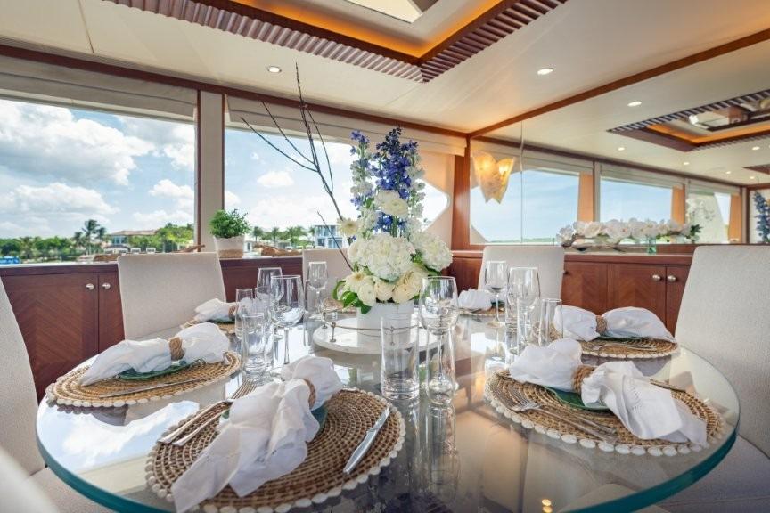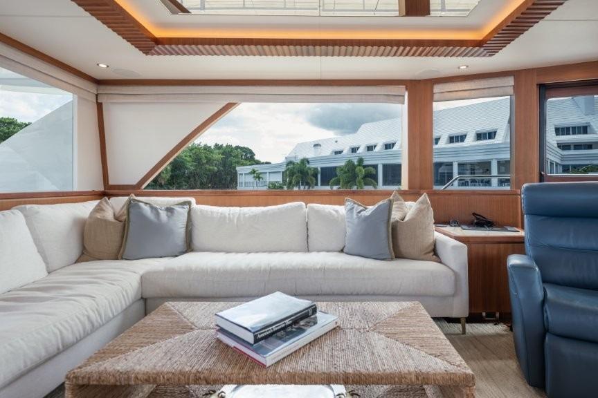Enlarged windows in salon with custom engineered solution incorporation marine grade aluminum beams allowing for industry leading window expanse. A/C outlet from ceiling, provides unobstructed view to outside (Design cues from 135) - Sylomer floating floor