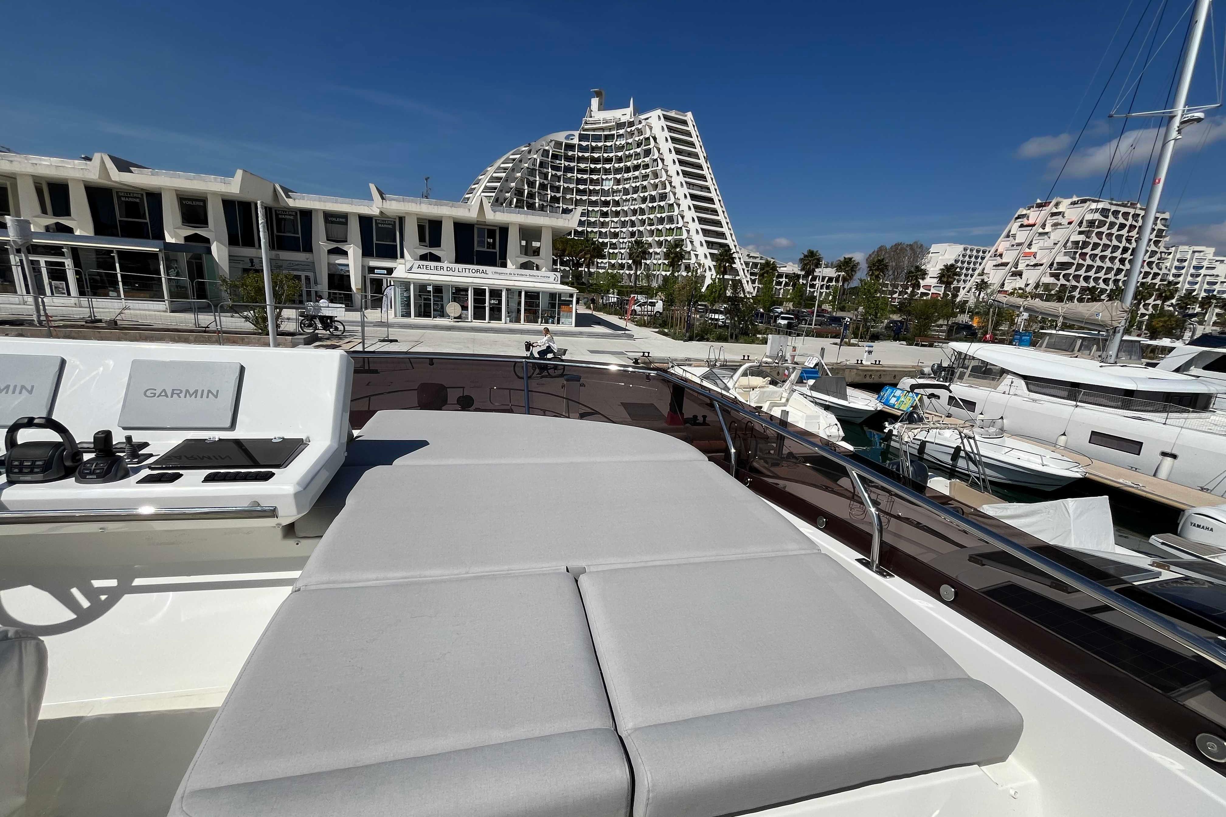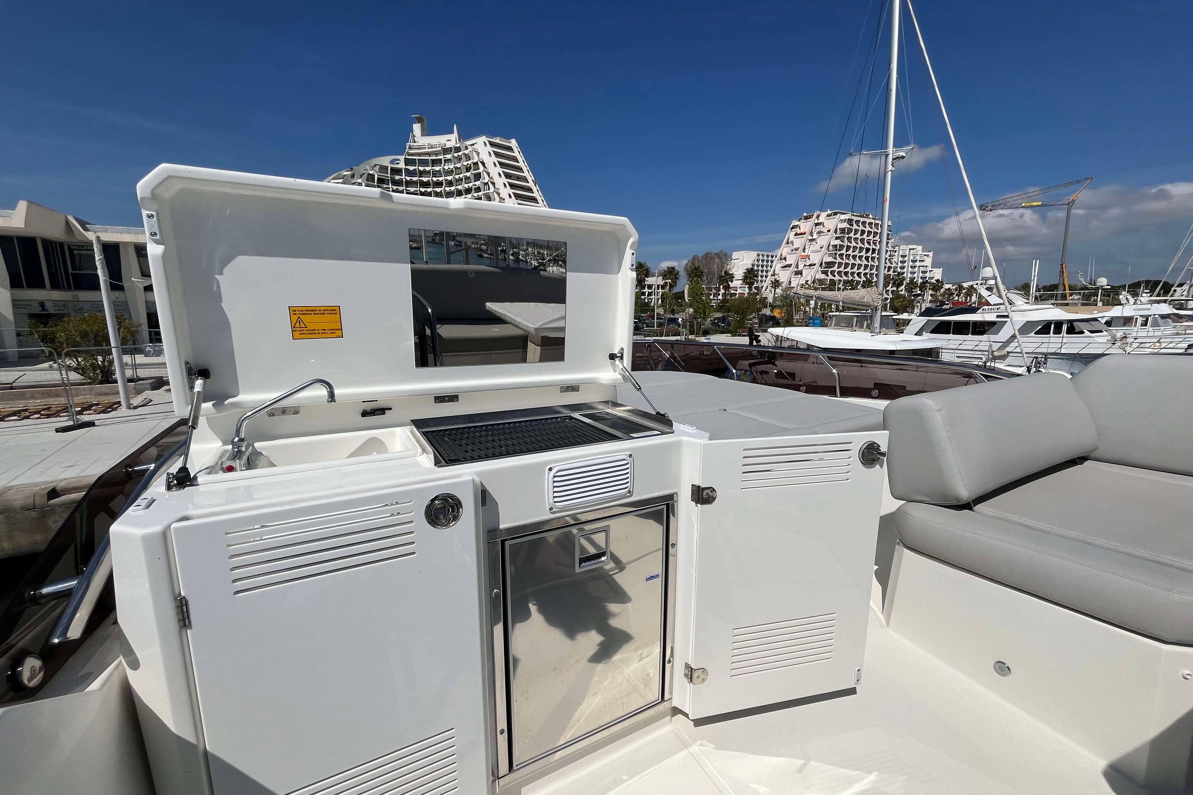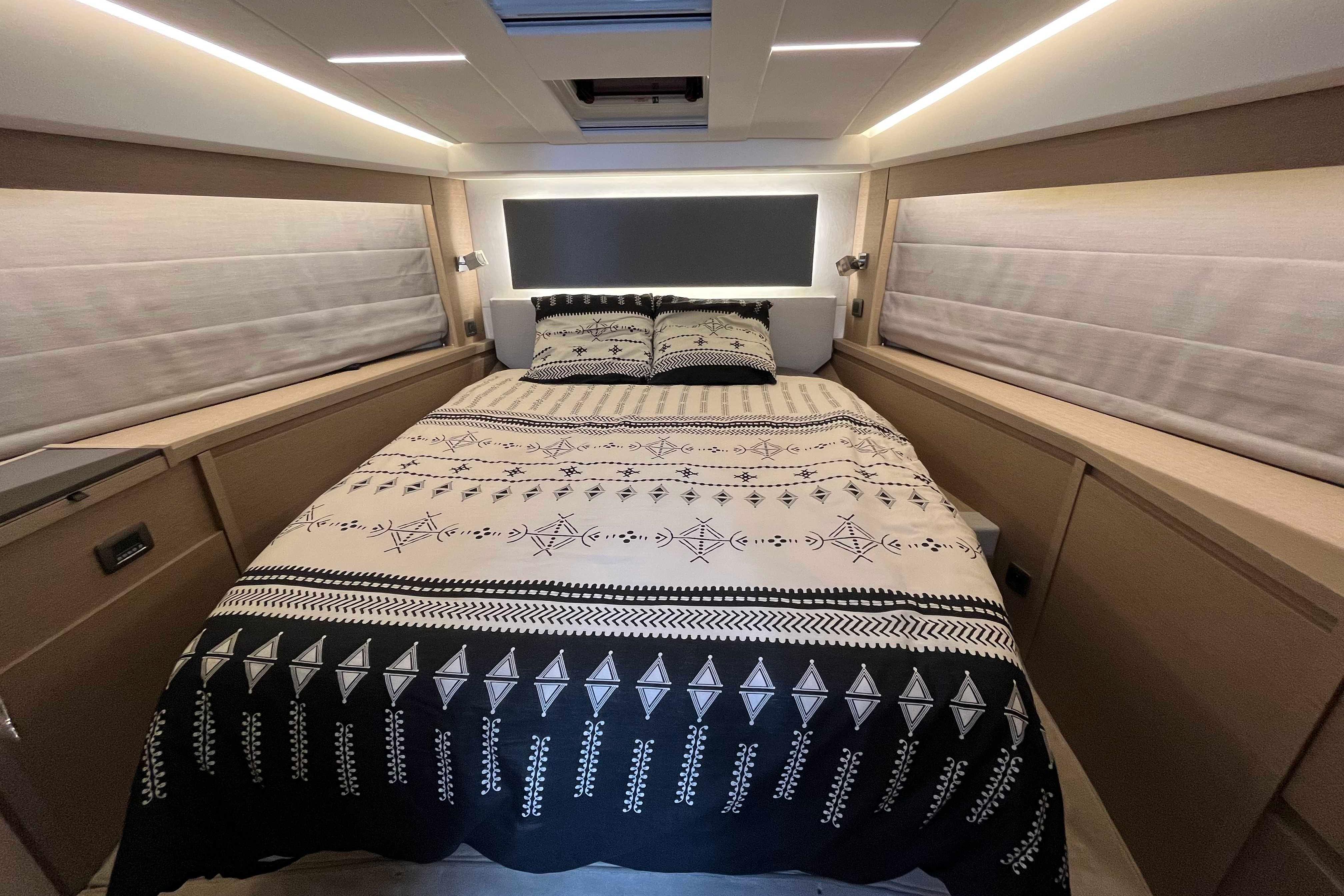 Life on board is easy, enhanced by numerous clever details. Conducive to relaxation, the L-shaped saloon includes an immense integrated storage locker. Intensely bright, the inviting saloon evokes a sense of well-being. Facing sofas and a modular cockpit bench seat, which can pivot to face the saloon, create the perfect space for entertaining.