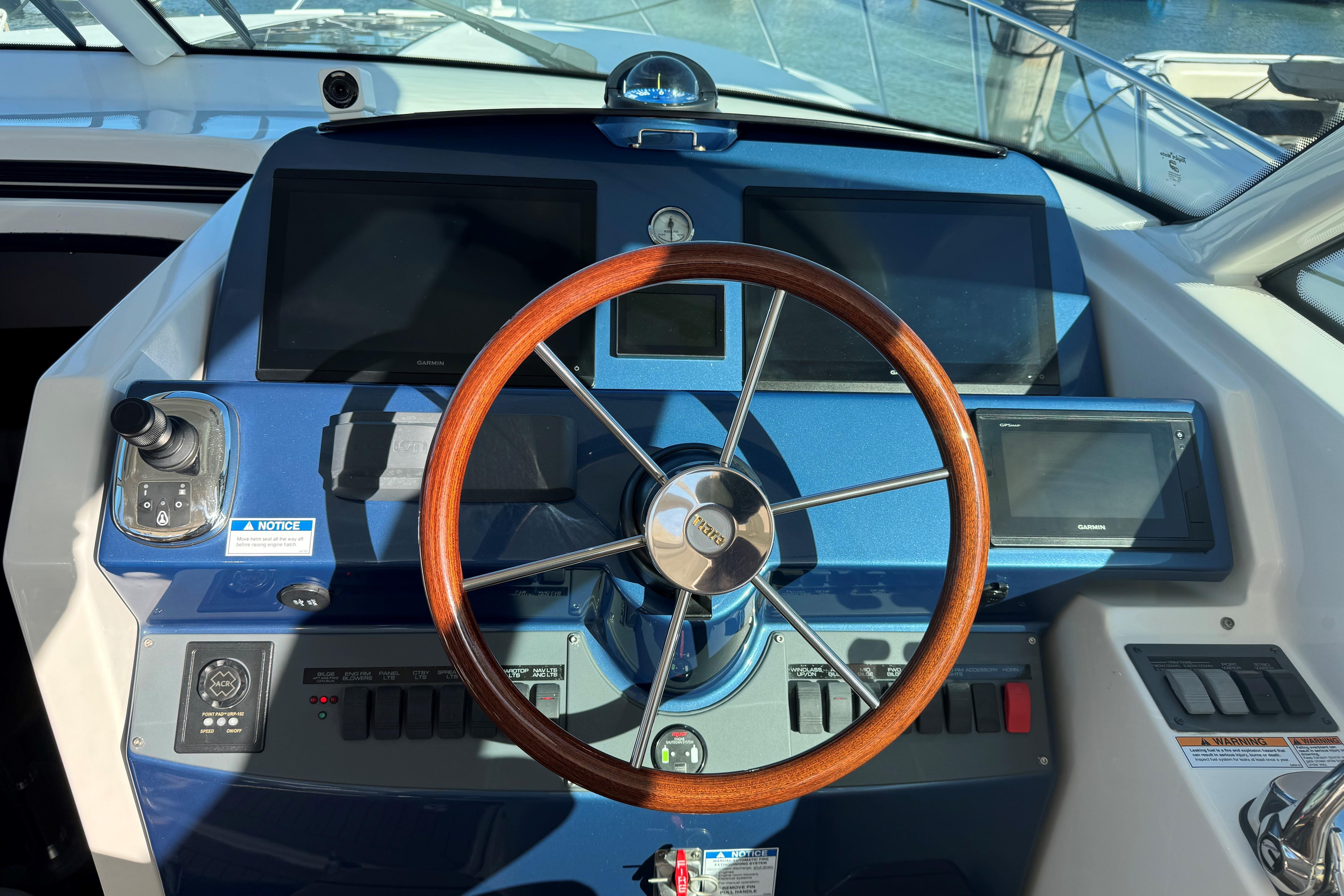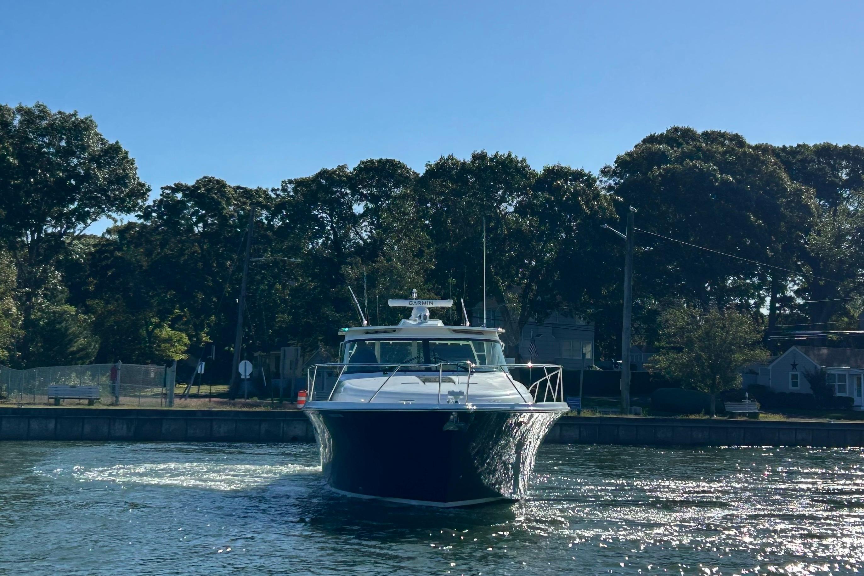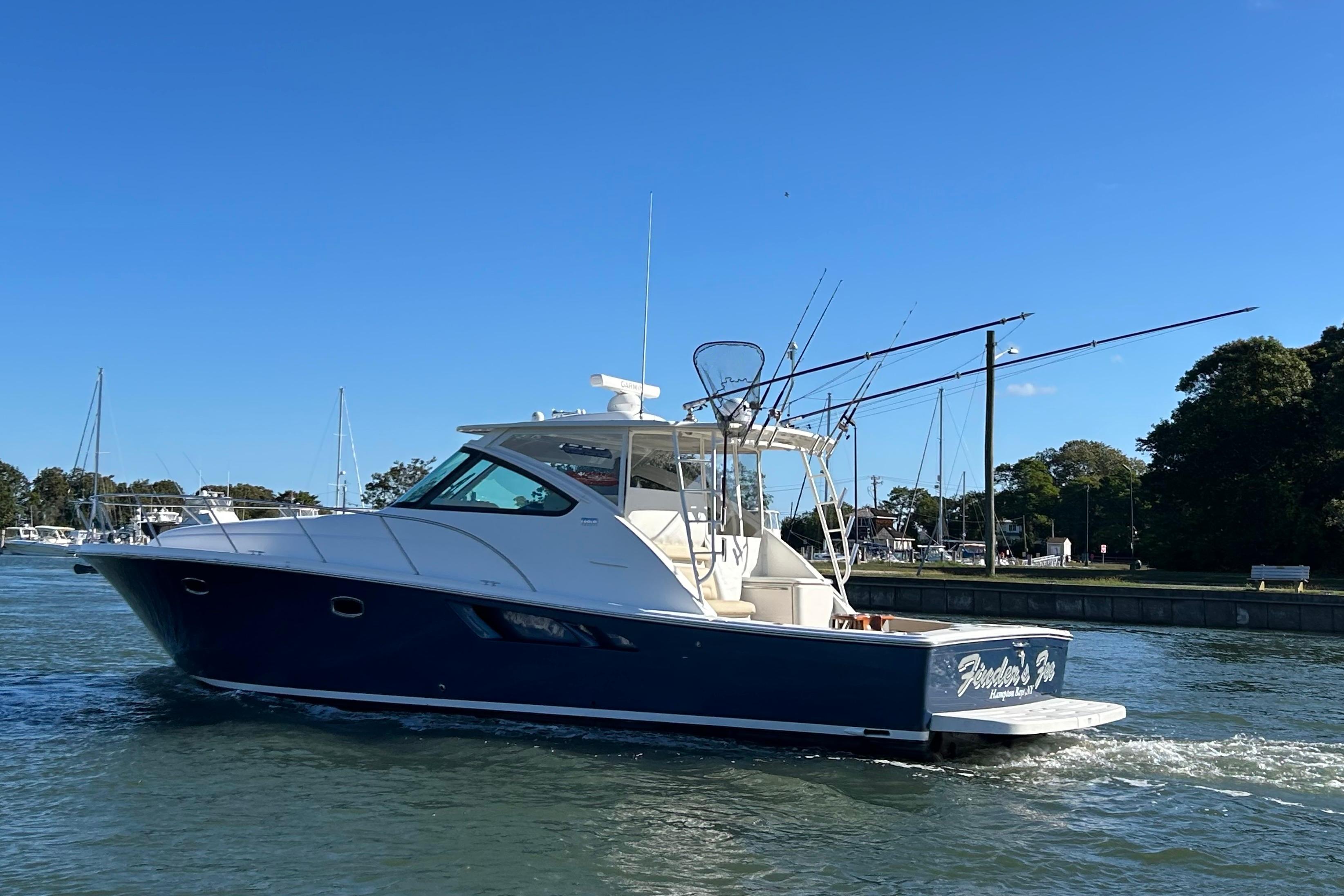 FEATURES: Lauderdale Blue painted hull, White w/ SS rubrail, Seakeeper SK6 gyro, Cummins Onan 11.5 kw diesel generator, (4) underwater lights(RGBW), Lenco electric 12V hydraulic recessed trim tabs, 24V bow thruster & trolling valves, 50 amp 65’ Glendinning power cord w/ adaptor for 30 amp service, 80 amp battery charger, 30” swim platform w/ built in ladder, molded in transom door & gate, LOWER COCKPIT-hot & cold cockpit shower, port aft additional raw water washdown, freshwater washdown, raw water washdown, 50 gallon transom baitwell, Teak battle saddle, port insulated flush floor storage box w/ Dometic ice making system & macerator, stbd insulated flush floor storage boxes w/ freezer plate & macerator, Dometic water maker, cockpit coaming bolsters, (6) gunnel mounted rod holders, cockpit LED courtesy lighting, port & stbd molded-in steps to deck walkways, HARDTOP- Tournament style w/ LED spreader lights & underside lighting, upgraded Gem Lux Blue water base w/ Gem Lux Carbon 18’ outriggers, Tiara Composite windshield frame w/ tempered safety glass & wiper system w/ two washers / wipers, UPPER COCKPIT- drop down engine room access hatch, port aft-facing mezzanine seat w/ cooler under seat & storage under step, stbd aft prep center w/ custom cutting board, grill & (2) drawer tackle locker, wet bar w/ sink w/ refrigerator door, rotating Stidd helm seat electrically actuated fore, aft & vertically, Mahogany steering wheel, 32,000 BTU air conditioning / heat, Ritchie Compass, port curved companion lounge w/ storage below & fwd facing swivel seat, Teak upper cockpit table, centerline entry to salon w/ acrylic locking door, SALON- (4) portlights, Teak companionway entry steps w/ hinged storage below, 12,000 BTU air conditioning / heat, solid Teak floor, U-shaped lounge / dinette seating to port w/ storage below & high-gloss teak table; converts to double lower berth w/ backrest converting to pullman, Dinette rod storage, 32” LED TV w/ HDMI port, soundbar w/ wireless subwoofer, BluRay player, central vacuum system, GALLEY-solid surface countertop, SS sink w/ solid surface cover & hot/cold faucet, under counter storage & aft galley pantry, two-burner electric cooktop w/ Corian cover, microwave/convection oven, Vitrigo dual refrigerator drawers & refrigerator/freezer drawer combination w/ ice maker, MASTER STATEROOM- bi-fold entry door, private entry to head, 10,000 BTU air conditioning / heat, manually actuated queen pedestal berth w/ rod storage below, cedar backed hanging locker, 24” LEDF TV, GUEST STATEROOM- entry from salon, upper & lower bunks, hanging locker w/ shelves, storage under lower berth, HEAD-full fiberglass head w/ glass shower door, stall shower w/ sump pump, drain & integrated seat, solid surface vanity countertop w/ sink & storage below, mirrored lighted medicine cabinet, Vacuflush toilet w/ macerator, FOREDECK- forward deck sun pad, fresh water at anchor locker, automatic all chain anchor windlass system w/ operation from foredeck foot pedal & remote switch at helm, molded-in fiberglass bow pulpit w/ SS roller, Delta 35 lb SS anchor